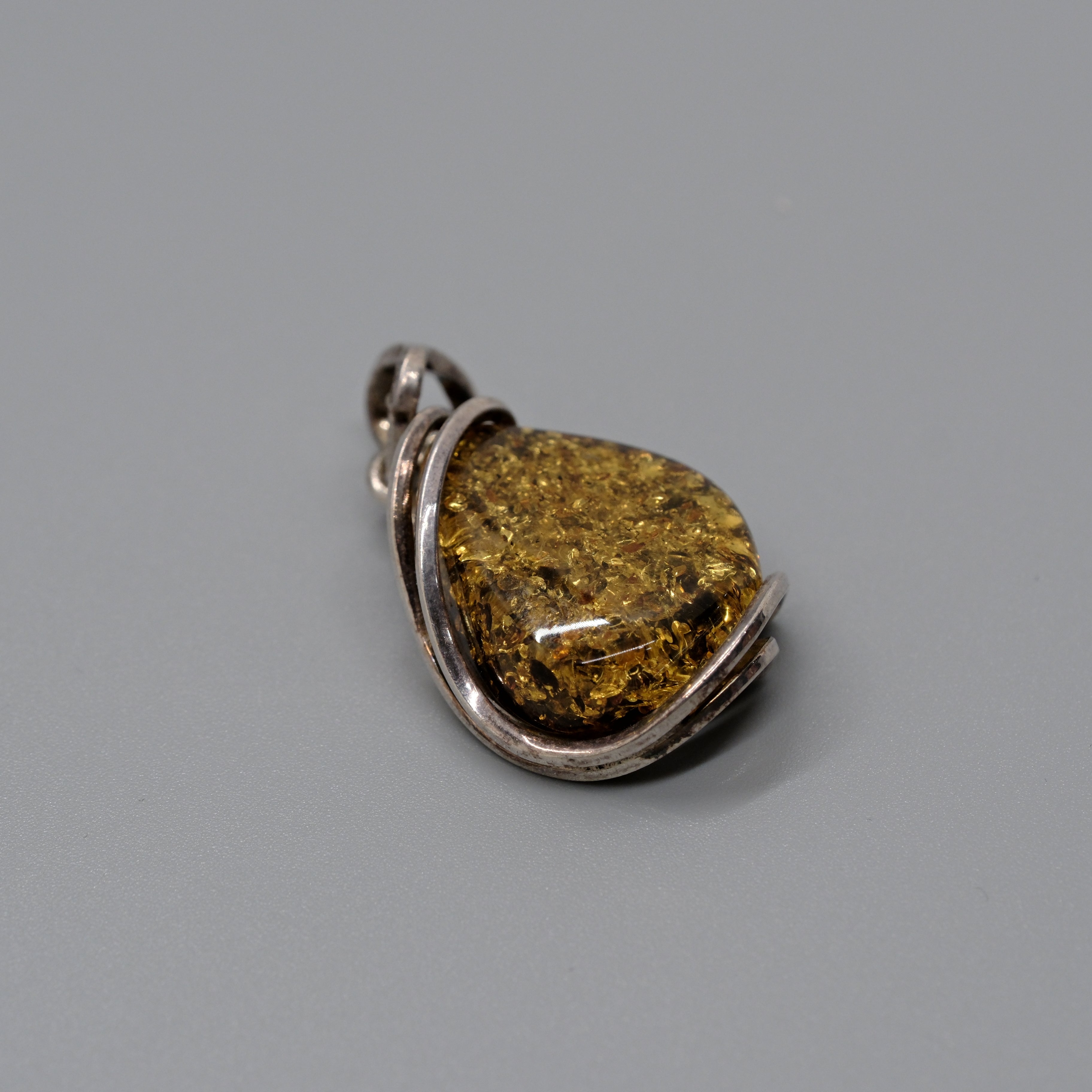 This one-of-a-kind amber pendant has a warm, earthy glow that feels both natural and timeless. The amber itself has rich golden-olive tones with beautiful organic inclusions, giving it that “little piece of nature” charm. It’s wrapped in an elegant sterling silver setting that flows gently around the stone, adding just the right touch of polish without taking away from its raw beauty.