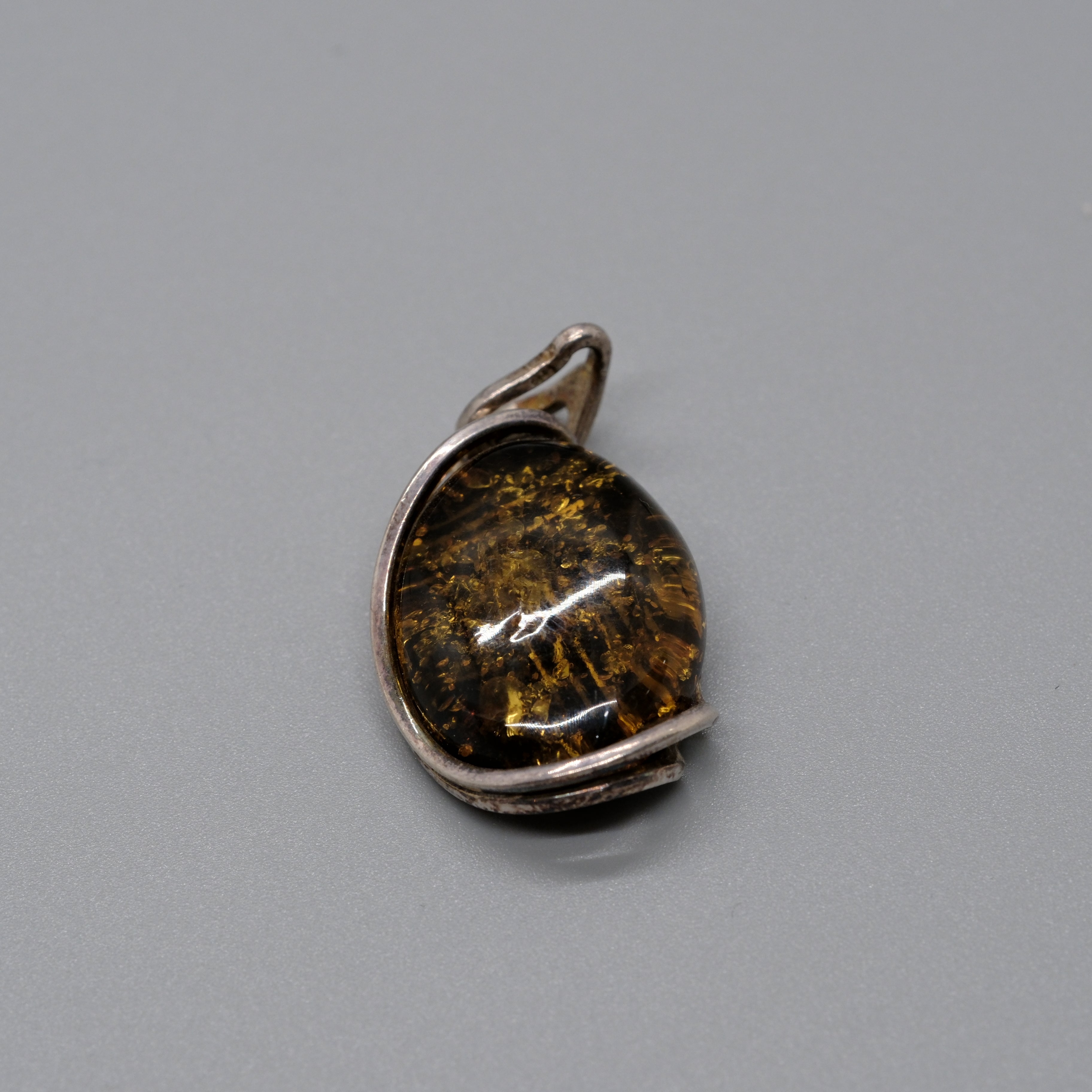 This one-of-a-kind pendant features a rich, dark amber stone with natural golden flecks that glow softly when the light hits it. The organic shape of the amber is wrapped in smooth sterling silver, giving the piece a handcrafted, earthy feel. It’s the kind of jewelry that feels personal the moment you pick it up, warm, grounding, and a little mysterious.