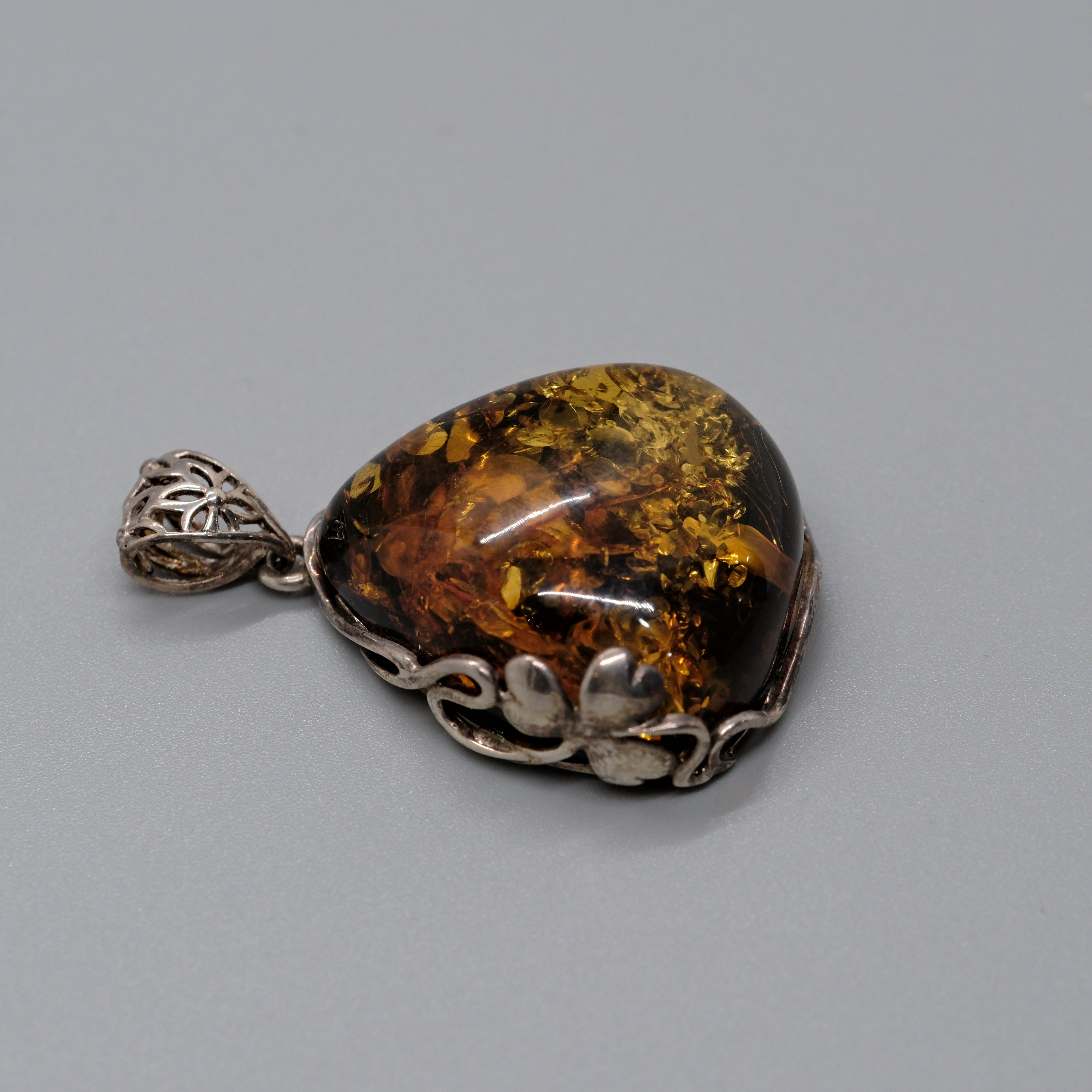 This one-of-a-kind pendant features a rich, dark Baltic amber cabochon full of natural golden inclusions that glow beautifully in the light. Set in an ornate sterling silver frame with delicate floral detailing, it has a warm, earthy elegance that feels both vintage and timeless. The filigree-style bail adds an extra touch of craftsmanship, making it easy to wear on your favorite chain. A perfect piece for anyone who loves meaningful, organic gemstones and distinctive silverwork.