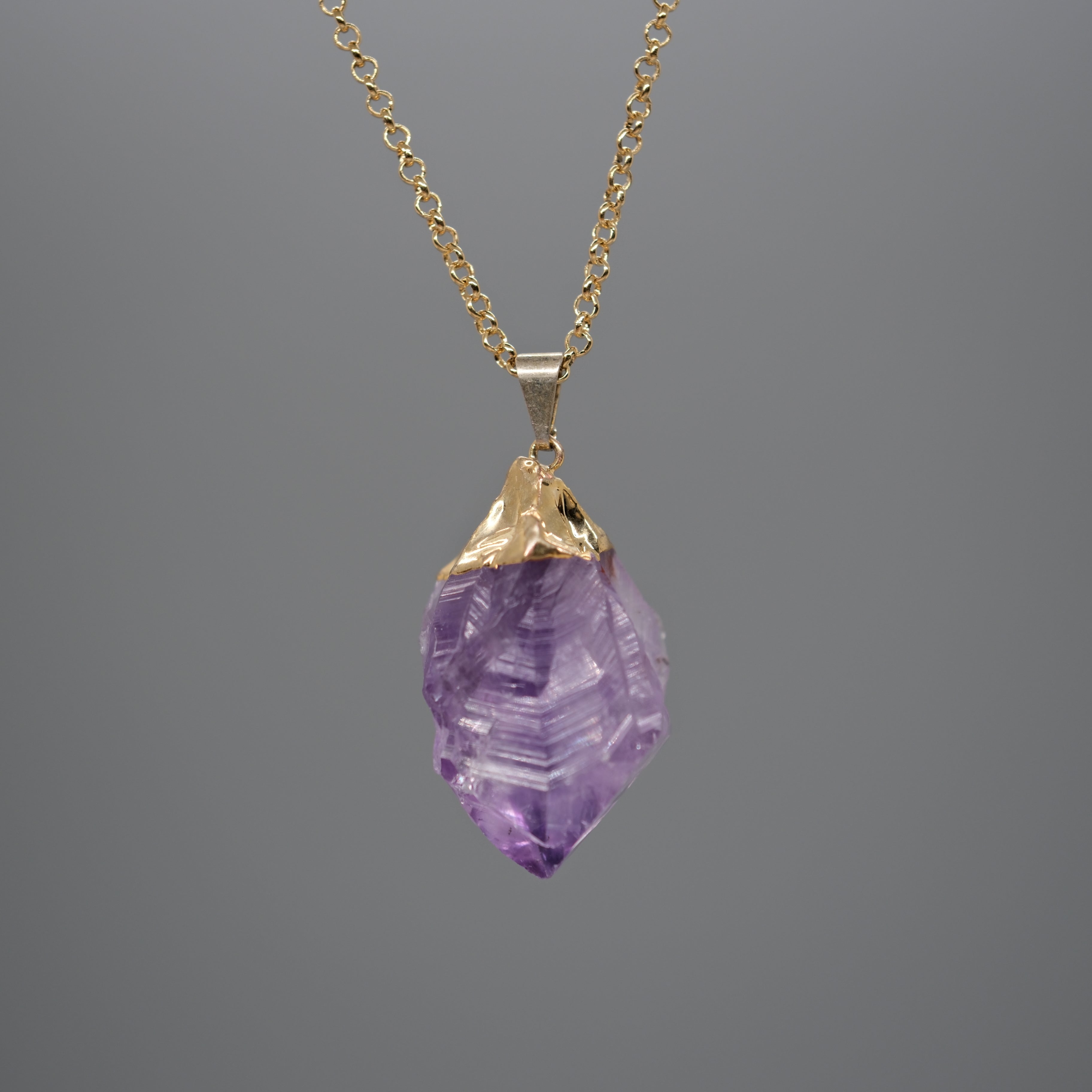 This radiant necklace showcases a raw amethyst crystal capped in 14k gold-filled detailing. Hanging from an 20” gold-filled chain, it exudes a balance of natural beauty and refined elegance.