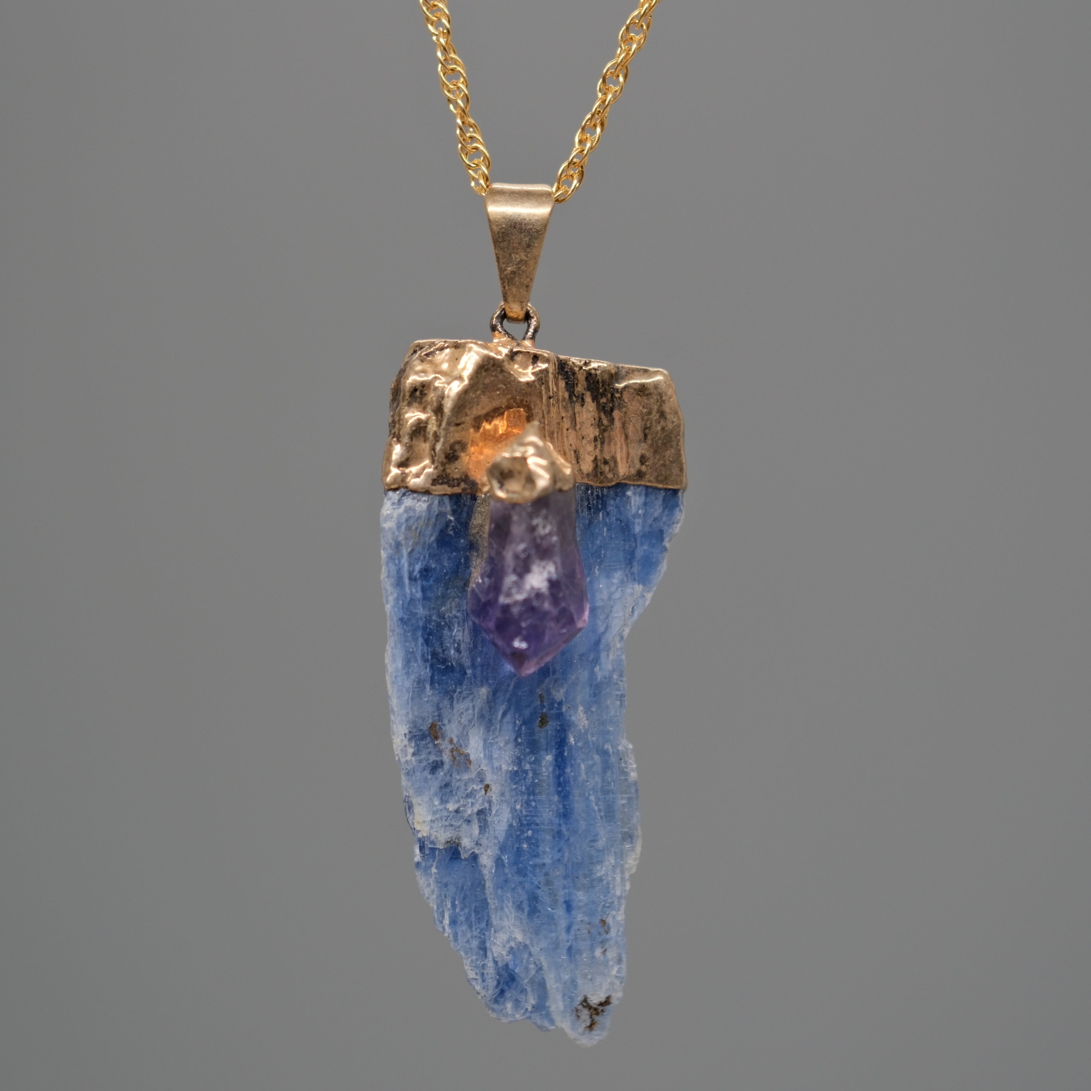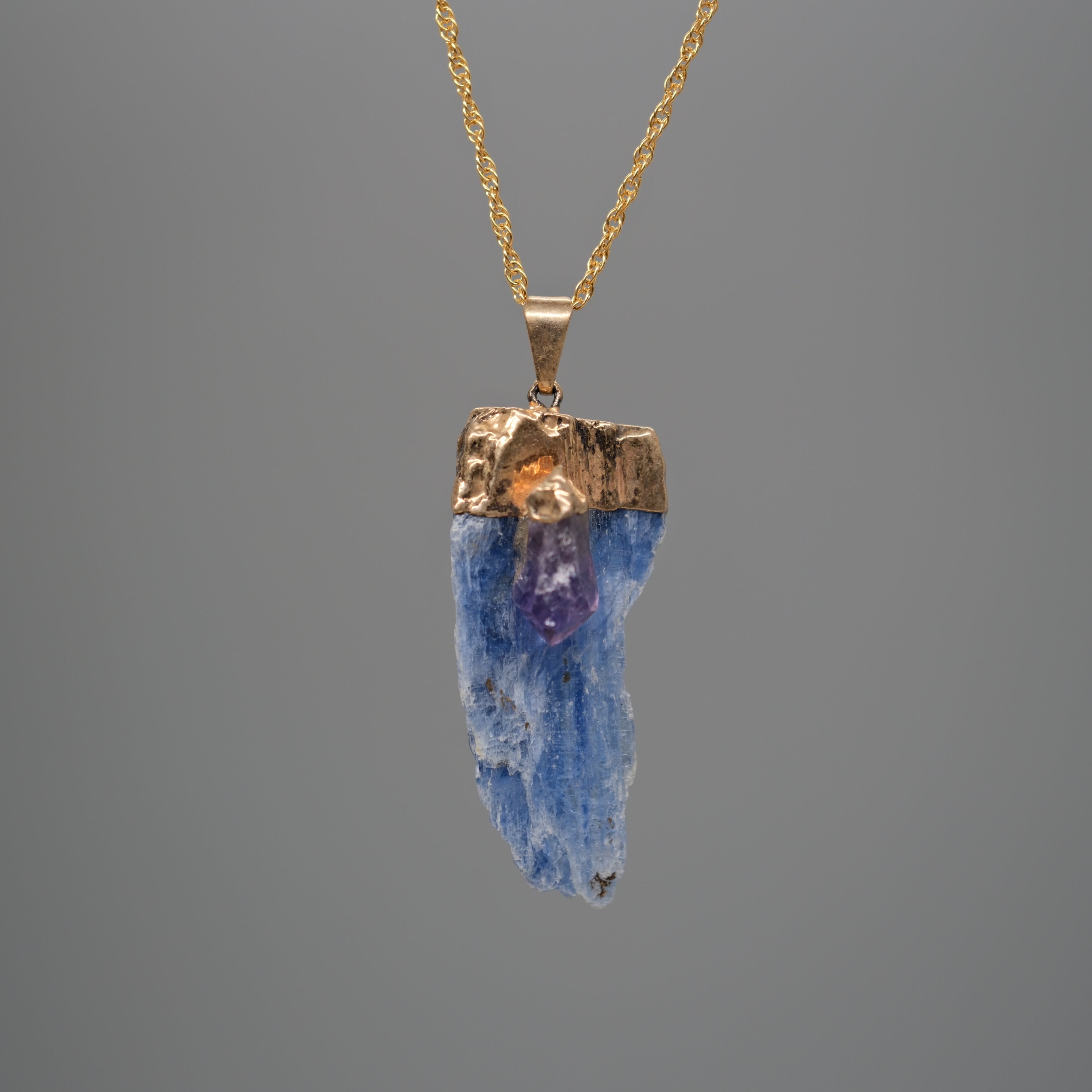A striking pendant featuring raw blue kyanite paired with a faceted amethyst crystal, set in rich 14k gold-filled detailing. Suspended from an 20” gold-filled chain, this necklace combines grounding and spiritual energy with a touch of elegance.