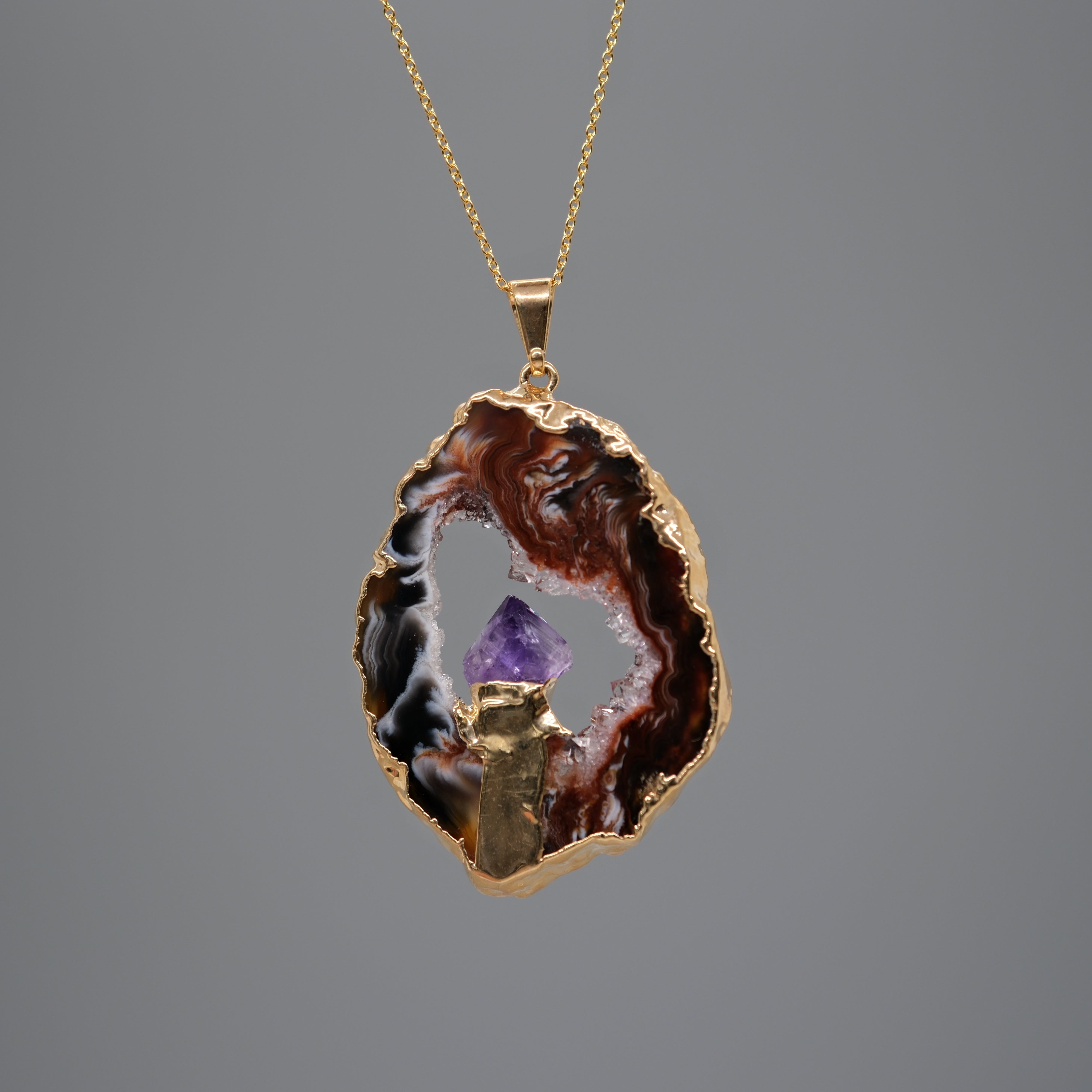 A stunning balance of raw beauty and refined design. This necklace features a natural agate geode framed in 14k gold plated detailing, with a faceted amethyst crystal elegantly set at its heart. Suspended from an 20-inch gold-filled chain, each piece highlights the organic banding and textures unique to the stone.