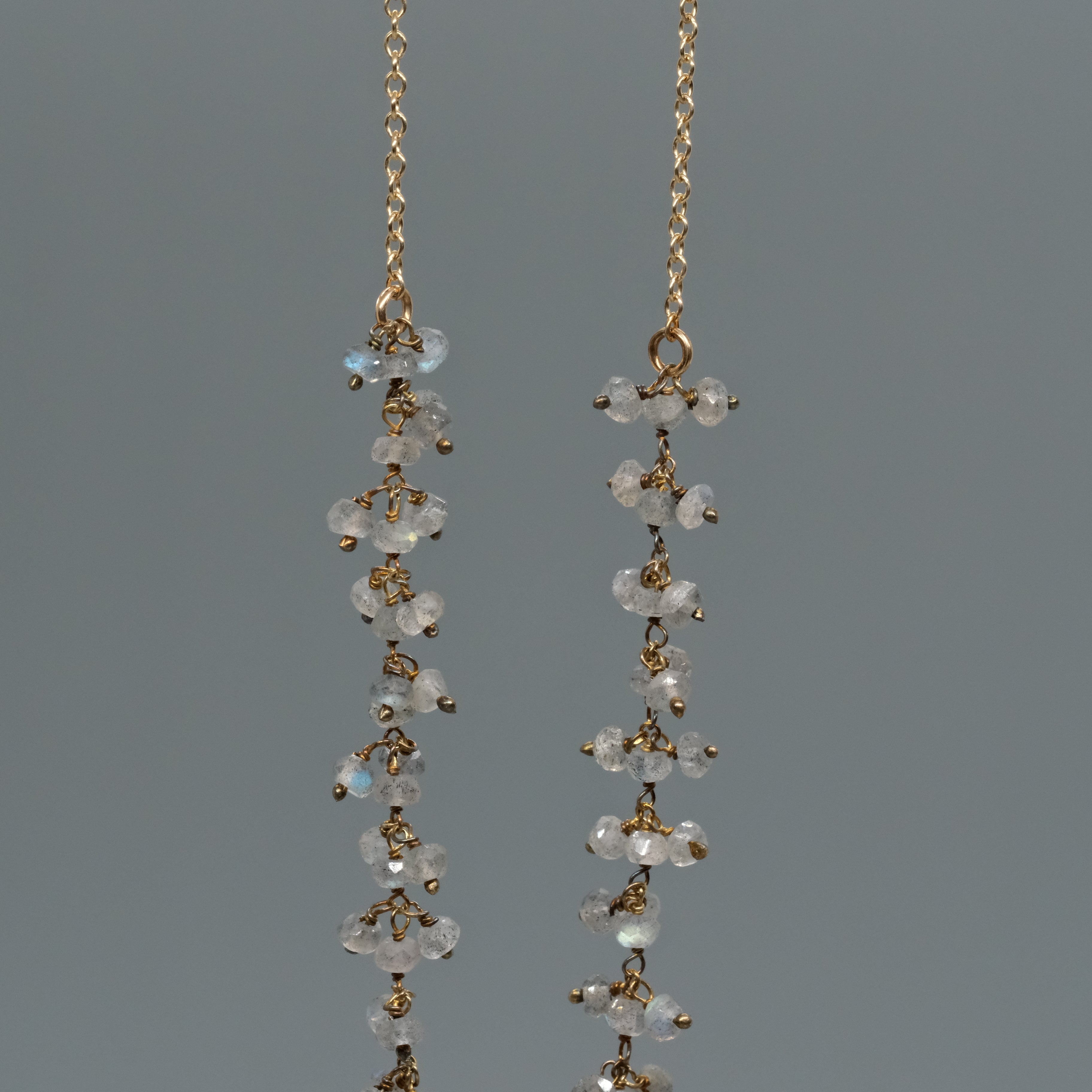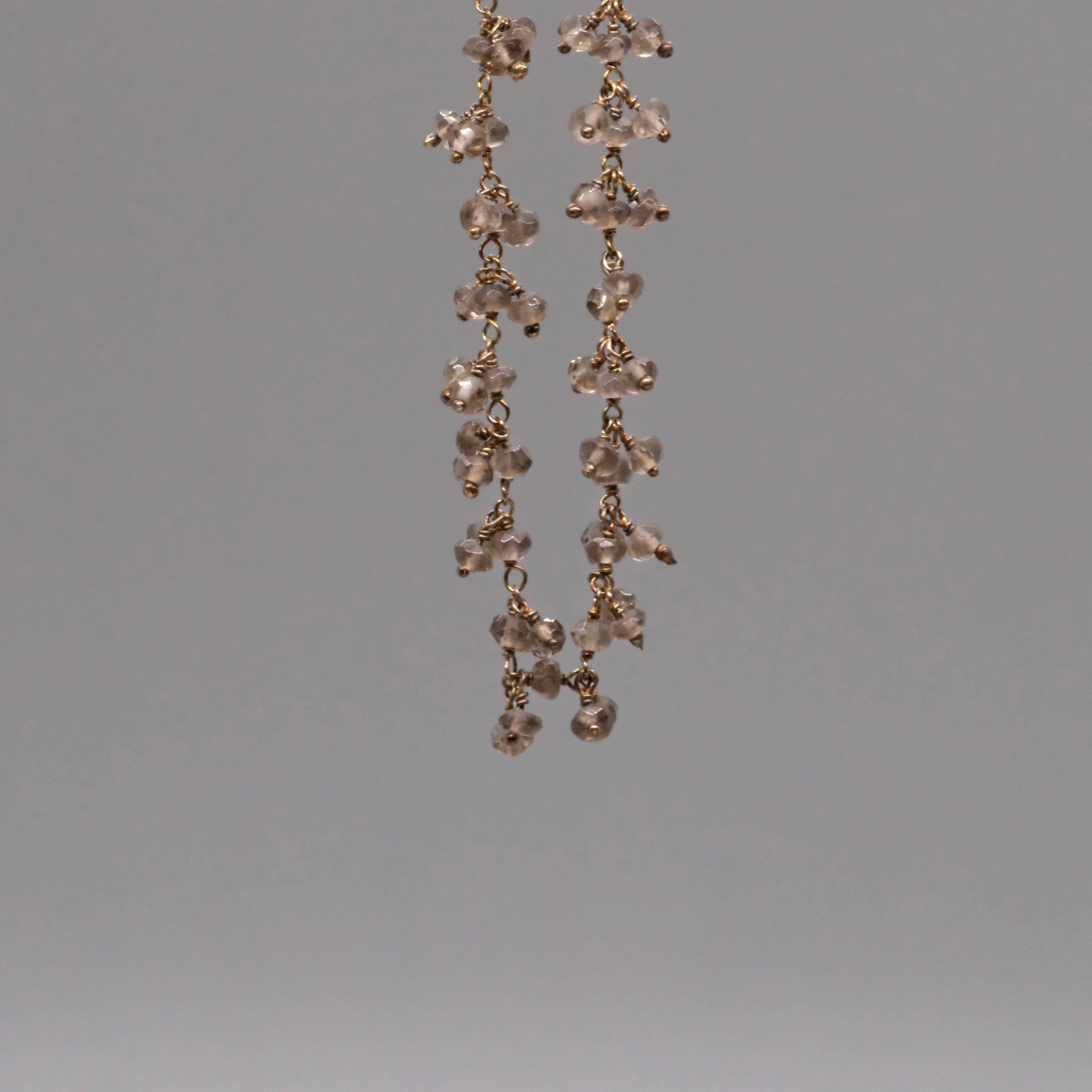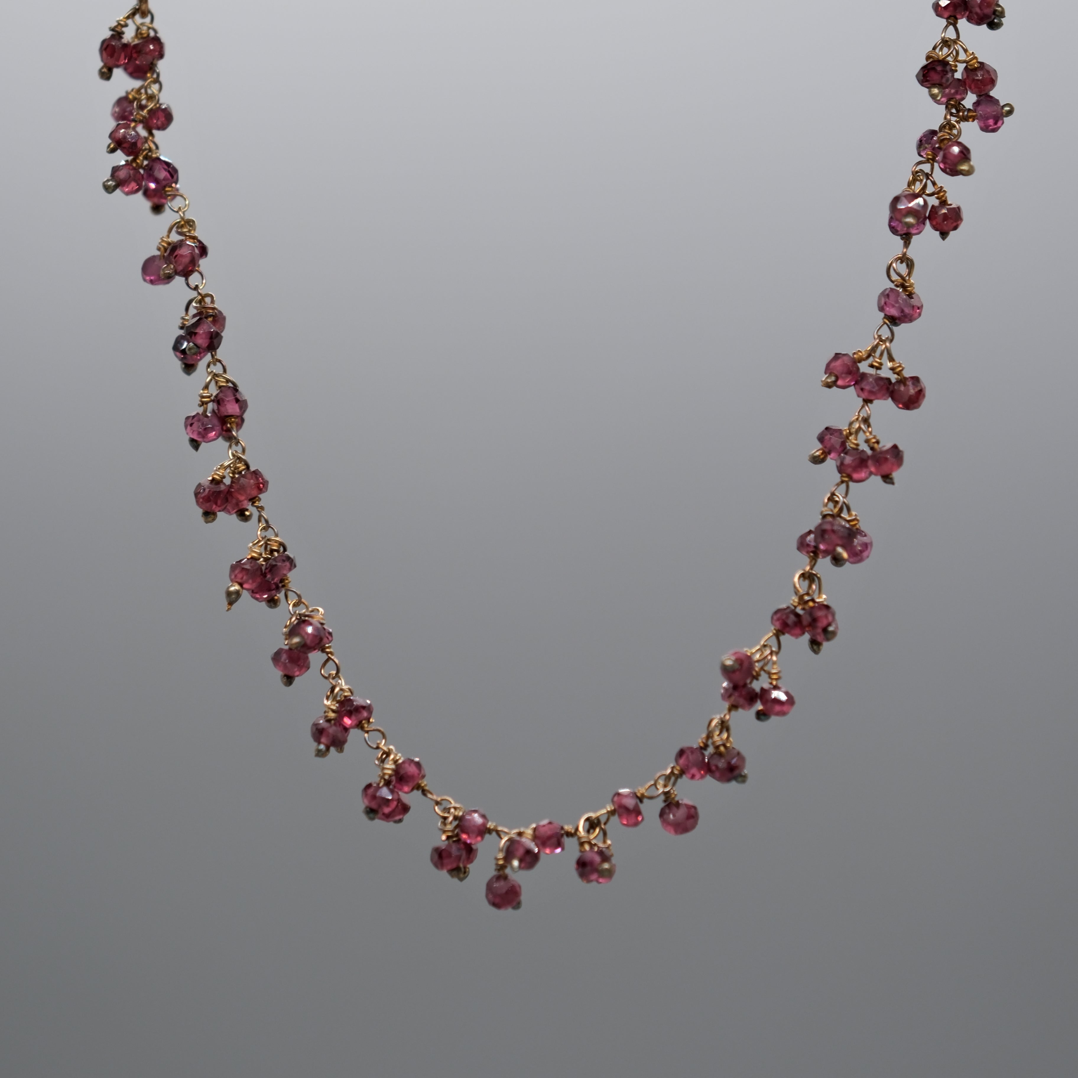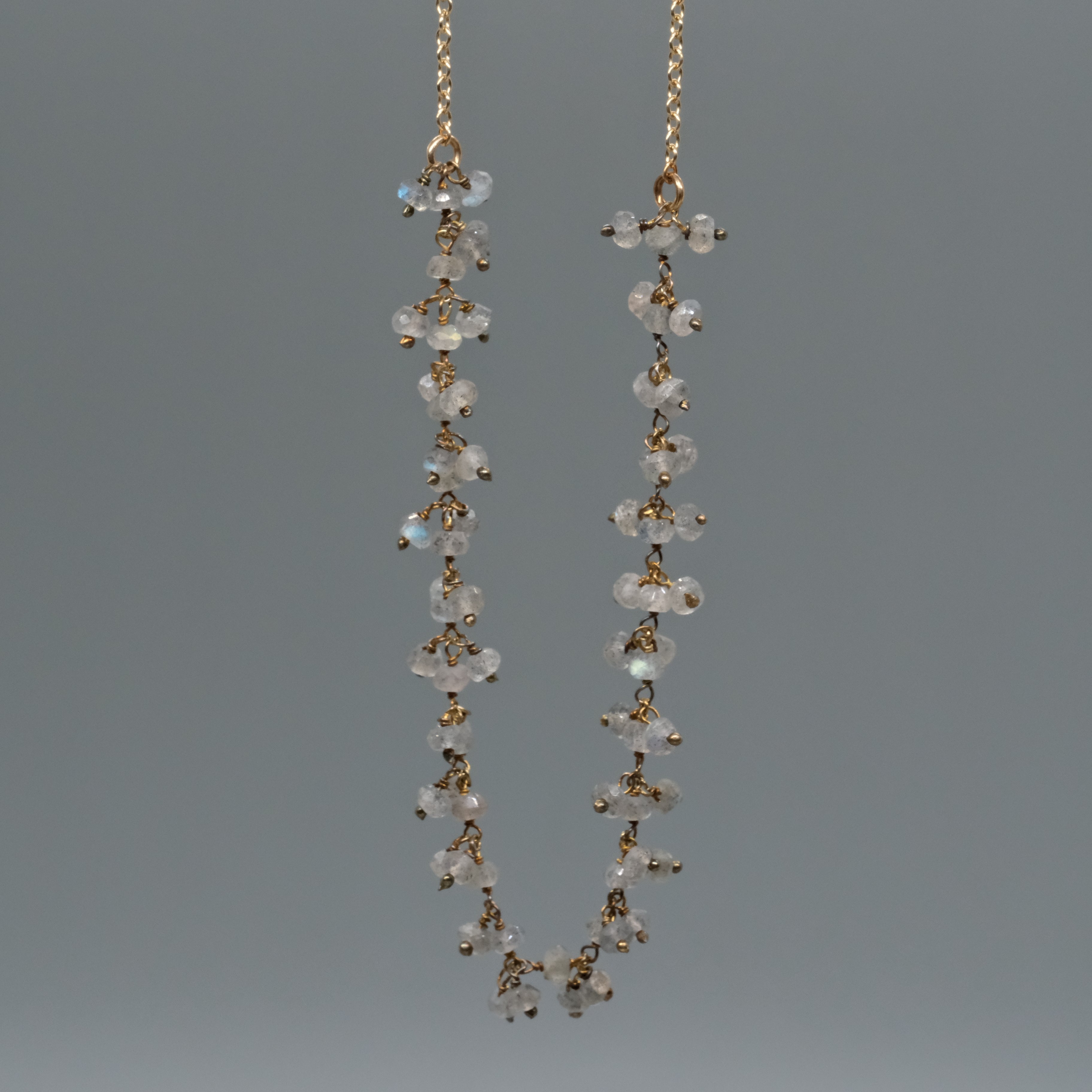 Shimmering and elegant, this 14k gold-filled necklace features clusters of tiny gemstones hand-wrapped along the chain.