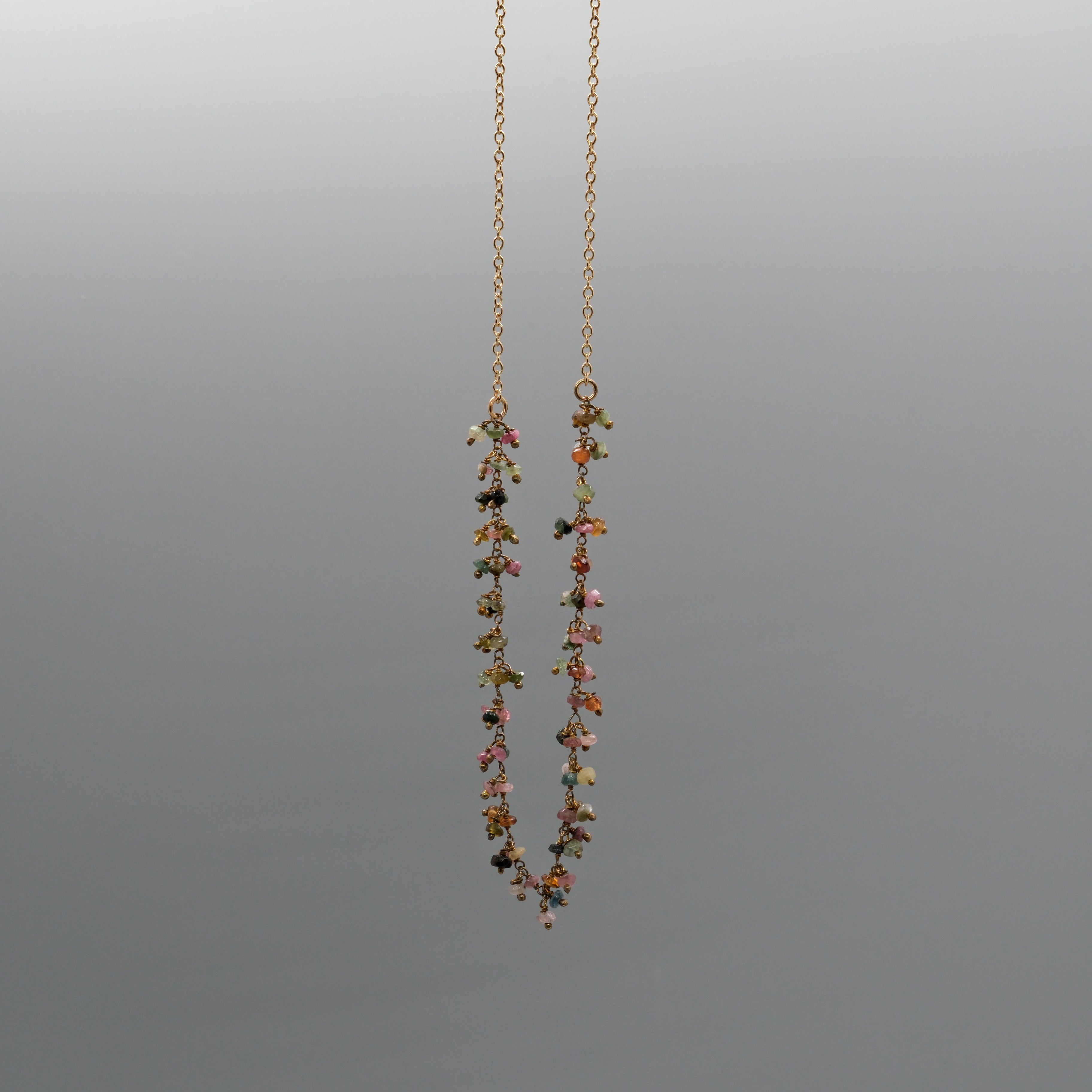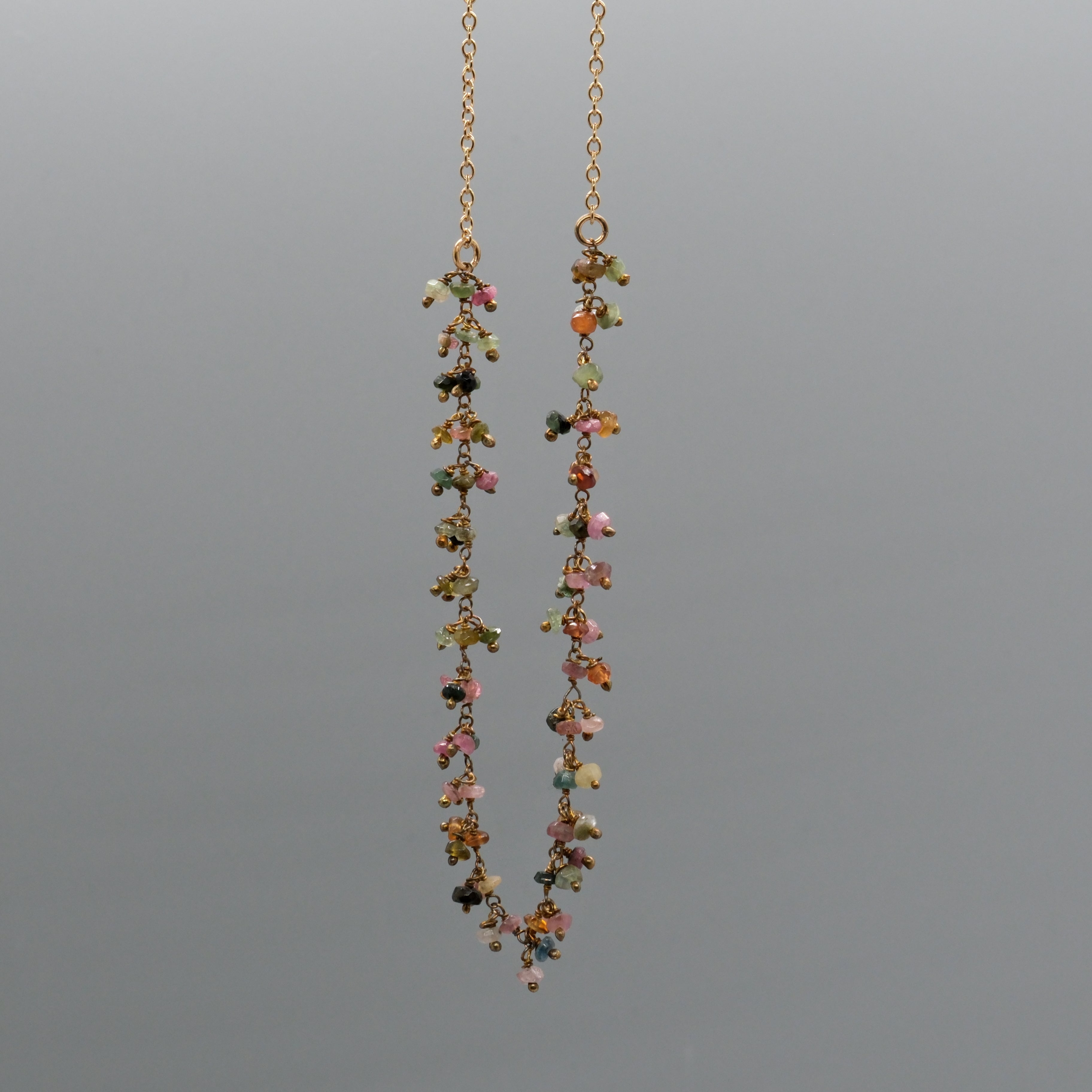 Colorful, delicate, and full of movement. This handcrafted necklace features dozens of tiny natural tourmaline gemstones, each one hand-wrapped to create a soft, cascading fringe of pinks, greens, golds, and earthy tones. The organic mix of colors makes every necklace completely unique.