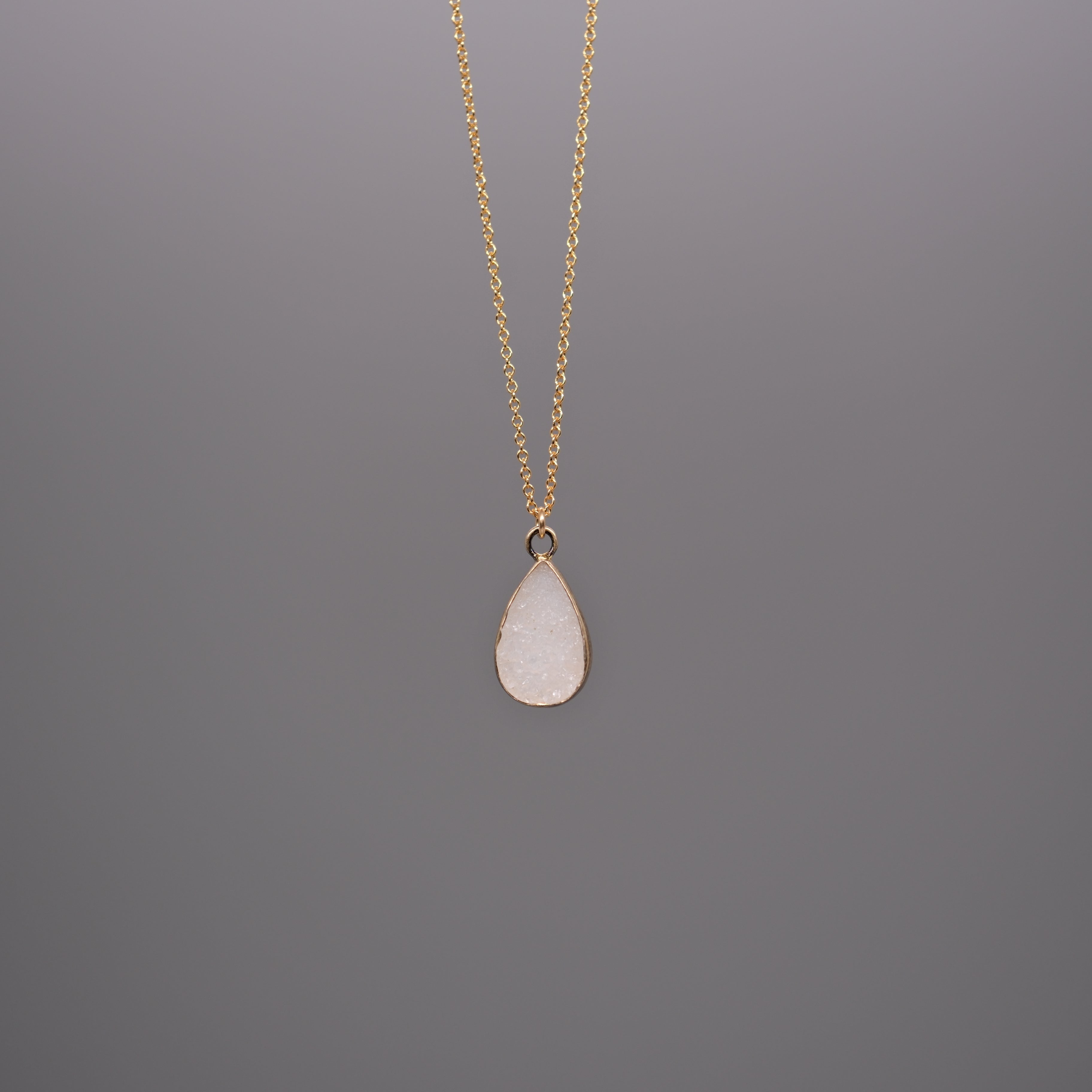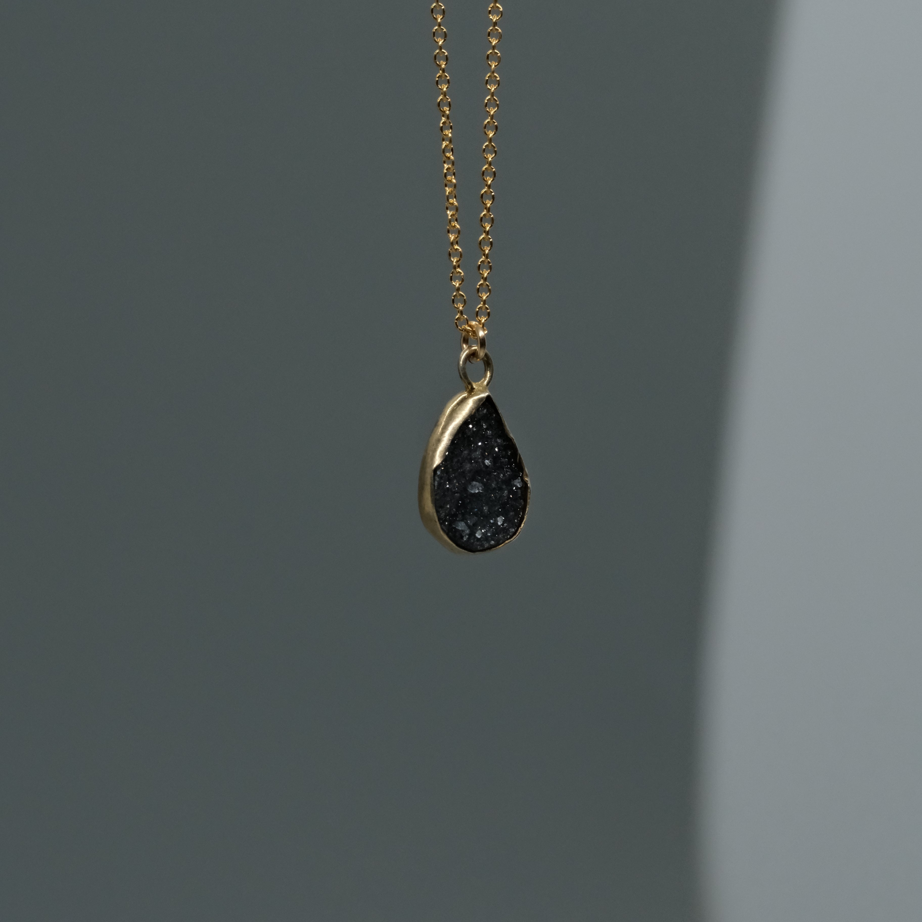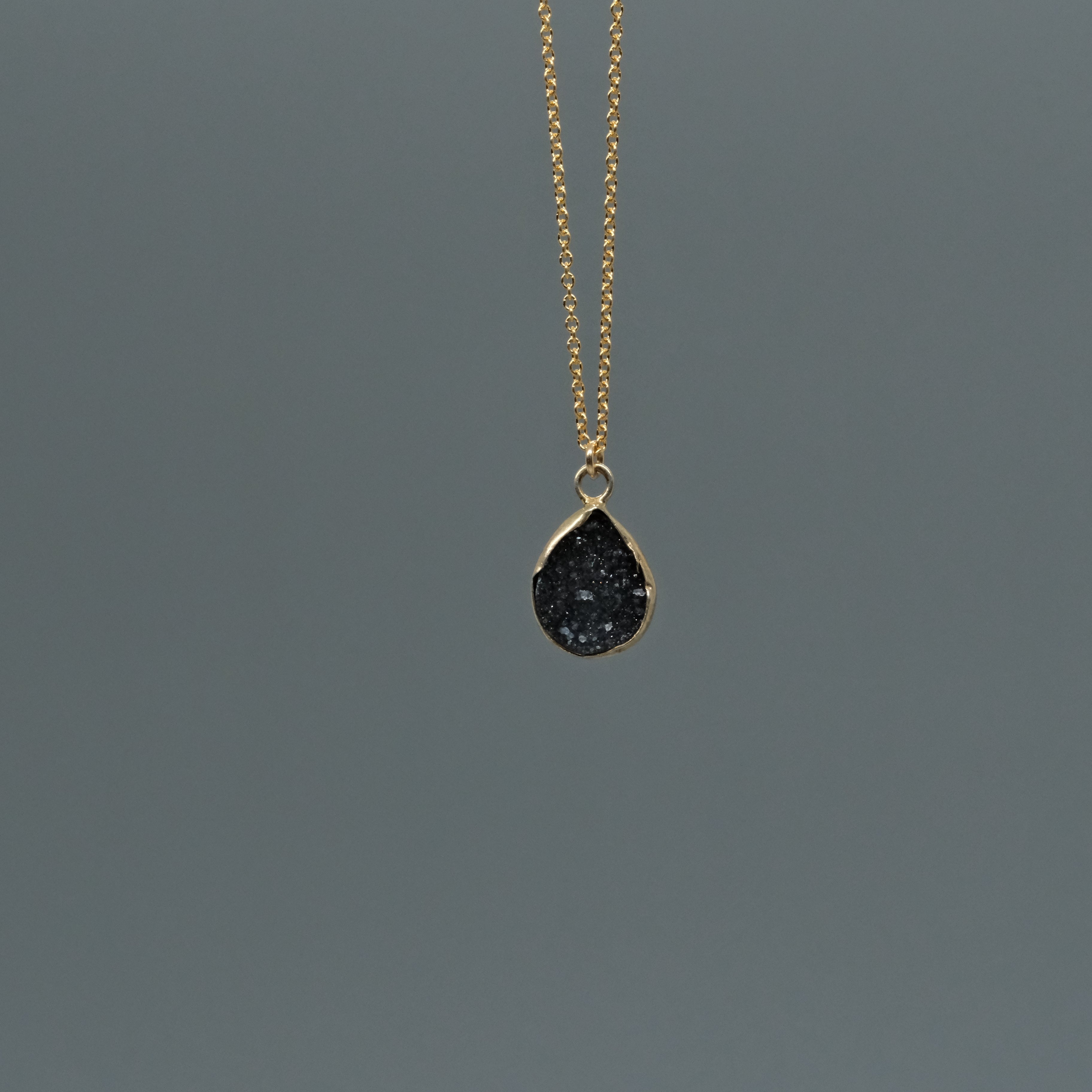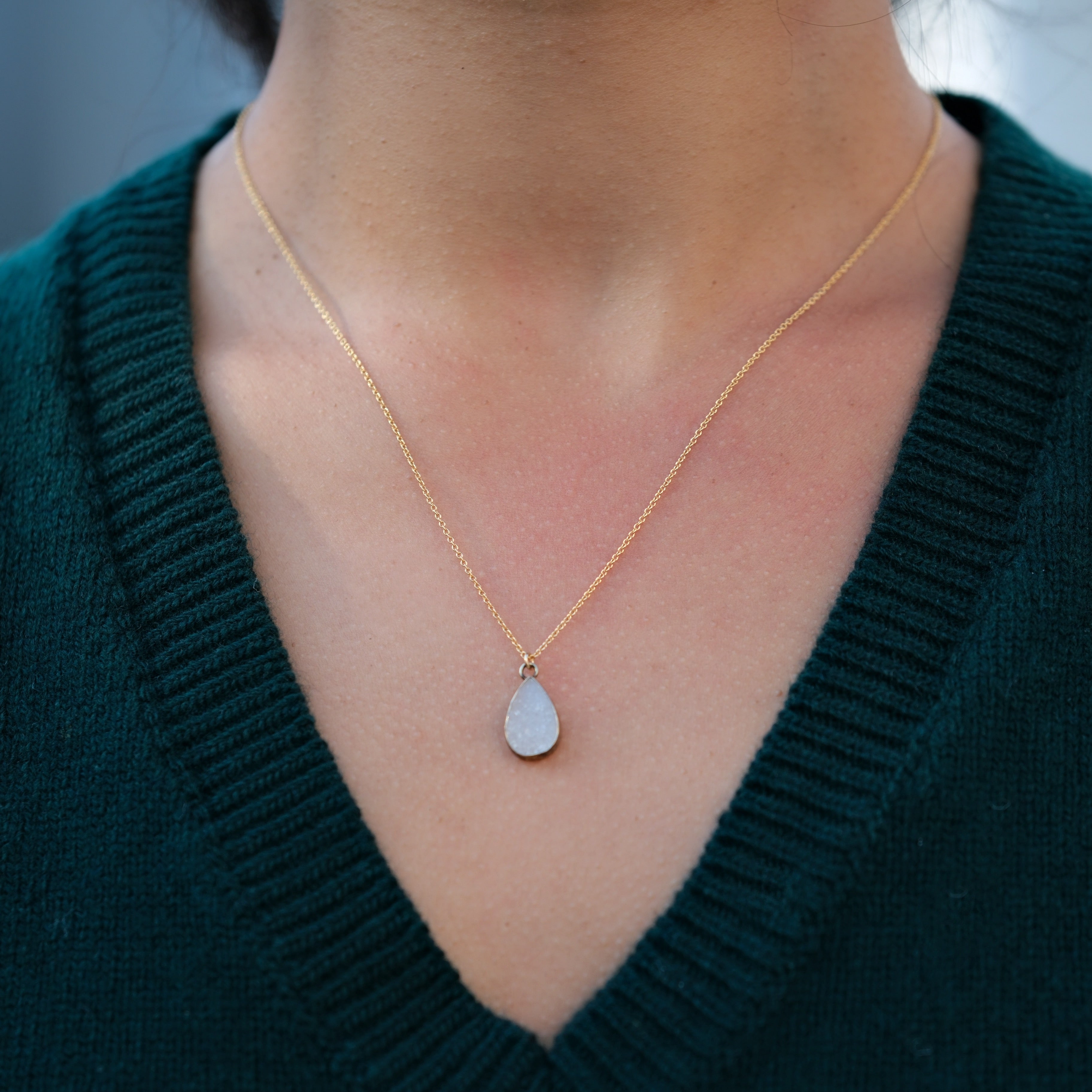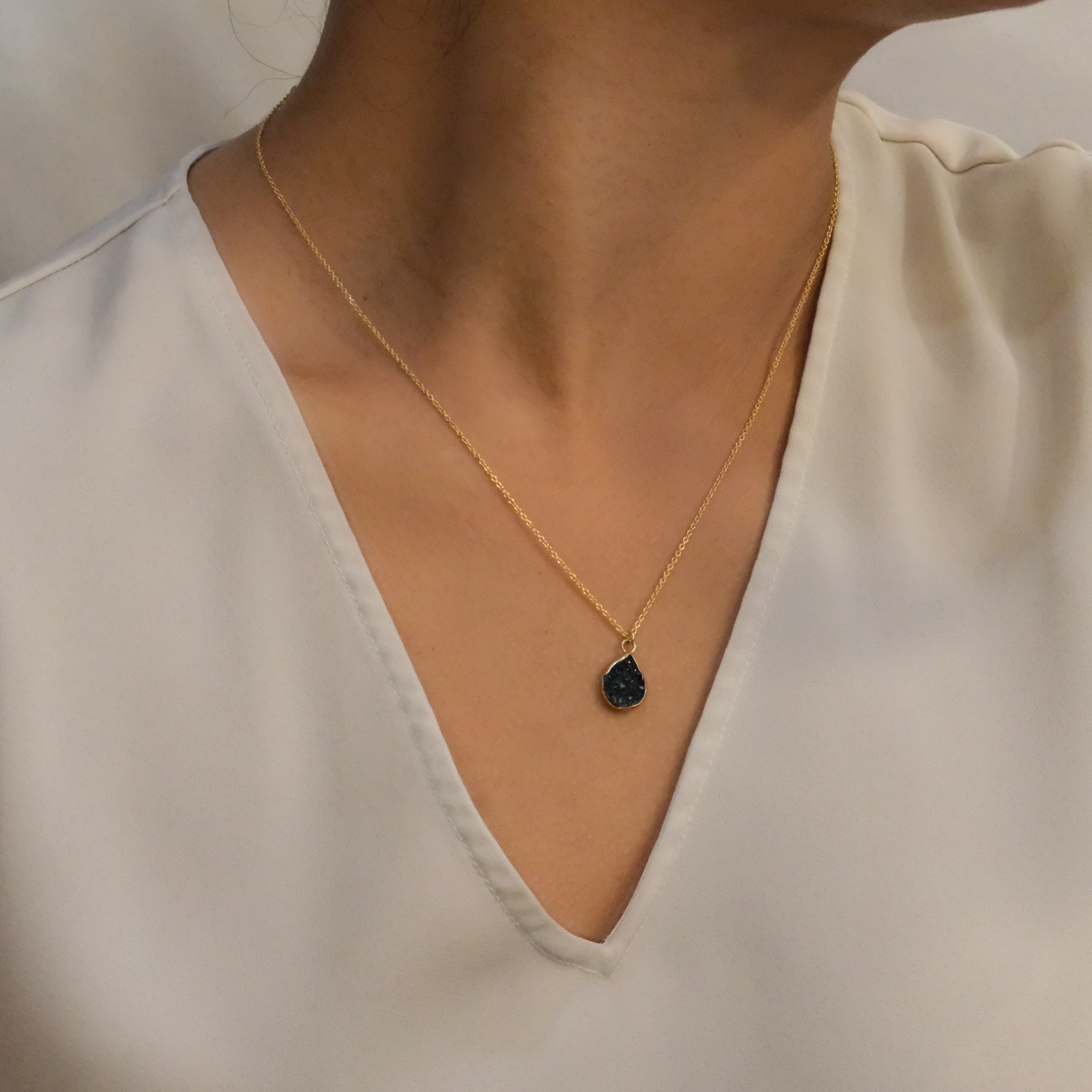 Sparkling and elegant, this 14k gold-filled necklace features a natural druzy pendant framed in gold-plated sterling silver. The stone’s crystal surface catches the light beautifully, adding a subtle shimmer that elevates any look.