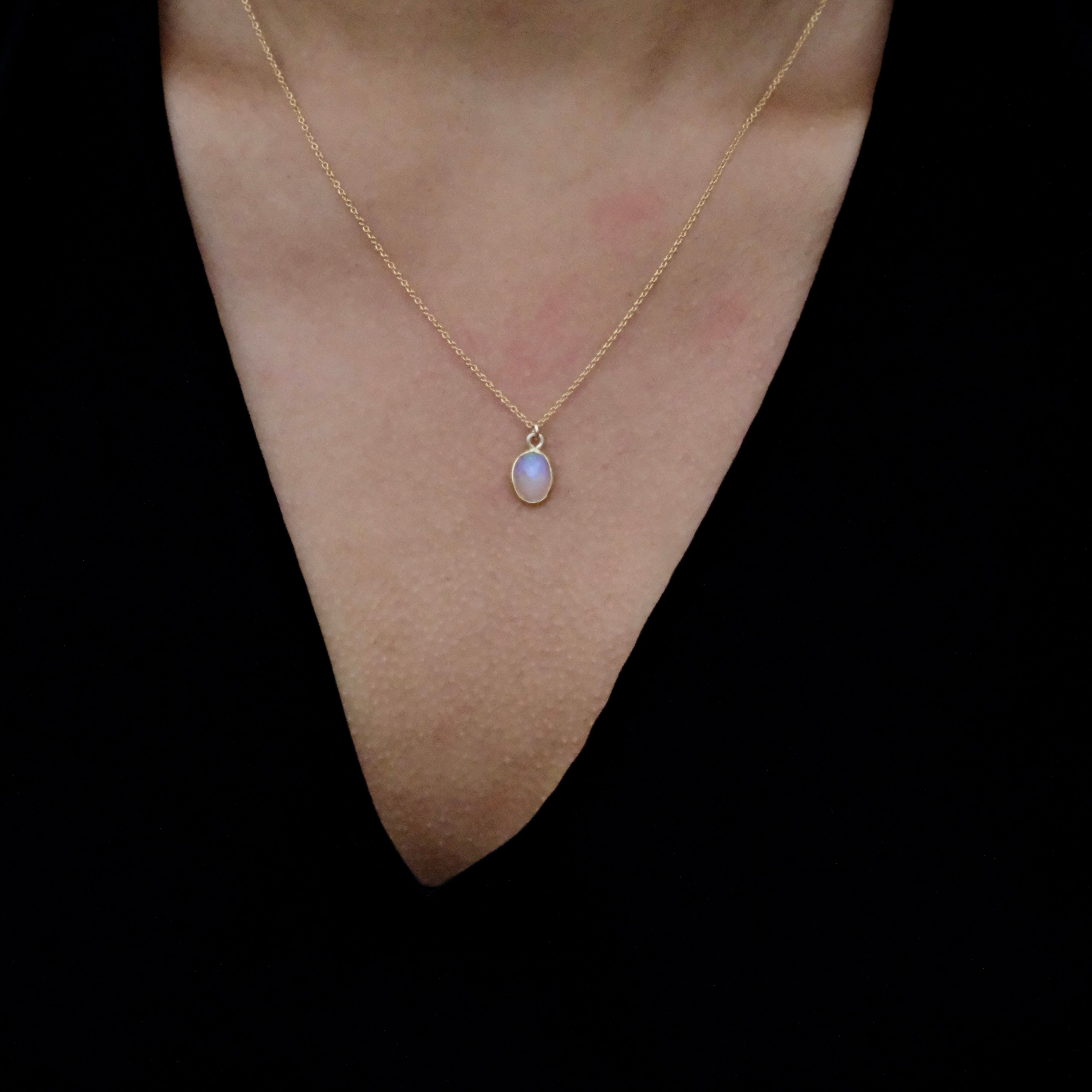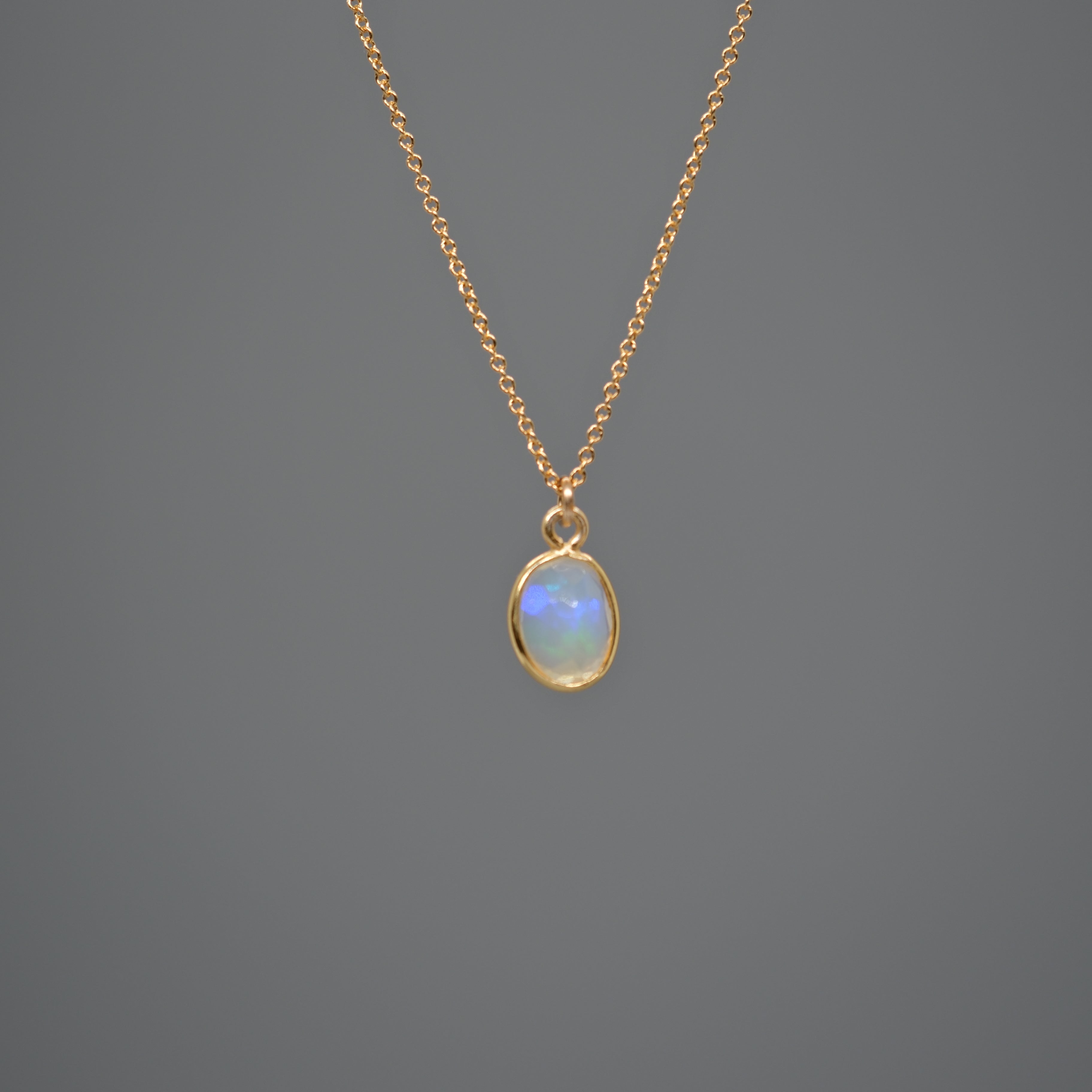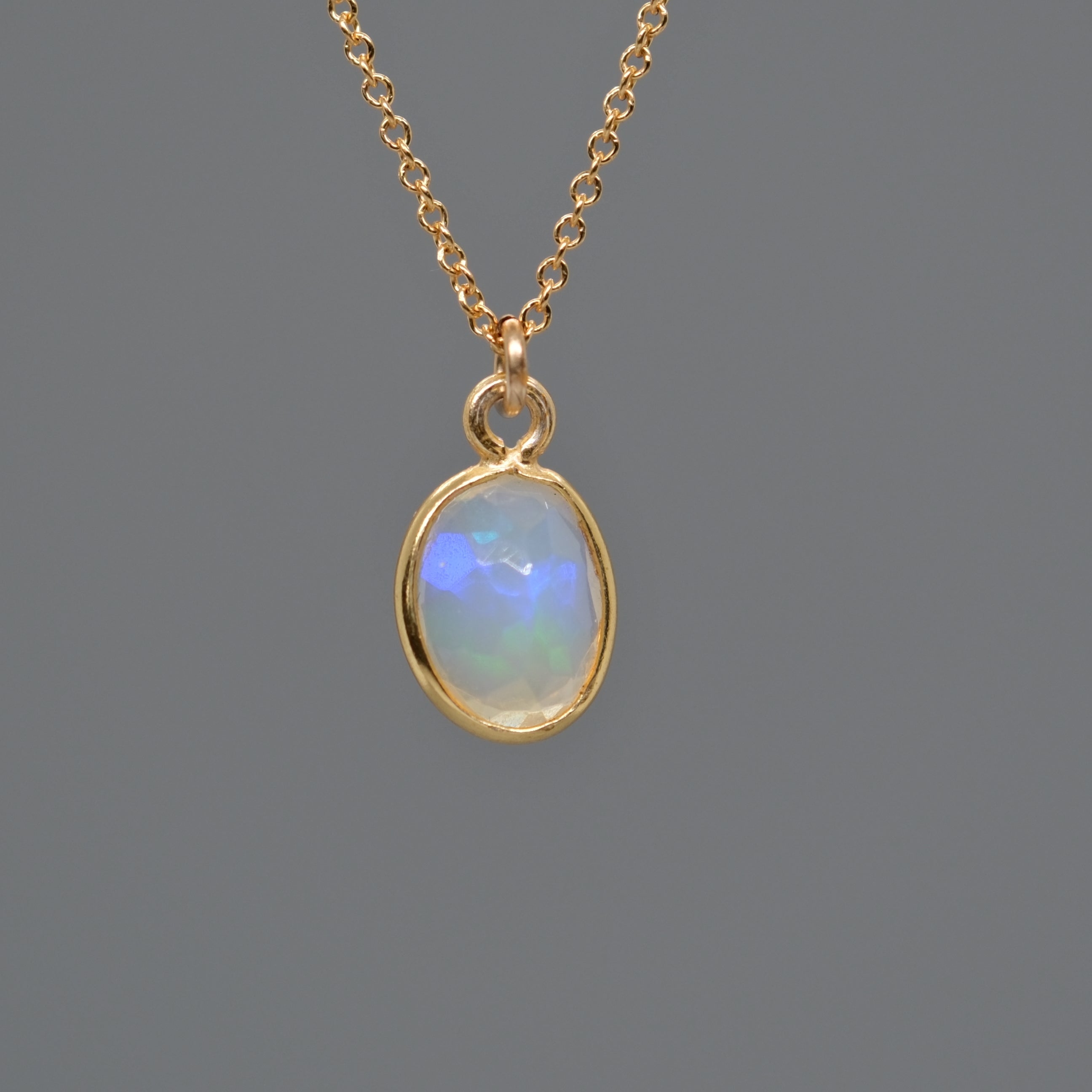 Radiant with flashes of blue, green, and gold, this faceted Ethiopian opal catches light from every angle. Set in a sleek gold-plated sterling silver bezel and hanging from an 18” gold-filled chain, it’s a graceful, minimal necklace that adds an elegant shimmer to any look.