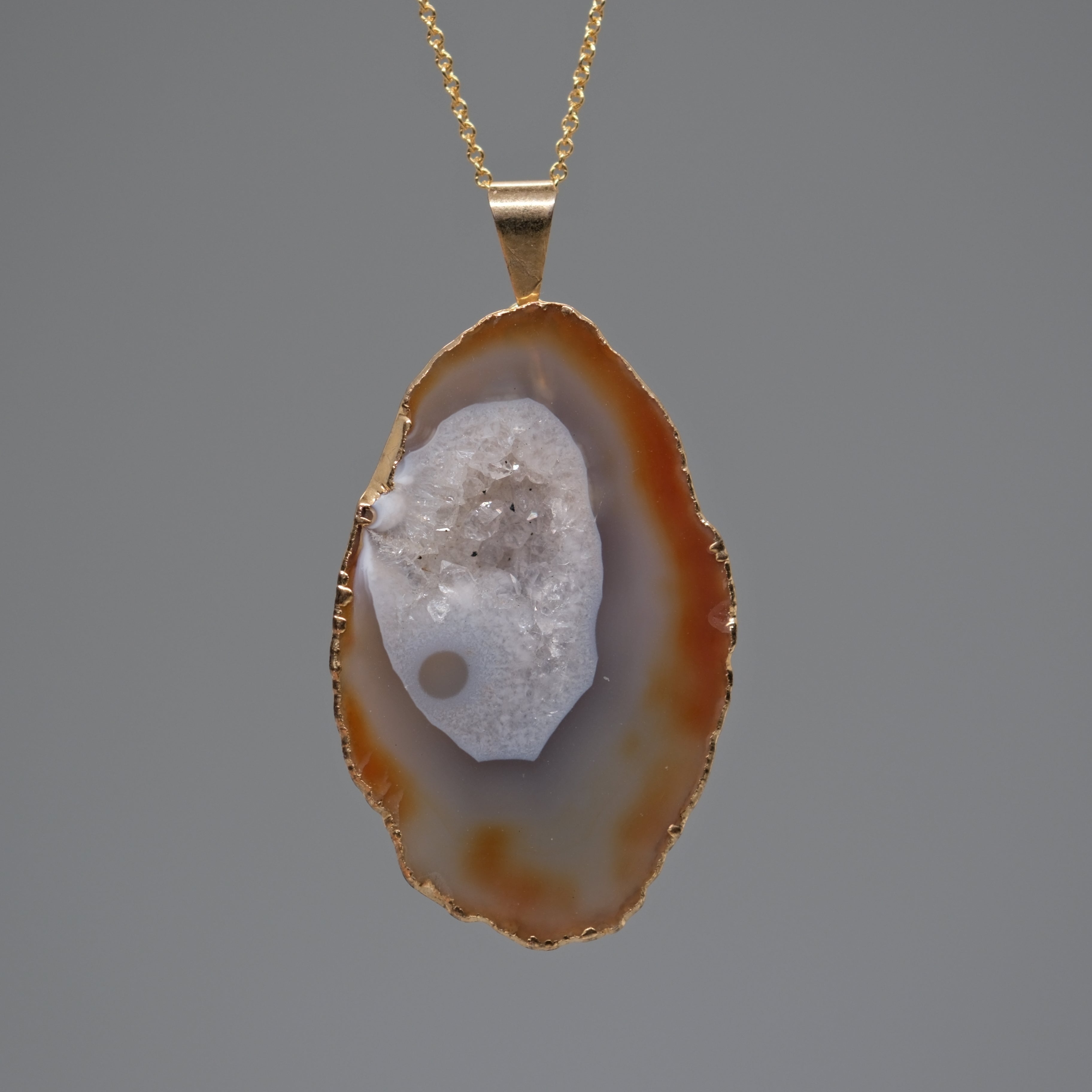 Earthy elegance meets natural sparkle in this one-of-a-kind brown agate pendant. Featuring warm caramel and taupe tones with a glimmering druzy center, each slice reveals mesmerizing banding framed in radiant gold.
