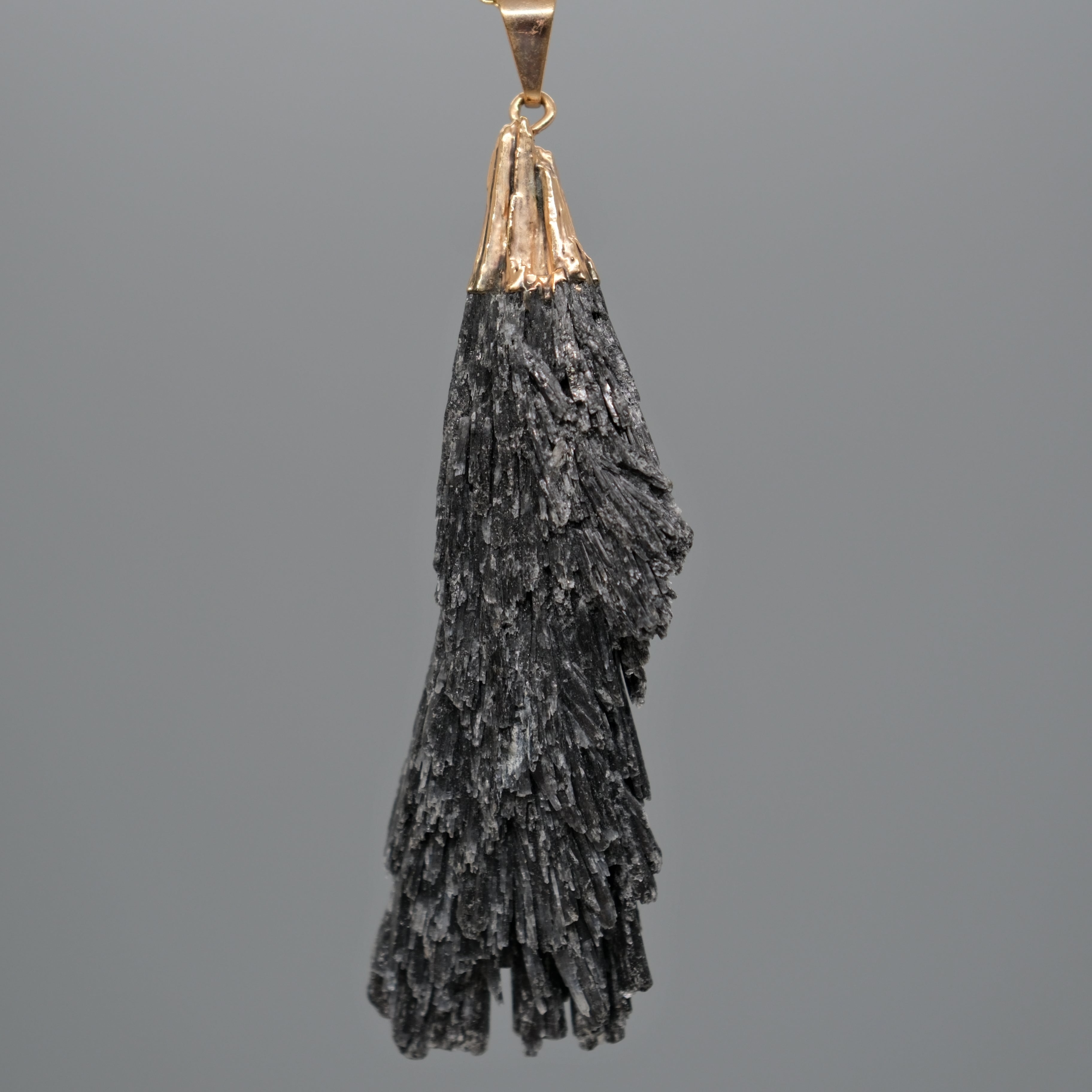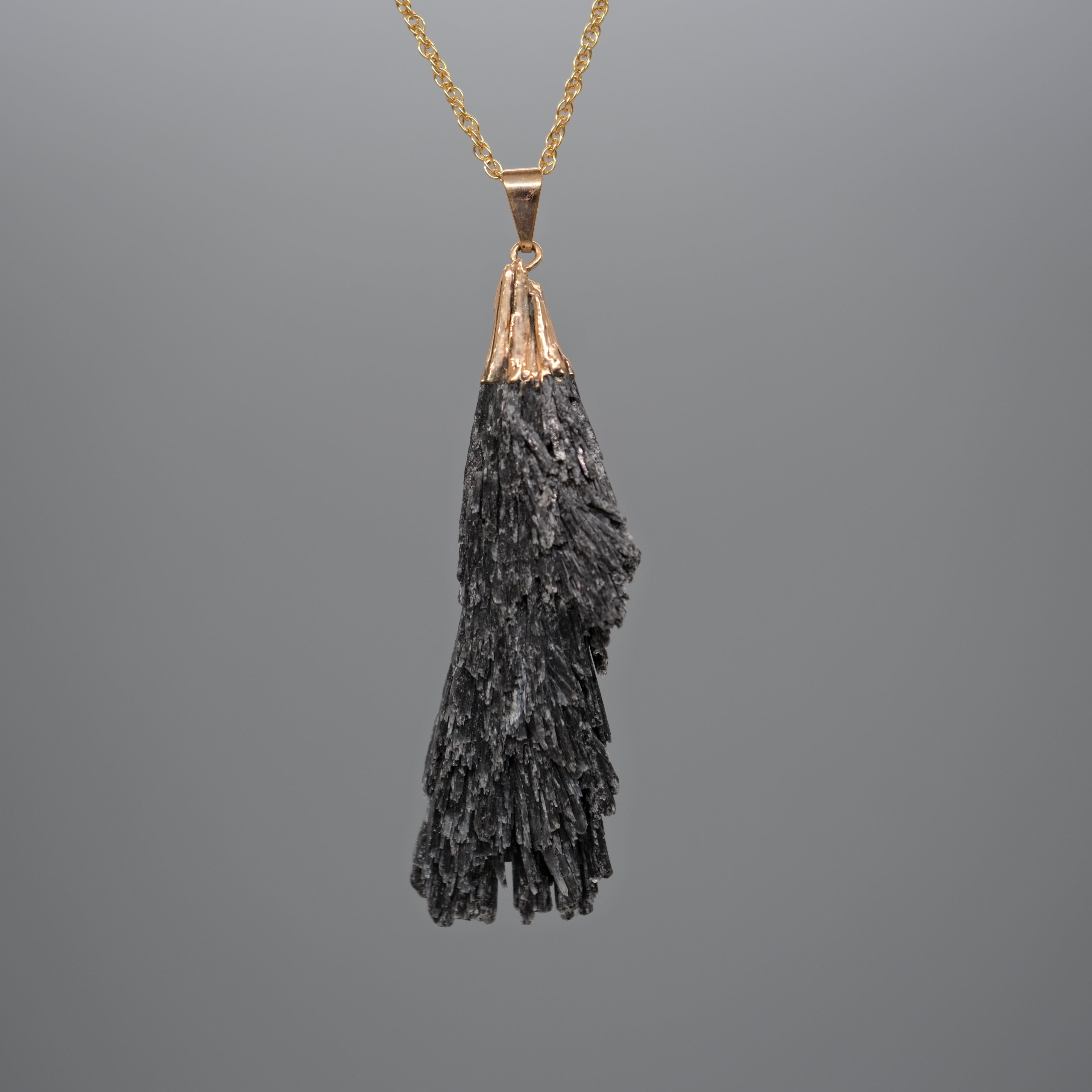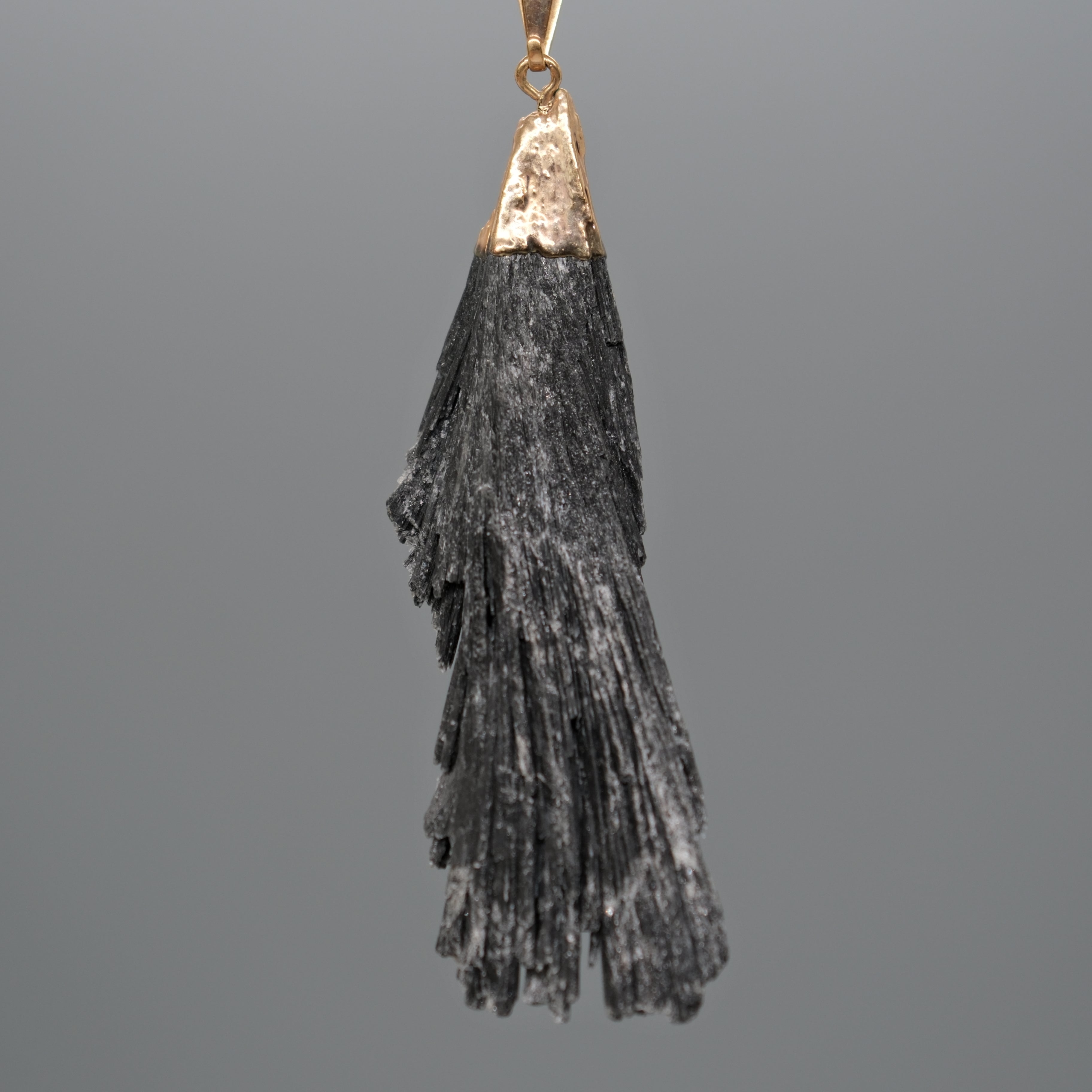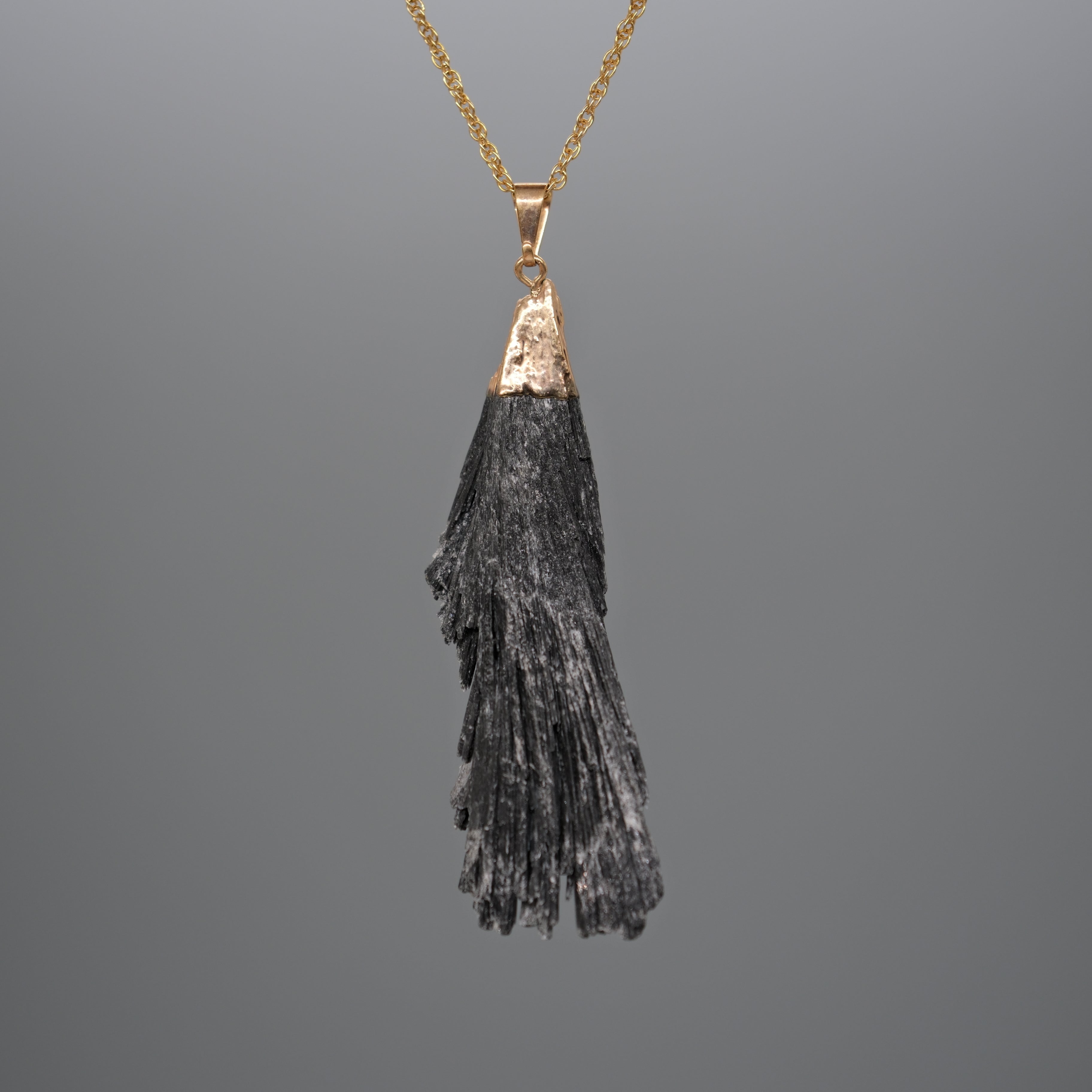 Raw and grounding, this striking black kyanite pendant is accented with a hammered gold-plated cap for a touch of modern elegance.