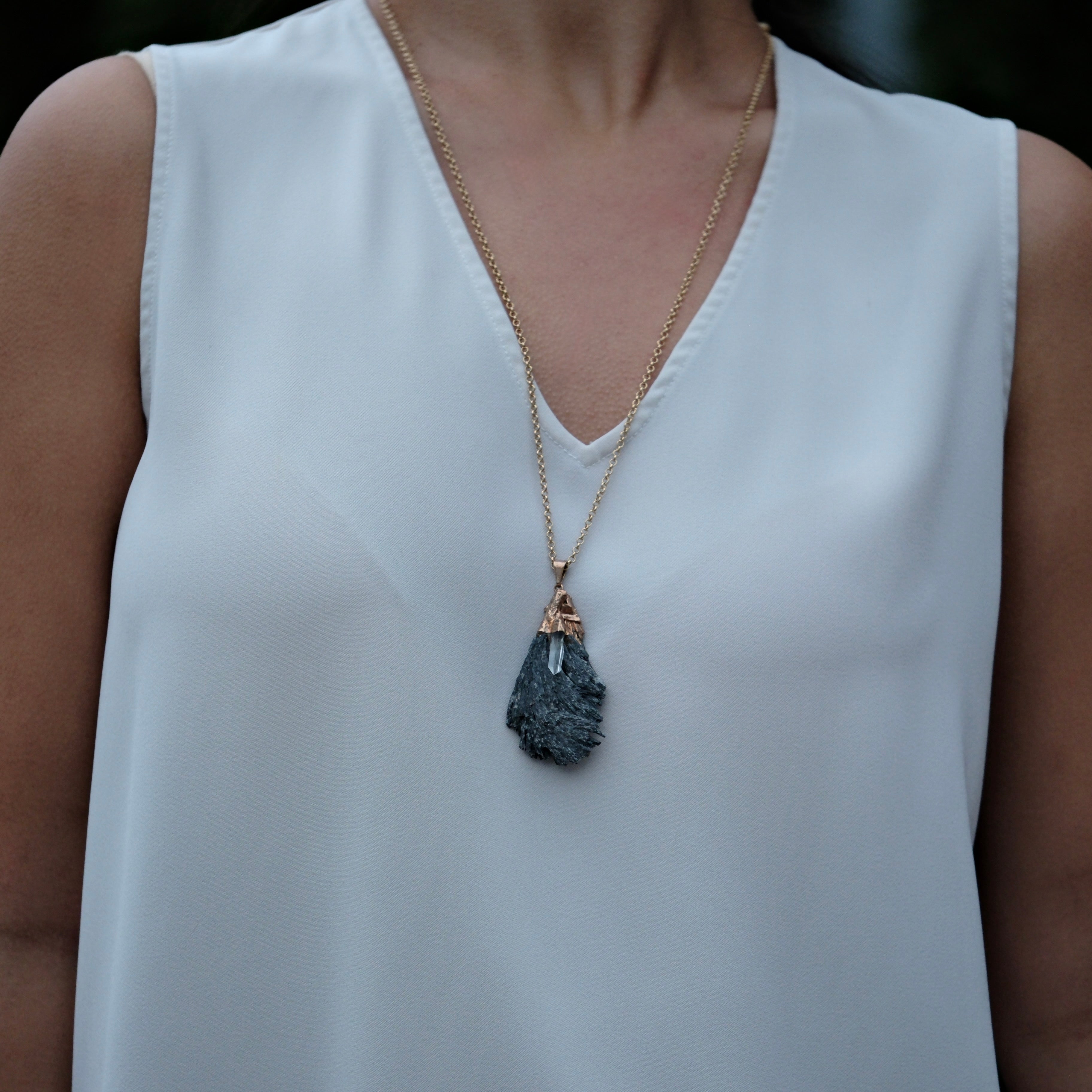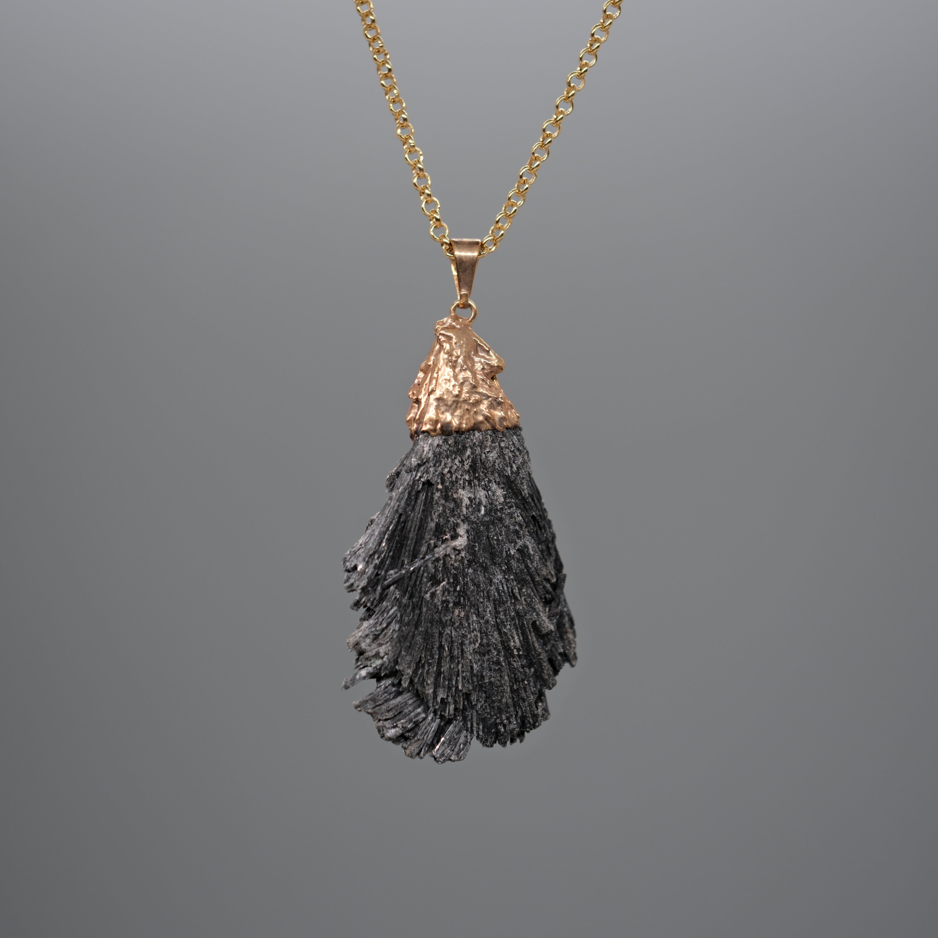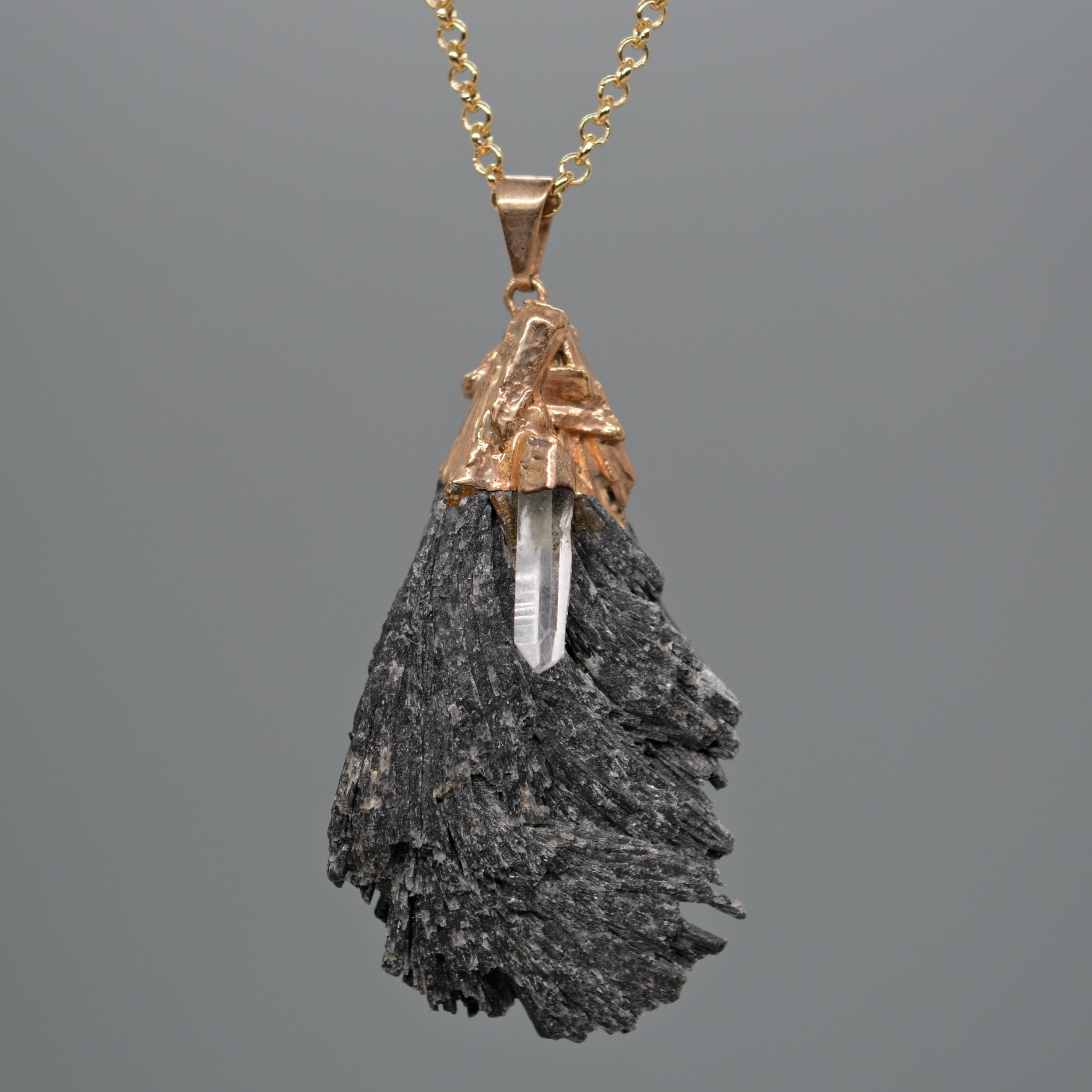 A captivating combination of grounding and clarity, this pendant features raw black kyanite accented with a clear quartz point, set in gold plating.