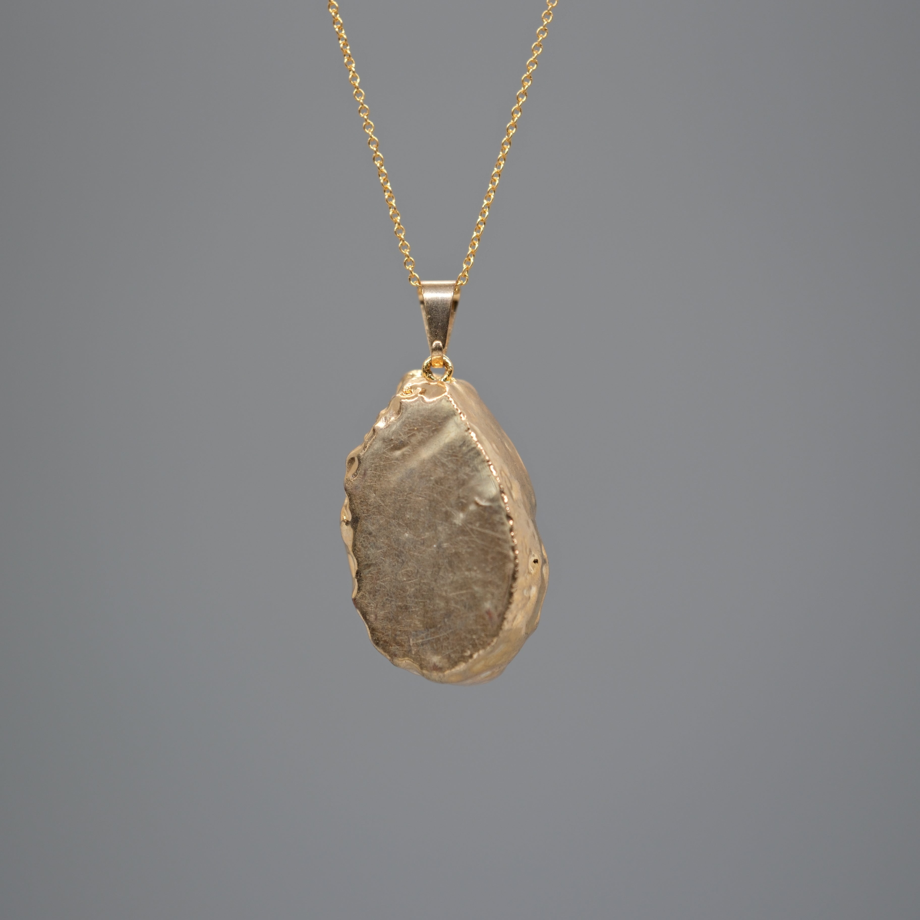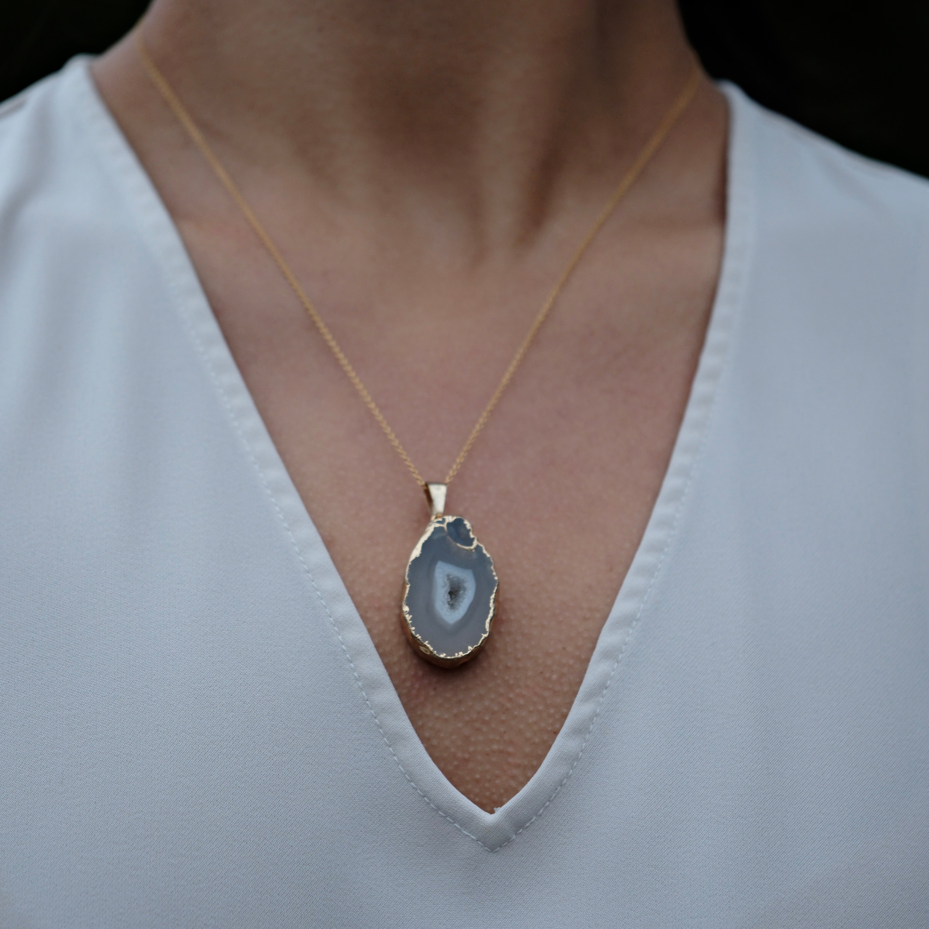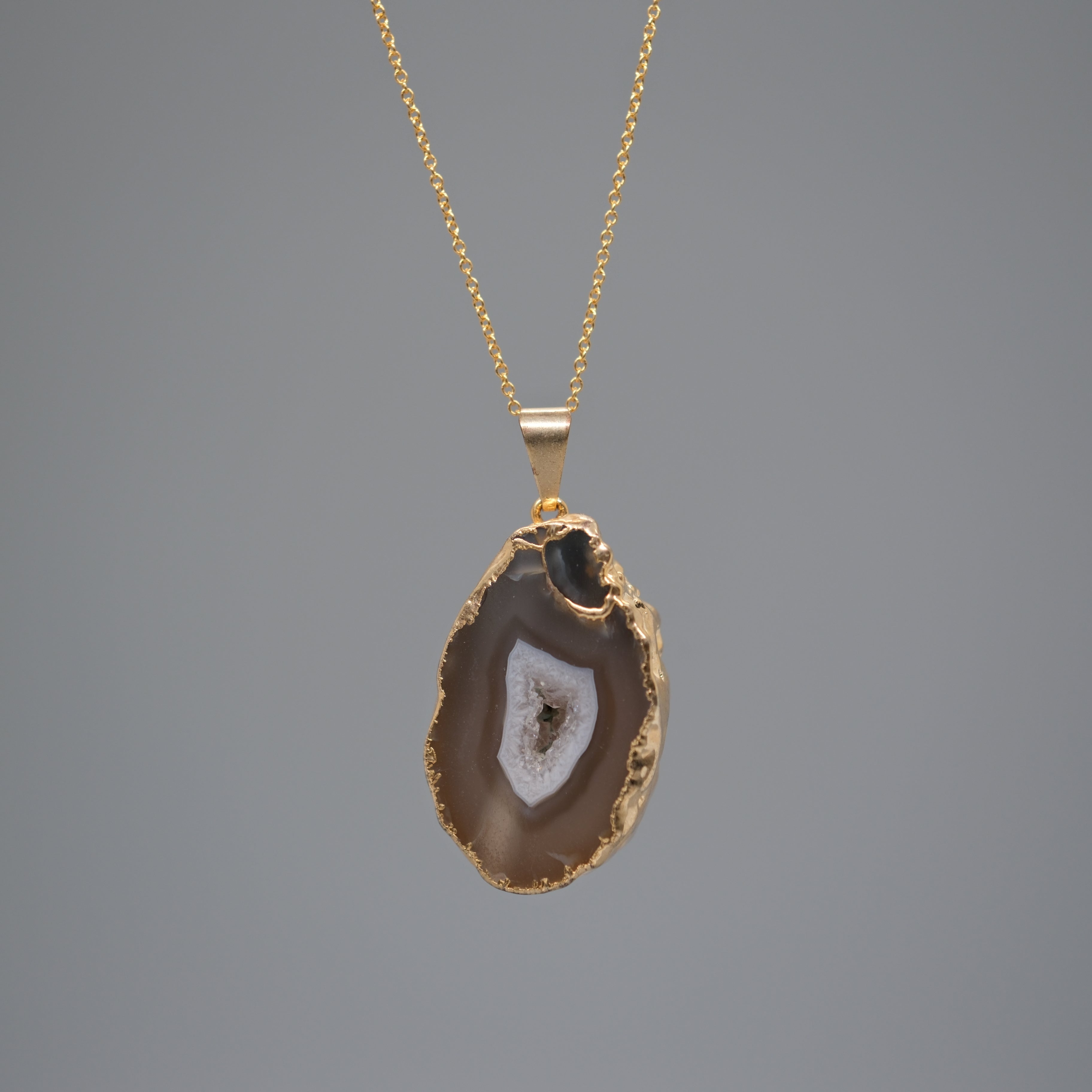 A stunning blend of organic texture and natural sparkle, this necklace showcases a polished brown agate slice with a crystal-lined center, framed in gold and paired with a 14k gold-filled chain. Each pendant is naturally one of a kind, featuring its own unique banding and geode detail.