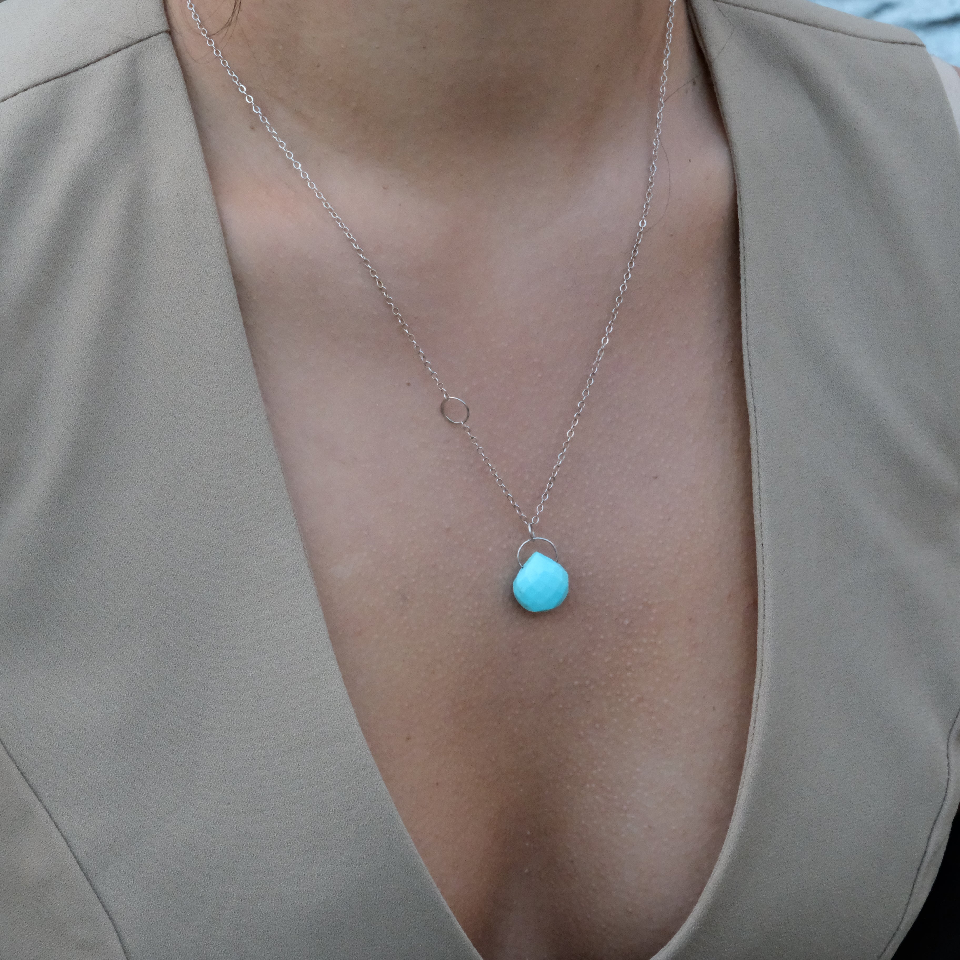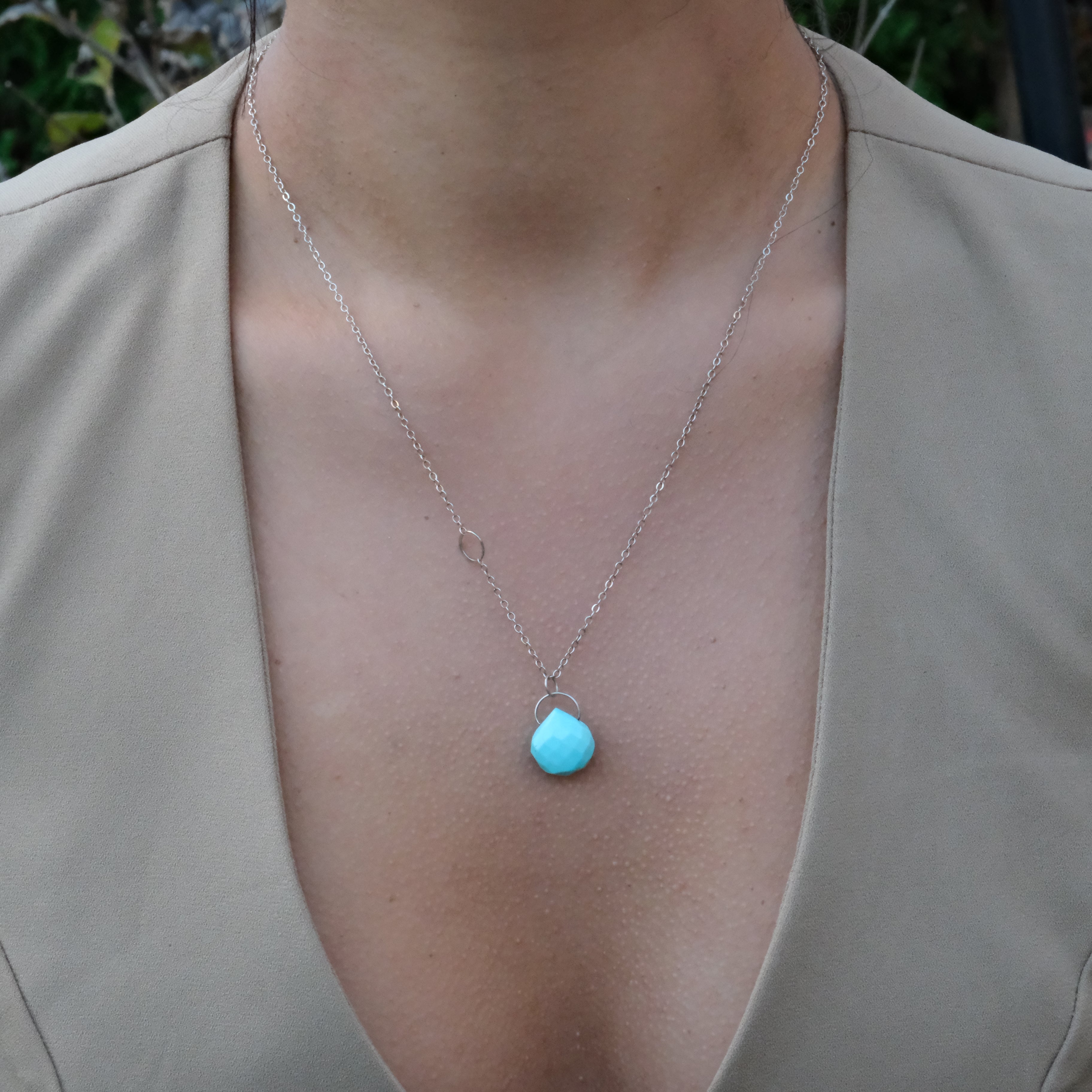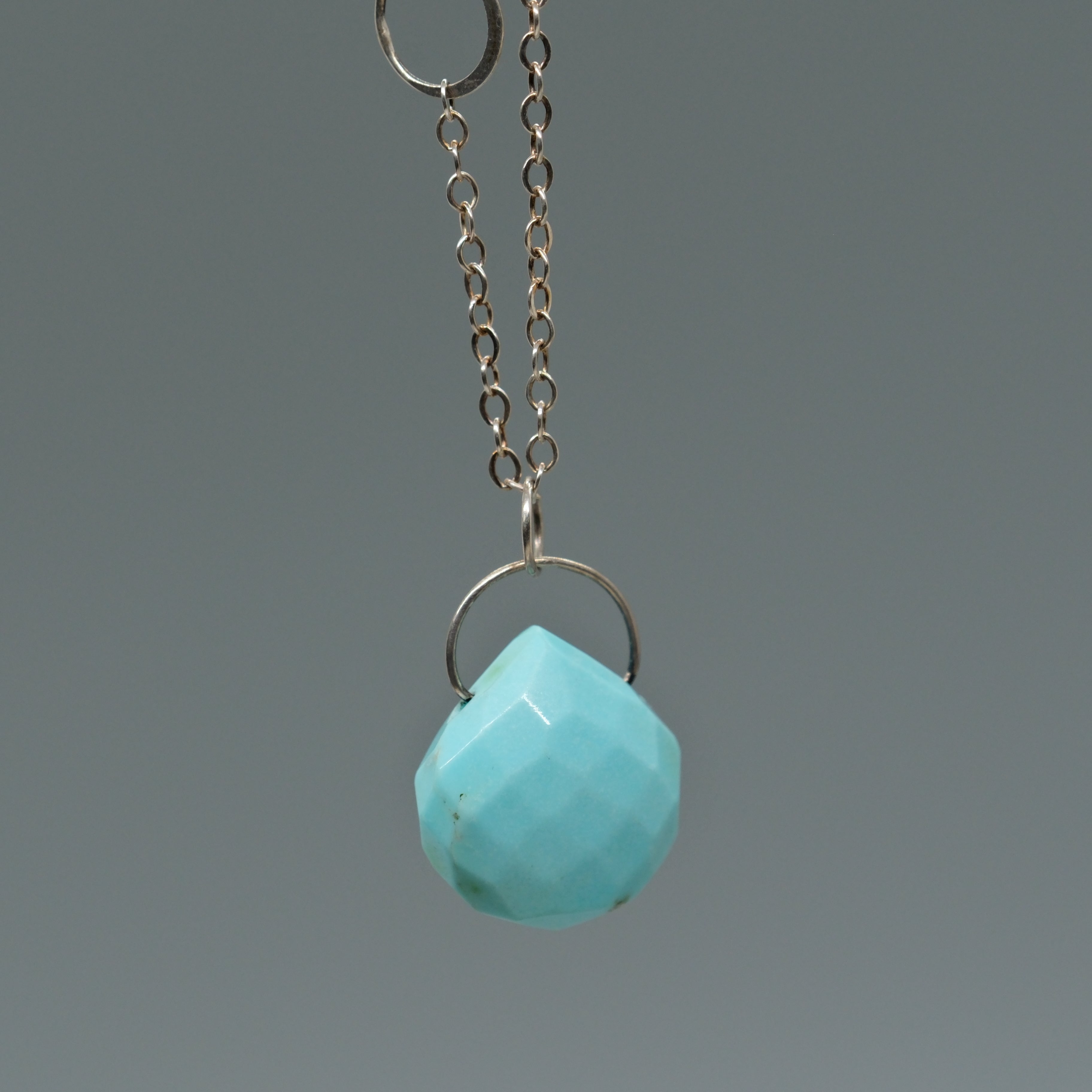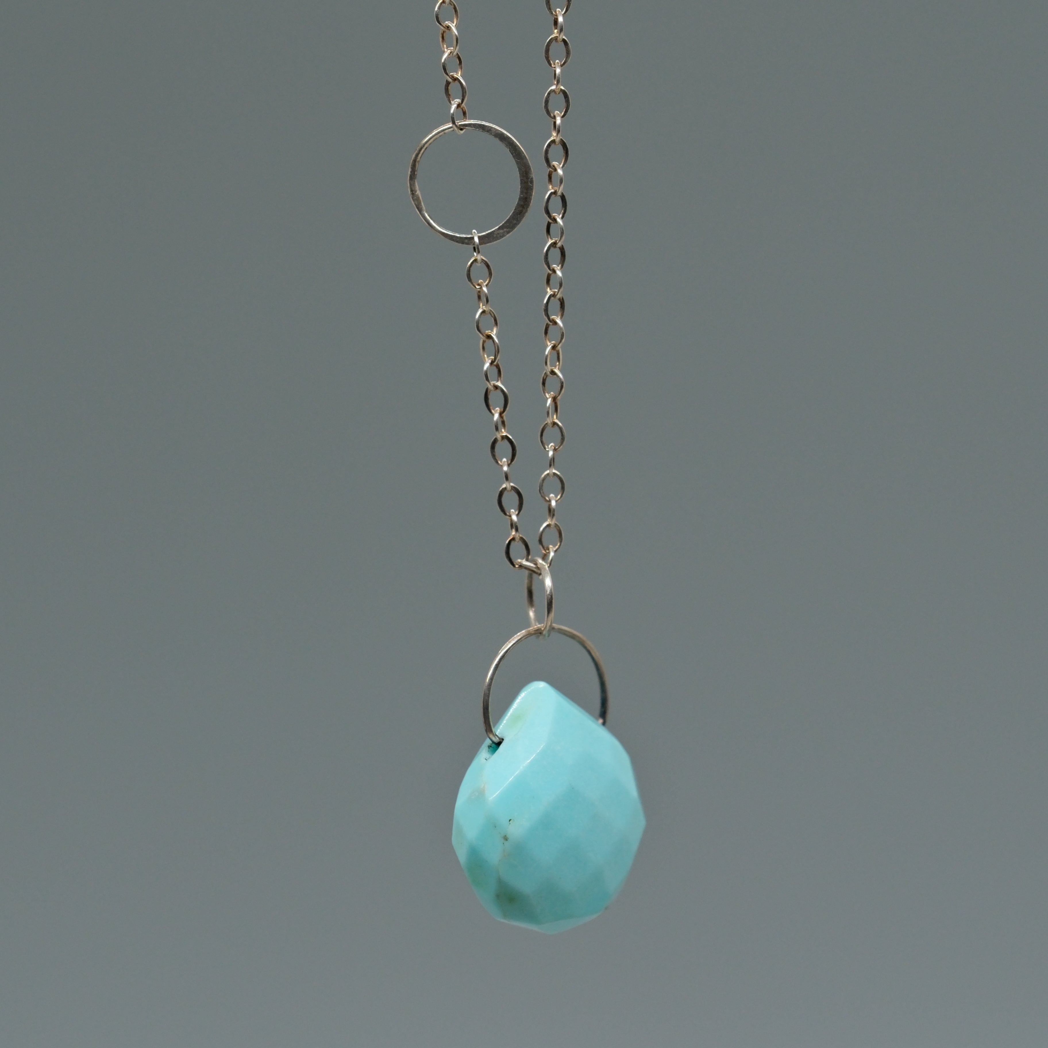 Simple, elegant, and effortlessly modern, this necklace features a faceted Turquoise suspended from a delicate sterling silver chain. A subtle open-circle detail adds a contemporary touch, making the piece feel unique without overwhelming your look. Perfect for everyday wear, it brings a soft pop of color and refined minimalism to any outfit.