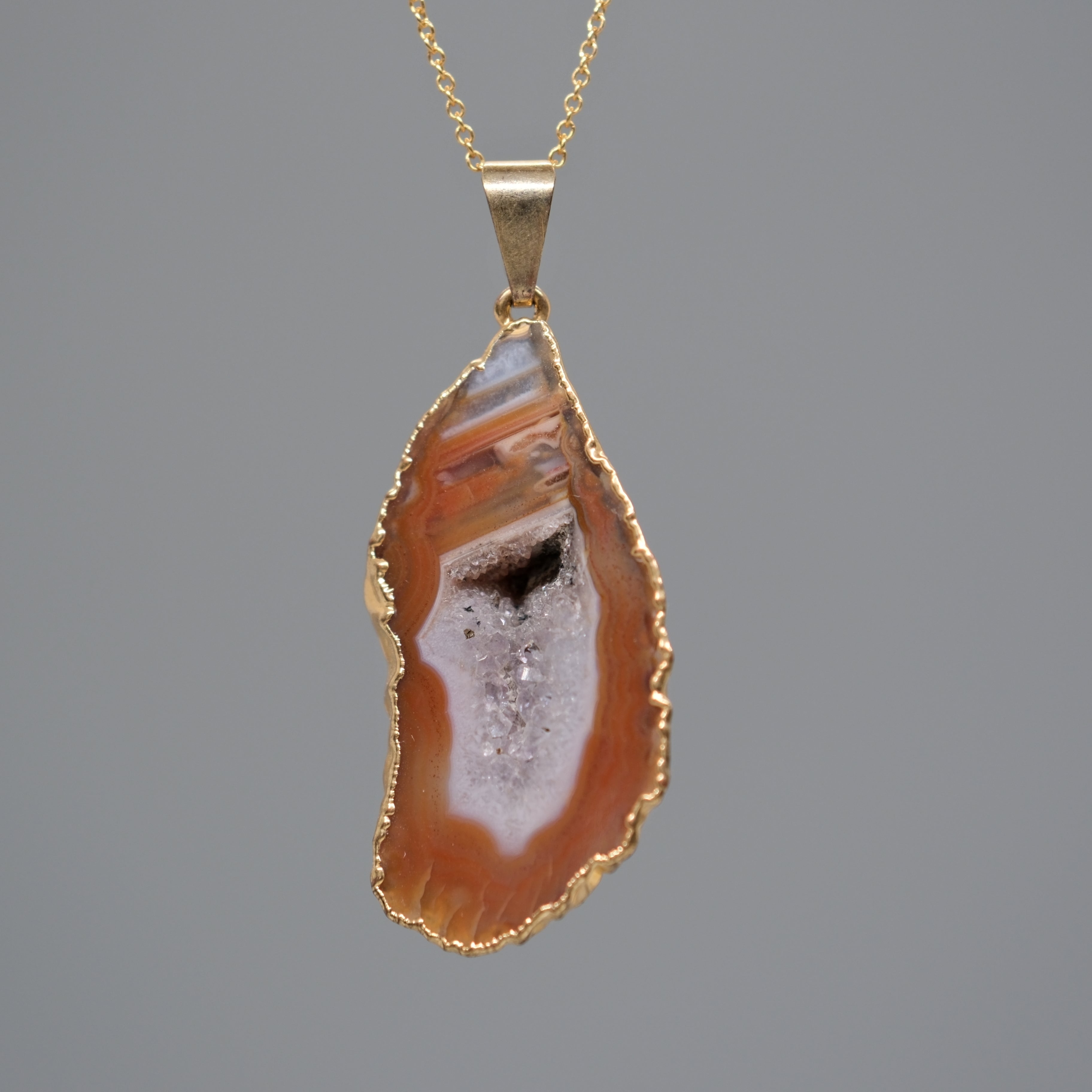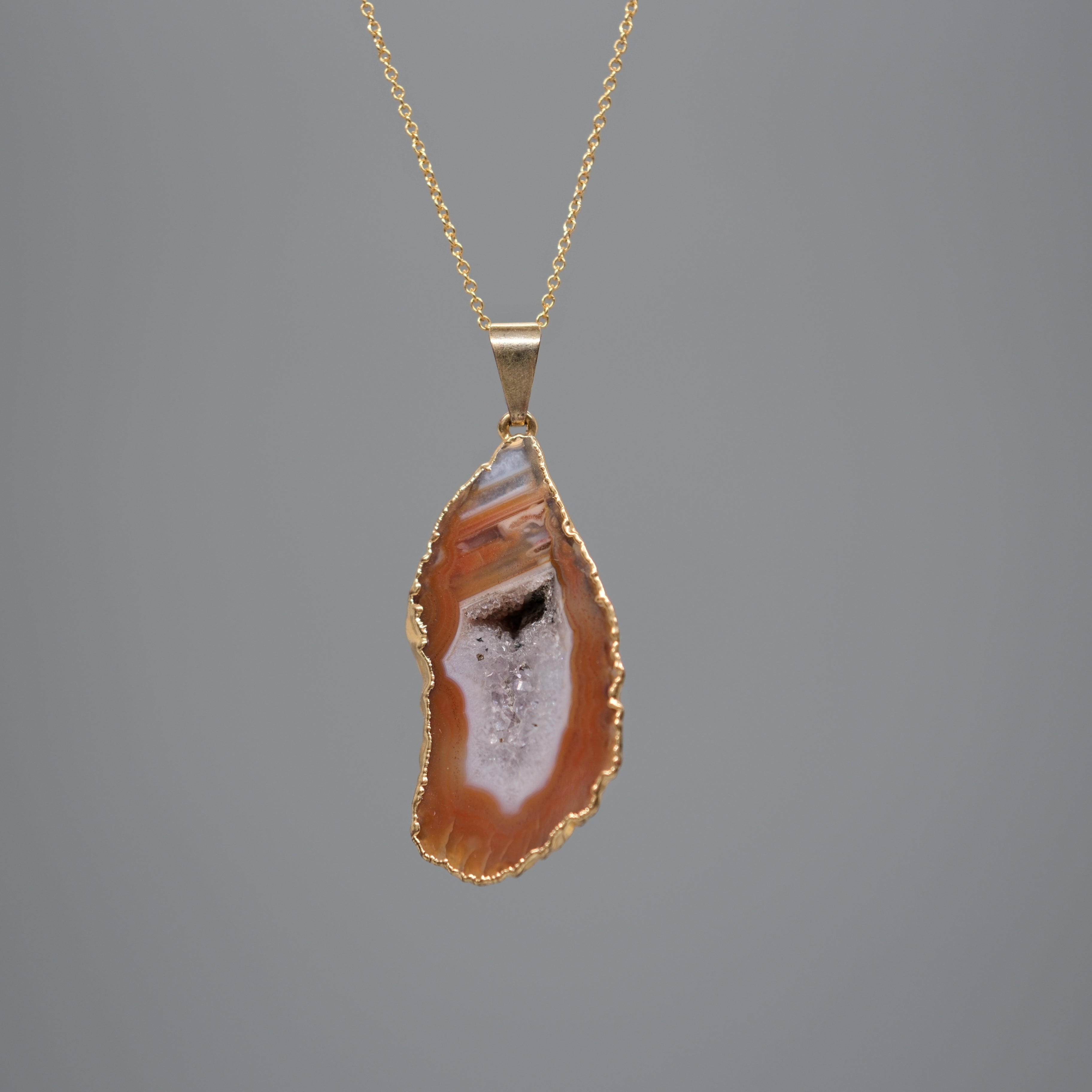 A statement piece inspired by nature’s artistry, this necklace features a raw-edged agate slice framed in gold and suspended from a delicate 14k gold-filled chain. Each pendant showcases unique patterns and crystal formations, ensuring no two are alike.