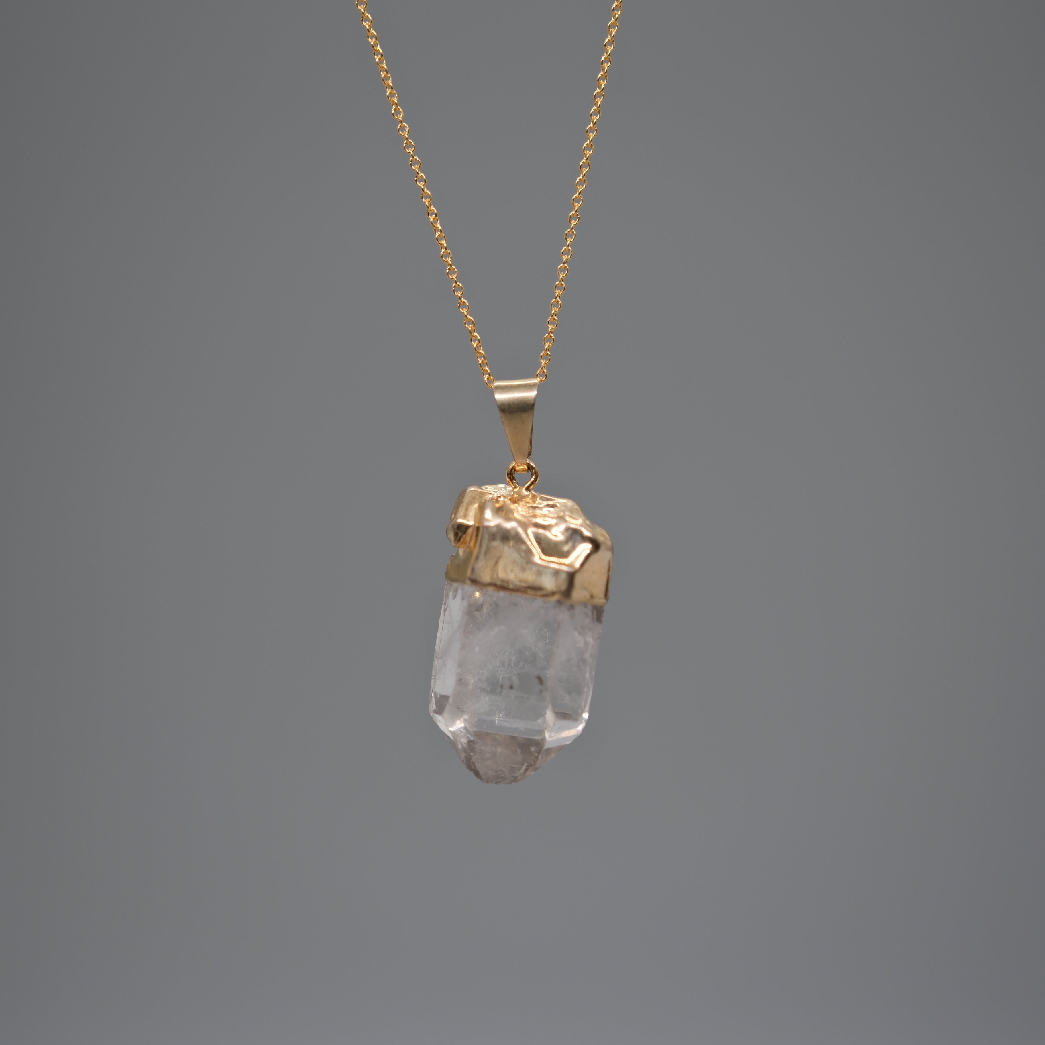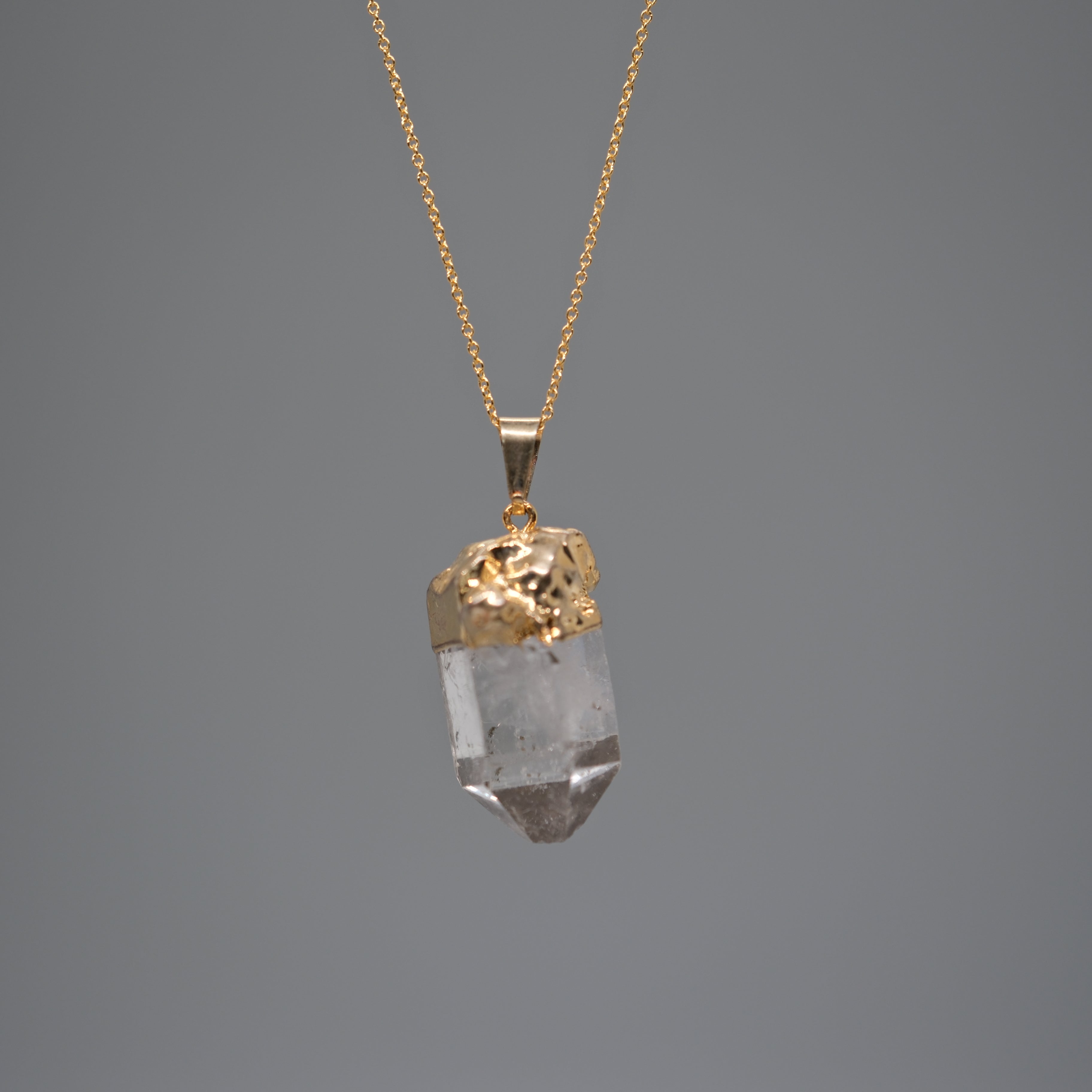 Elegant, radiant, and full of clarity. This necklace features a raw clear quartz crystal capped in 14k gold plated detailing, suspended from an 18-inch gold-filled chain.