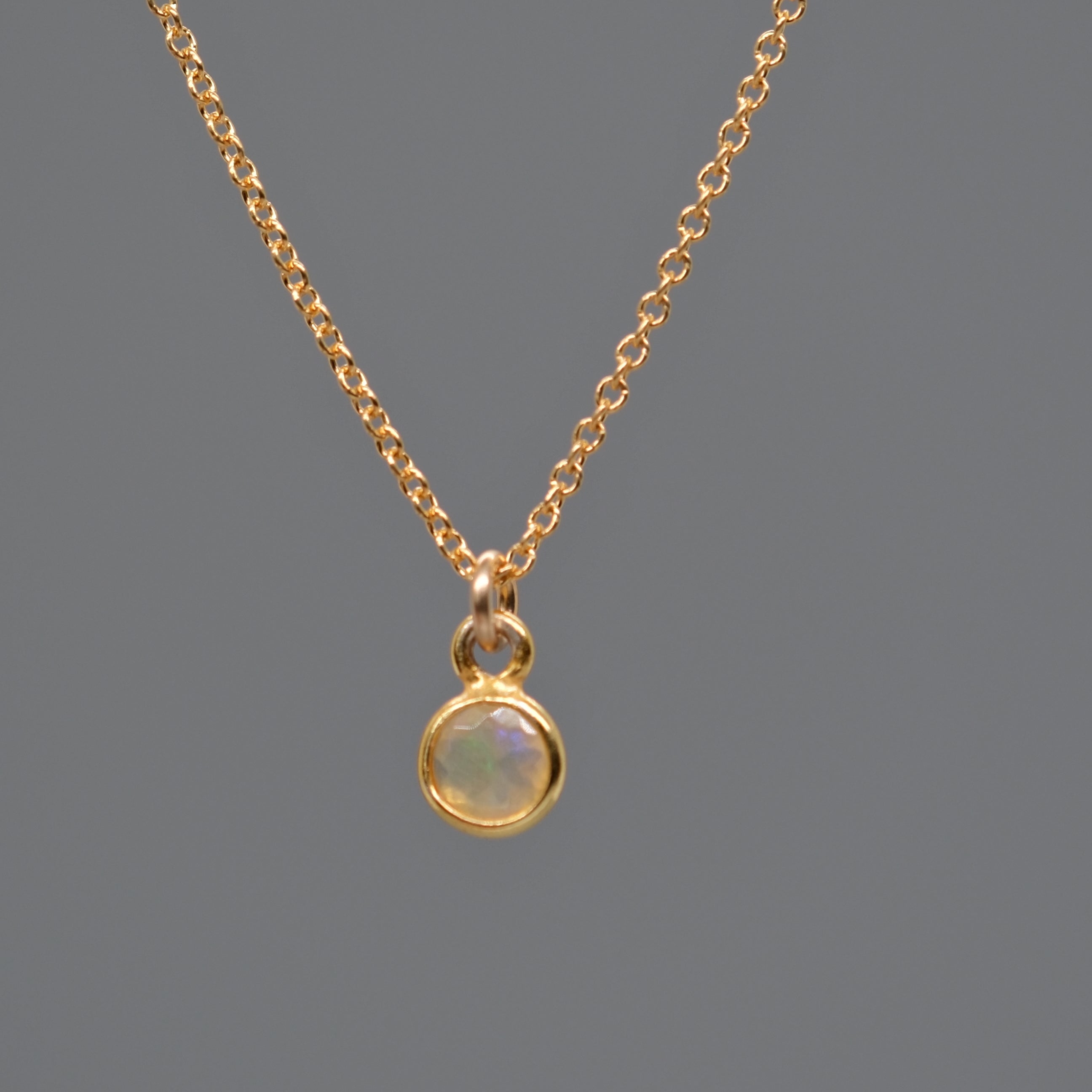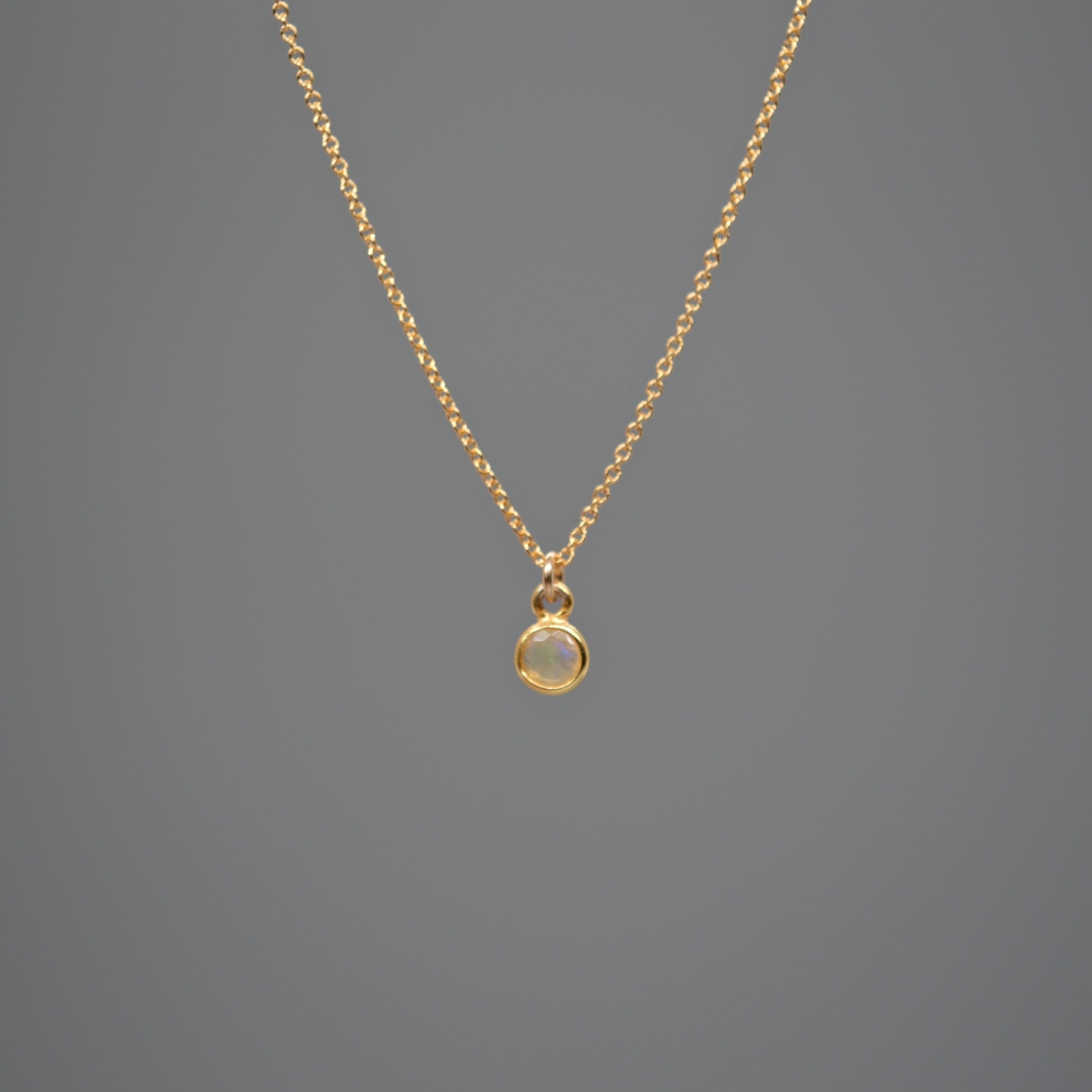 Elegant and timeless, this round Ethiopian opal necklace shimmers with flashes of soft rainbow hues. The faceted stone is set in a gold-plated sterling silver bezel and paired with an 18” gold-filled chain, a delicate piece perfect for layering or wearing solo for a subtle, ethereal glow.