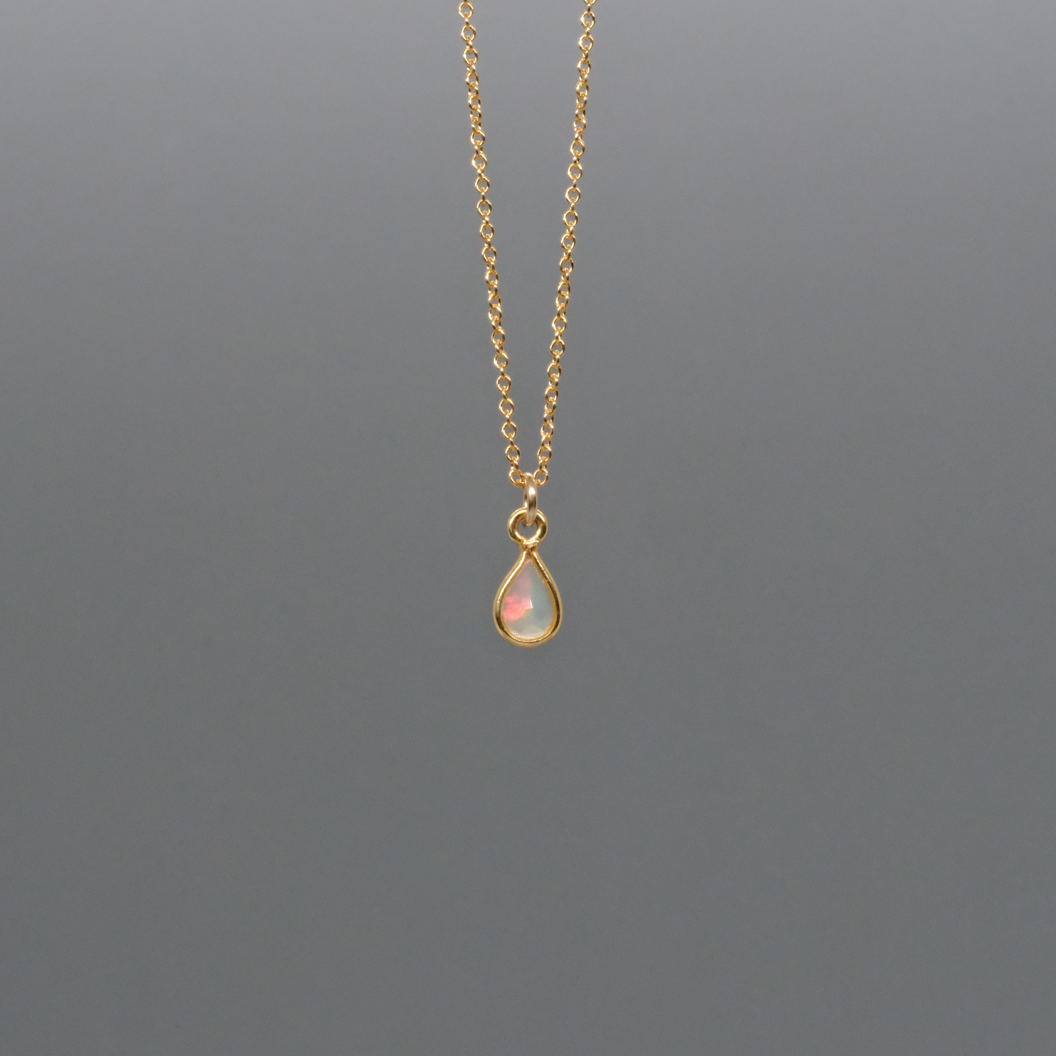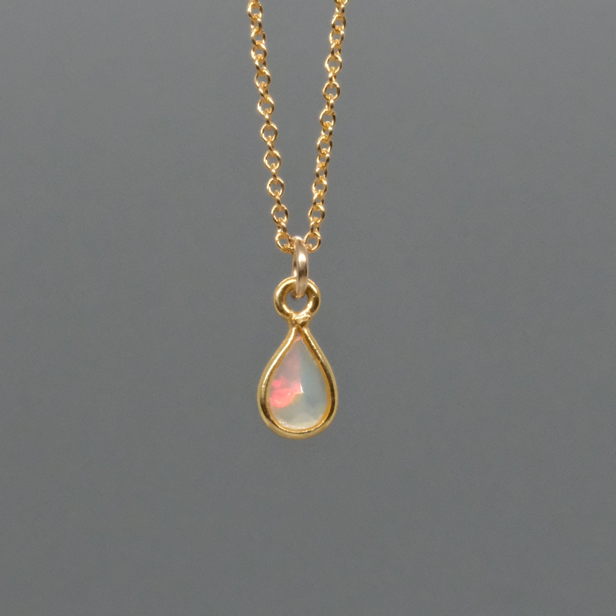A soft, elegant shimmer defines this dainty teardrop Ethiopian opal necklace. The opal’s natural play of color glows with hints of pink, green, and gold, set in a gold-plated sterling silver bezel.