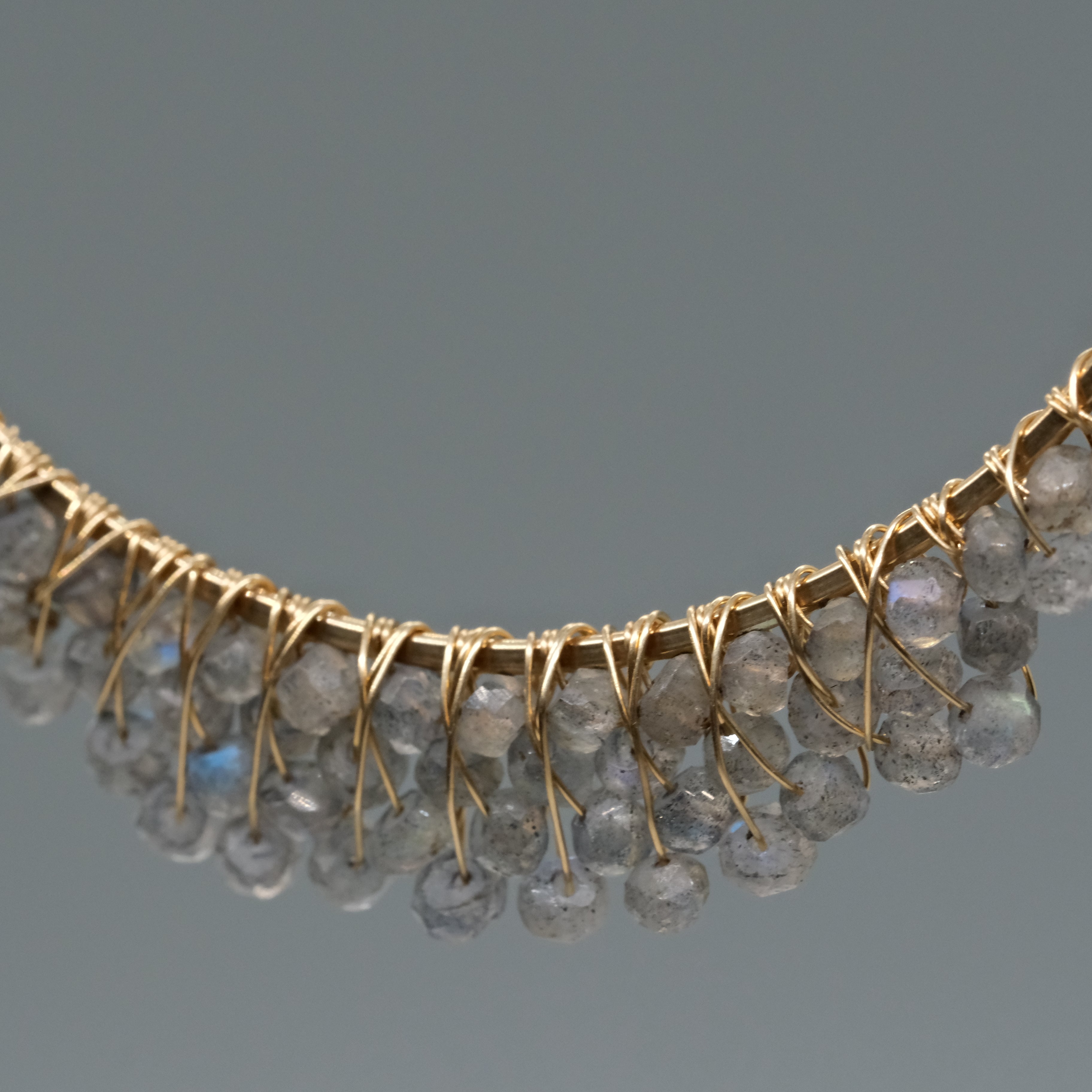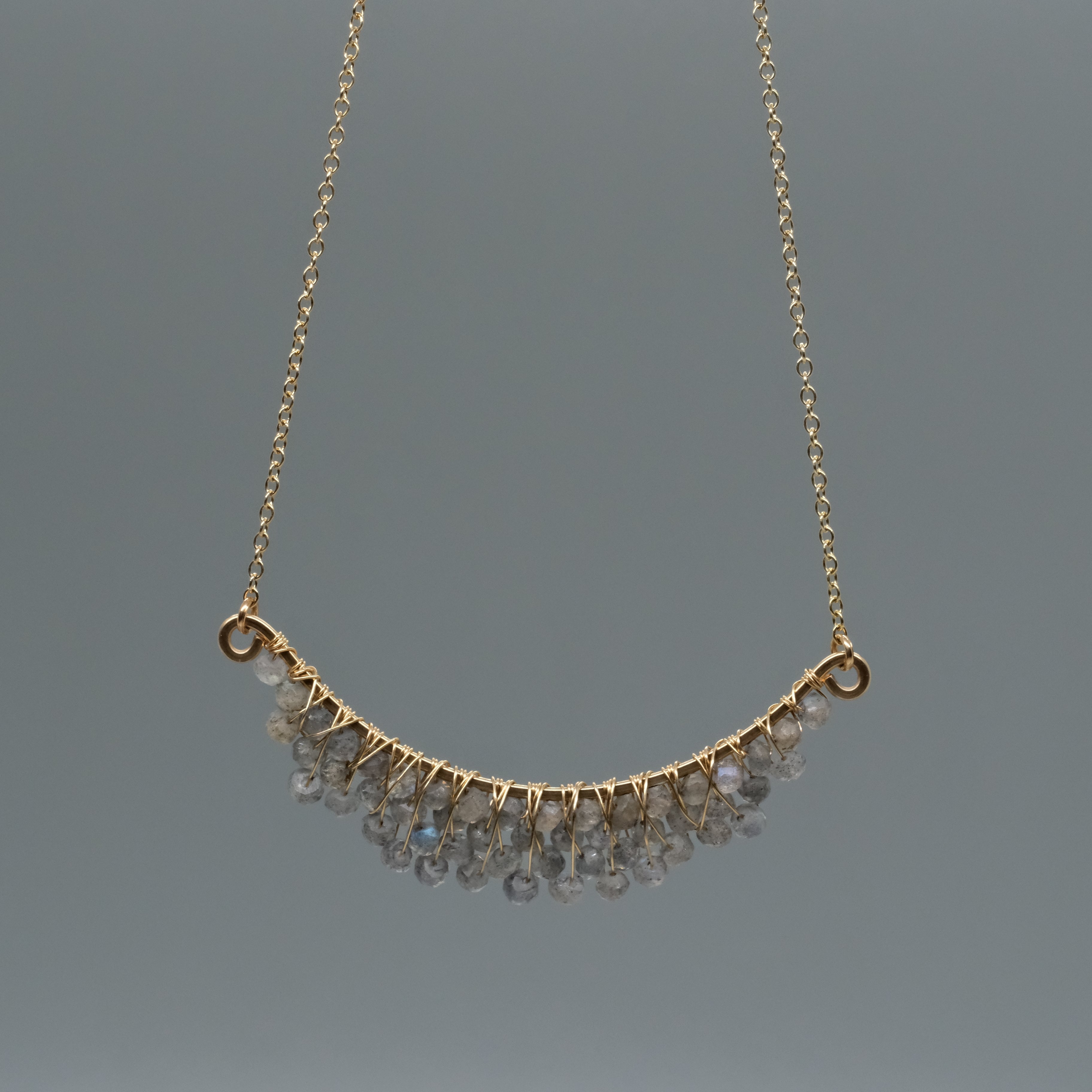 Delicate and full of shimmer, this 14k gold-filled necklace features a graceful arc of hand-wrapped labradorite stones. Each tiny gem catches the light with flashes of blue and gray, creating a soft, elegant sparkle that feels both earthy and refined.