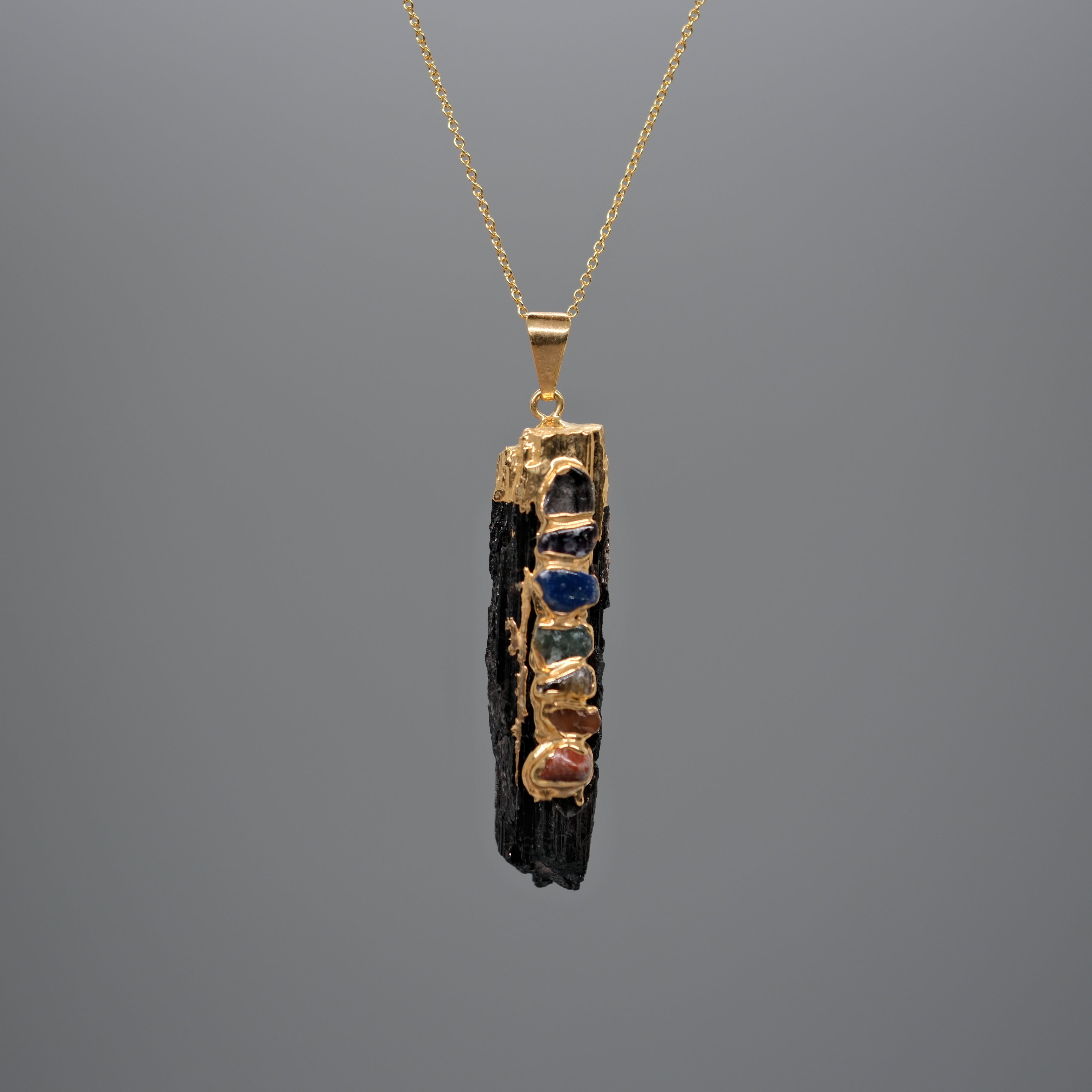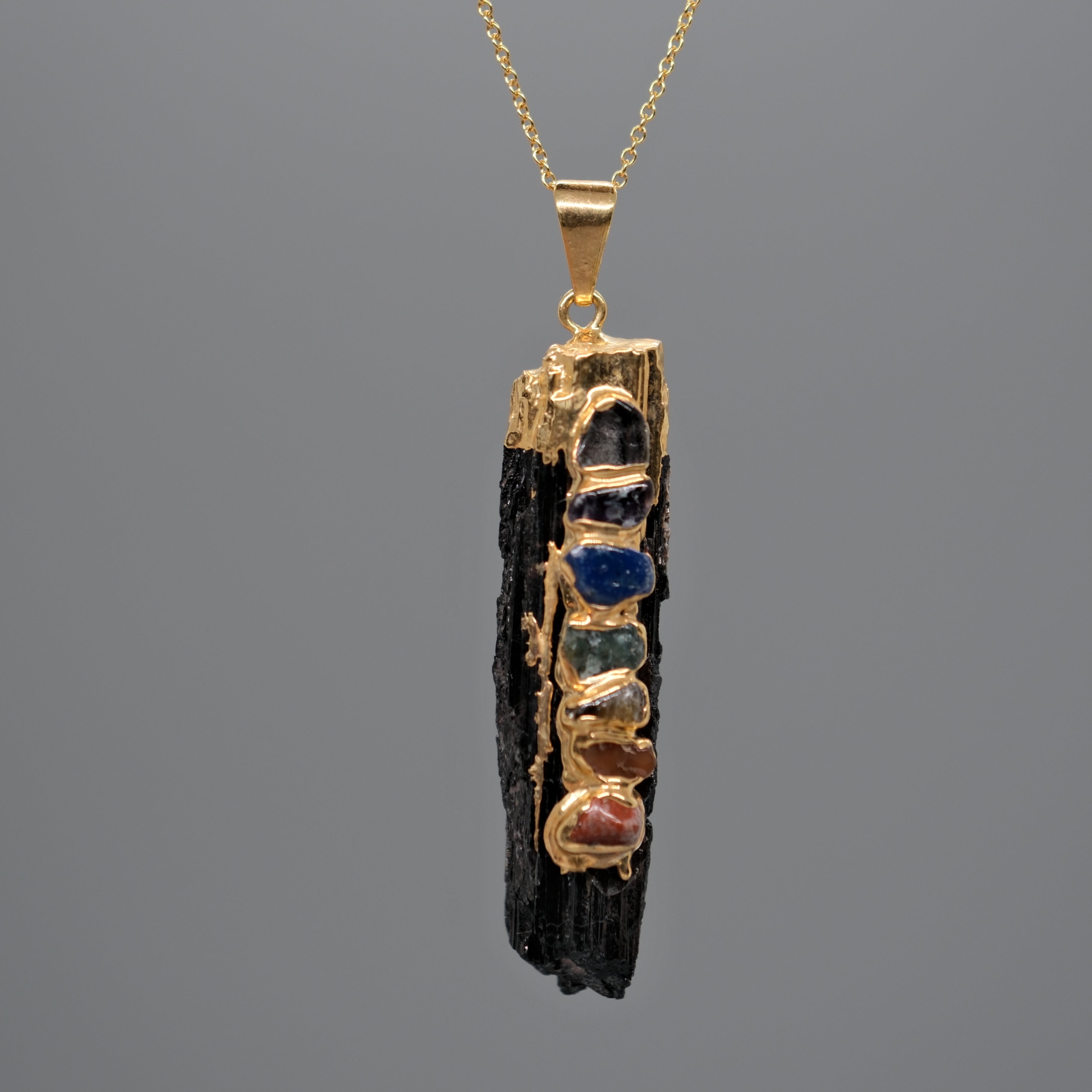 A grounding yet vibrant piece, this necklace features a raw black tourmaline pendant adorned with seven natural chakra stones, each representing energy alignment and balance. The rich black base beautifully contrasts with the rainbow of gemstones, set in gold for a striking finish.