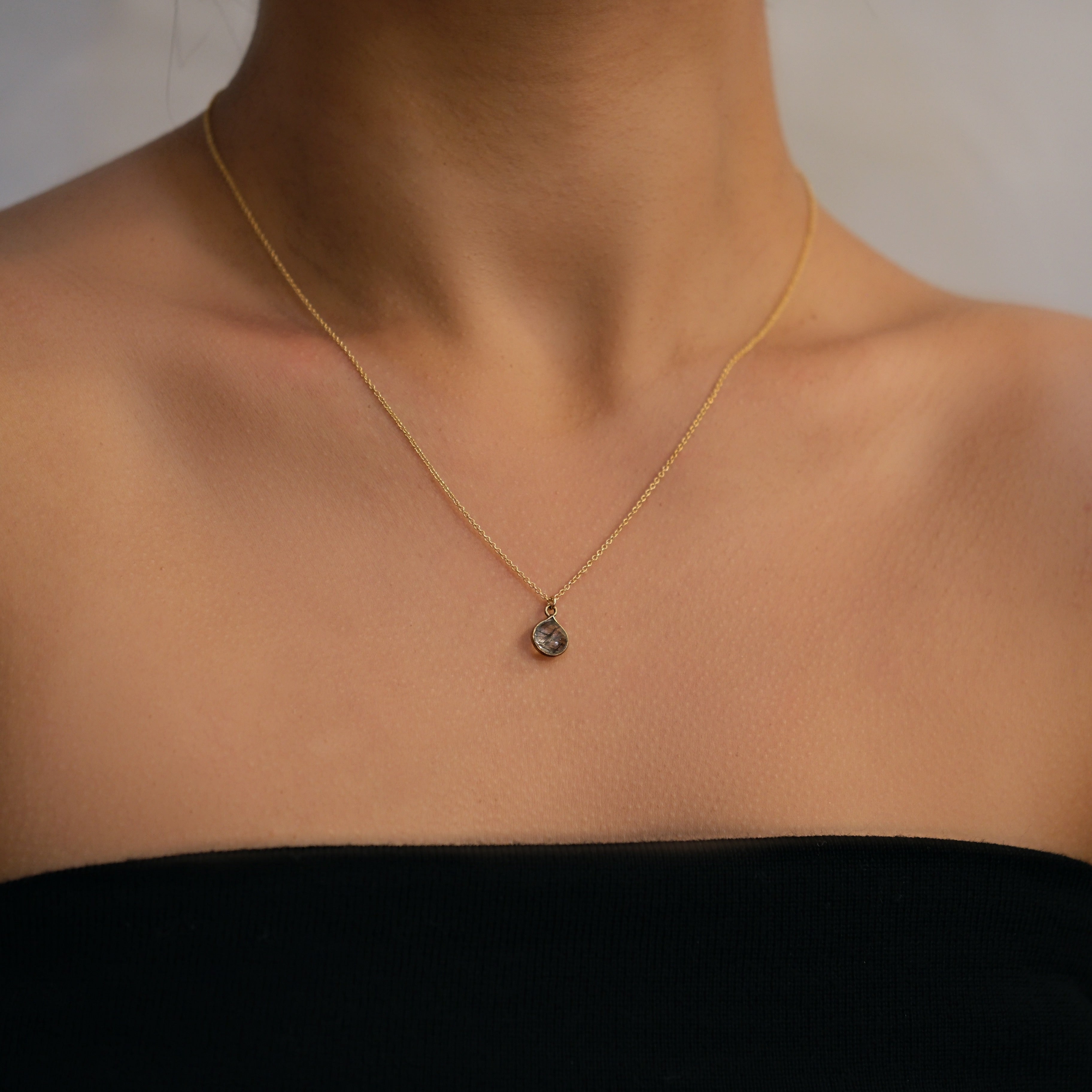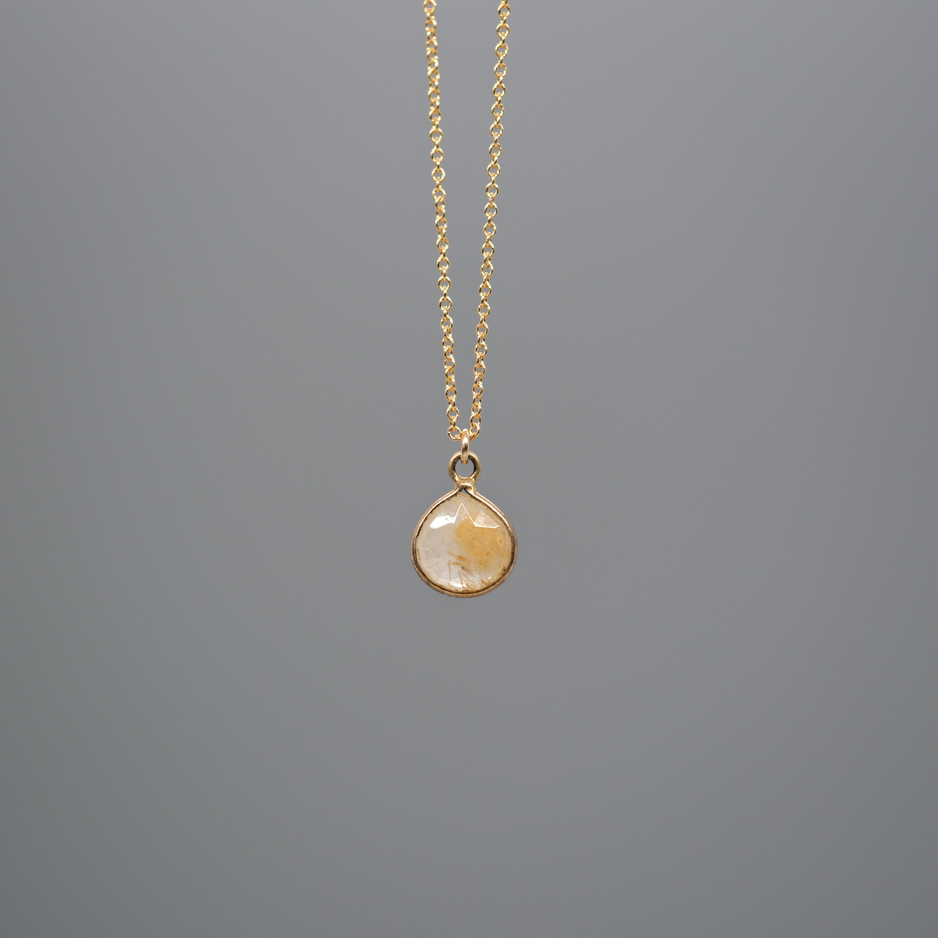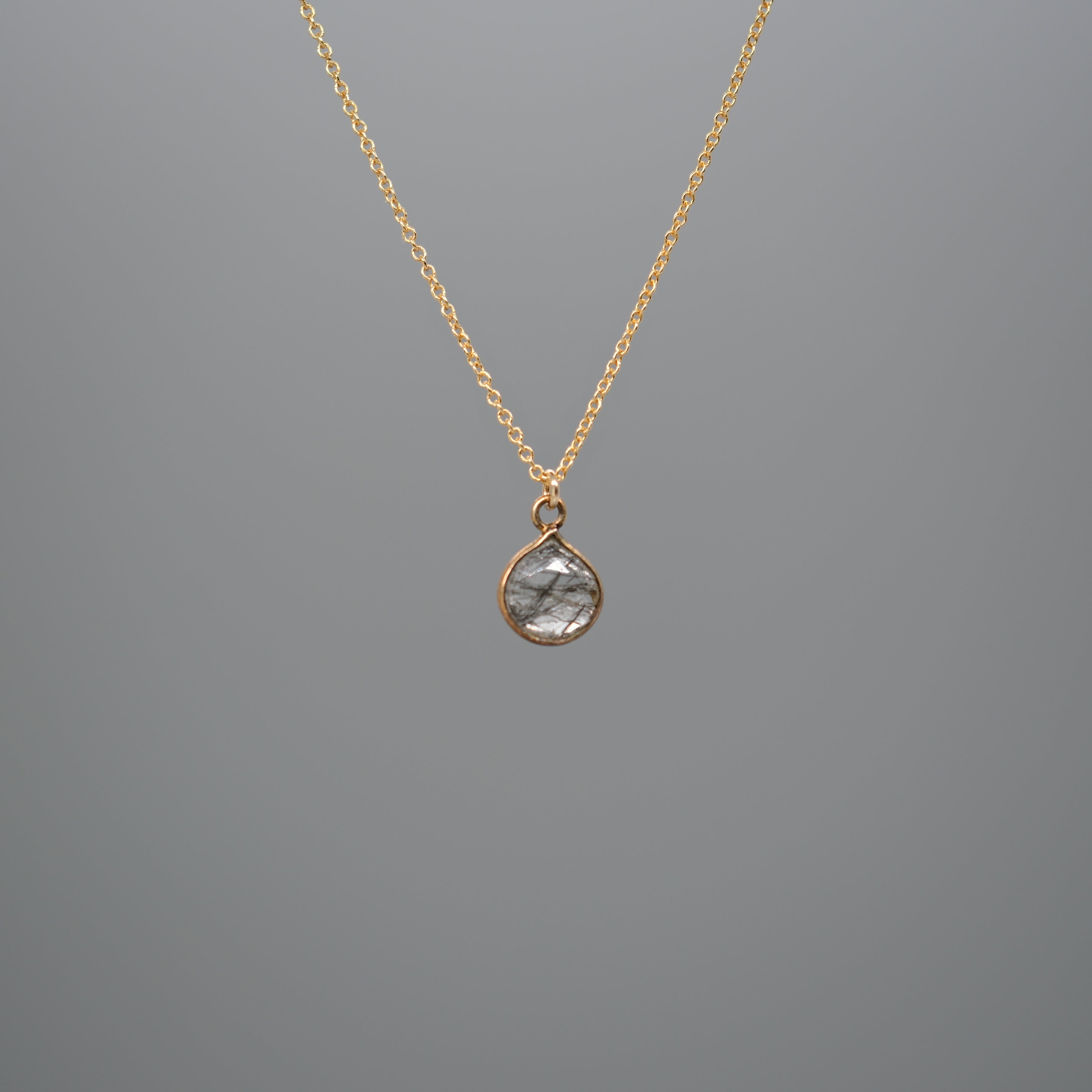 Delicate and full of character, this 14k gold-filled necklace features a petite faceted rutilated quartz gemstone framed in gold-plated sterling silver. Each stone has its own unique pattern of golden or black threads, subtle details that make every piece one of a kind.