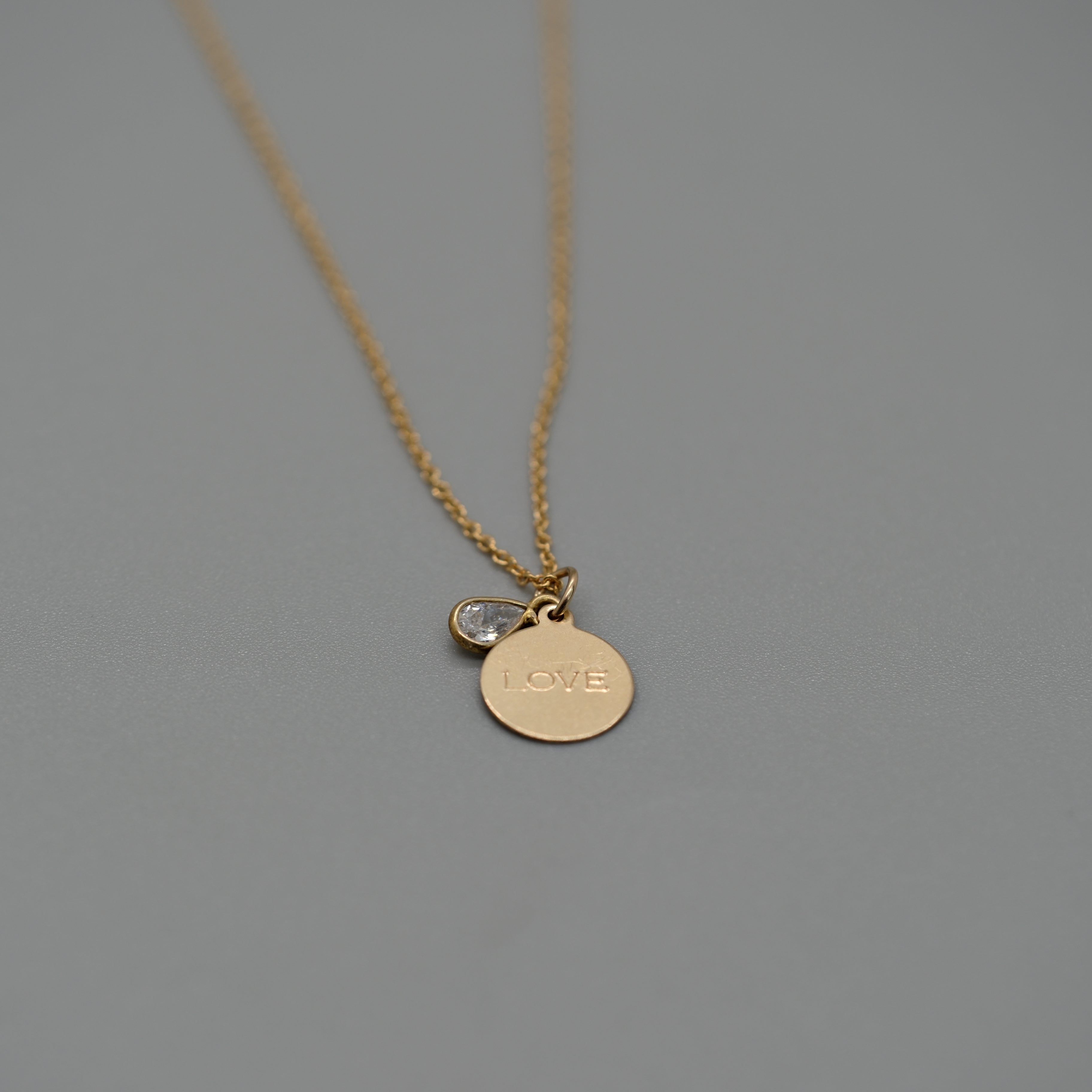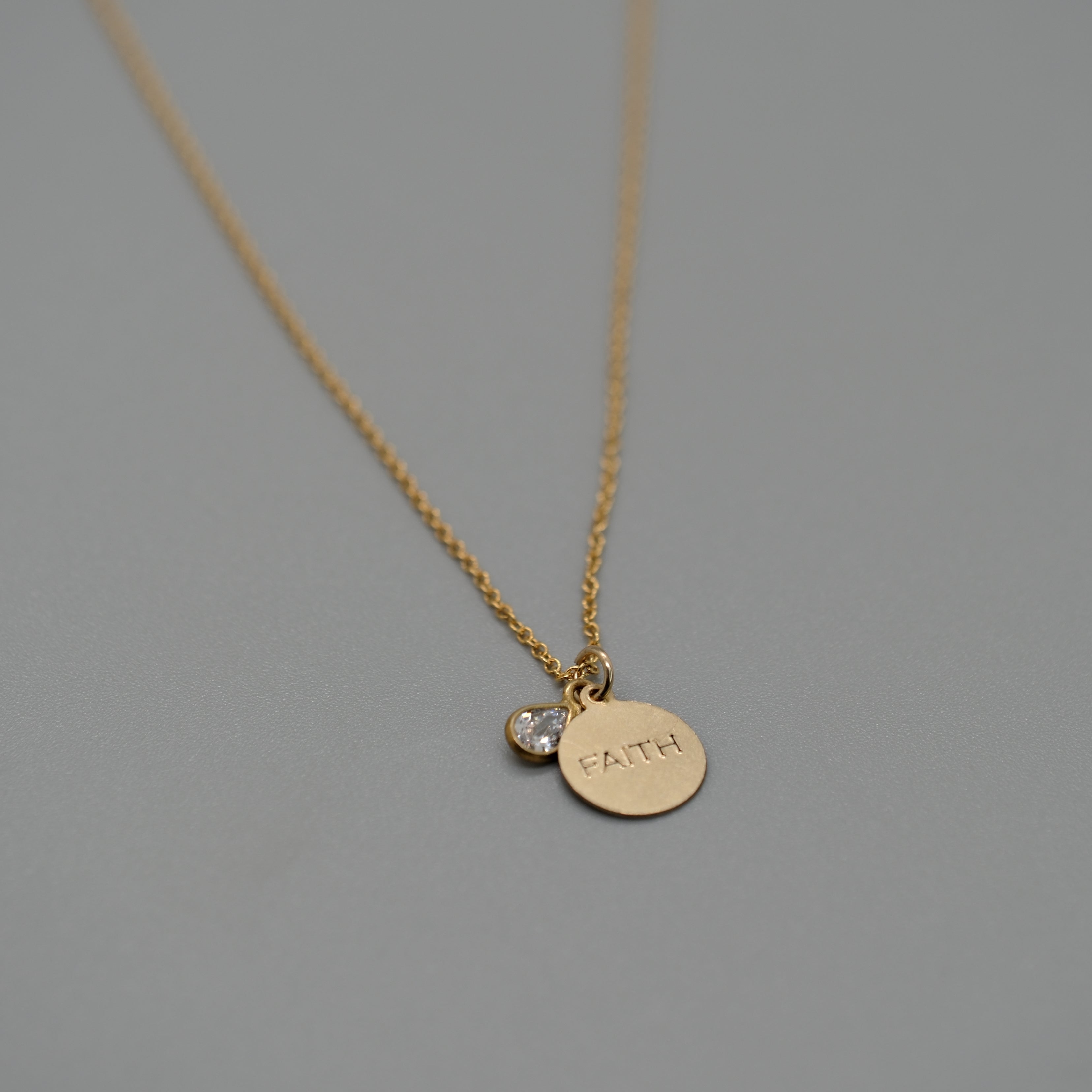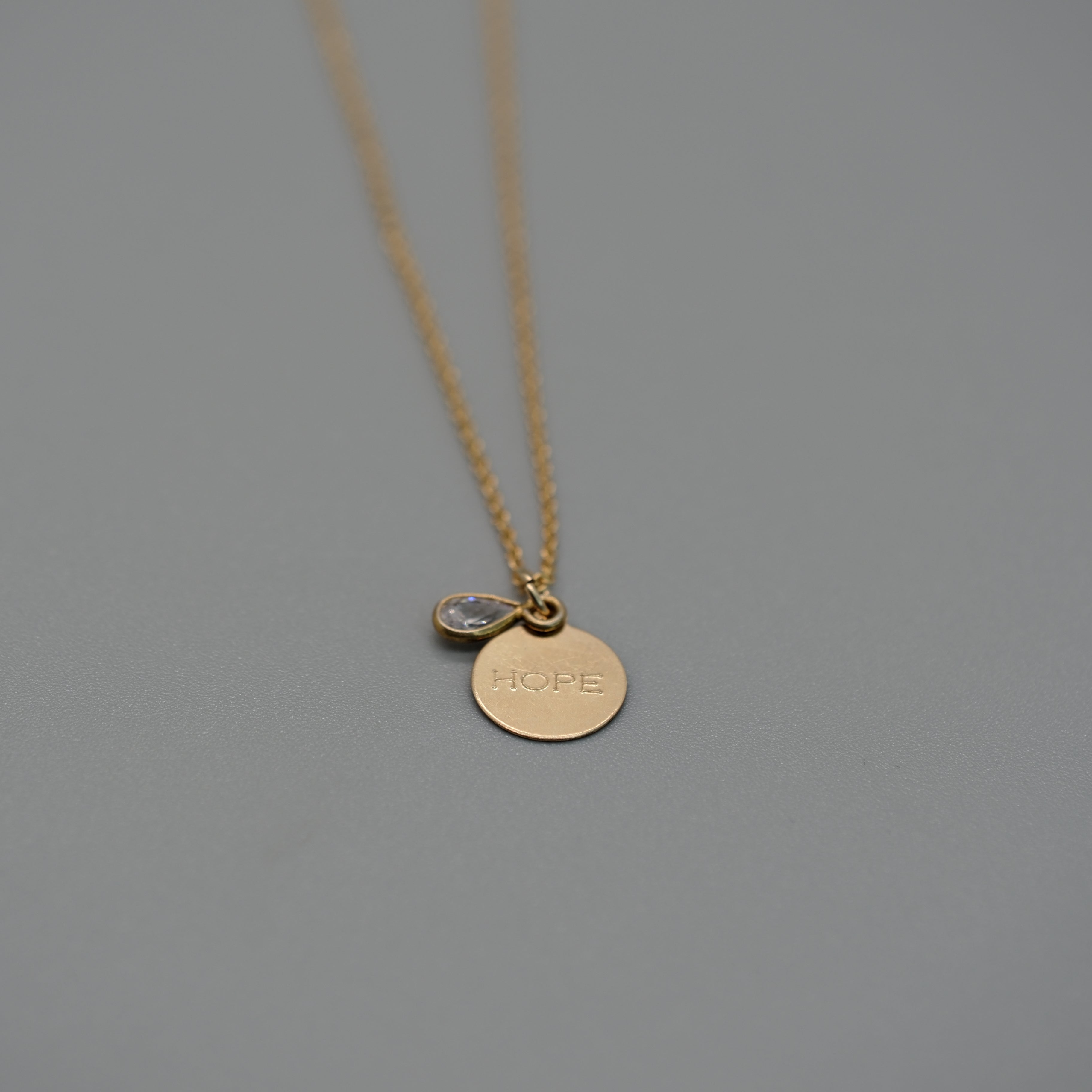Carry a little light with you wherever you go. This delicate 14k gold–filled necklace features a petite round charm engraved with HOPE, paired with a sparkling CZ teardrop for a soft touch of shine. Designed at an 18" length, it layers effortlessly or stands beautifully on its own. A meaningful everyday piece available in Hope, Love, and Faith.