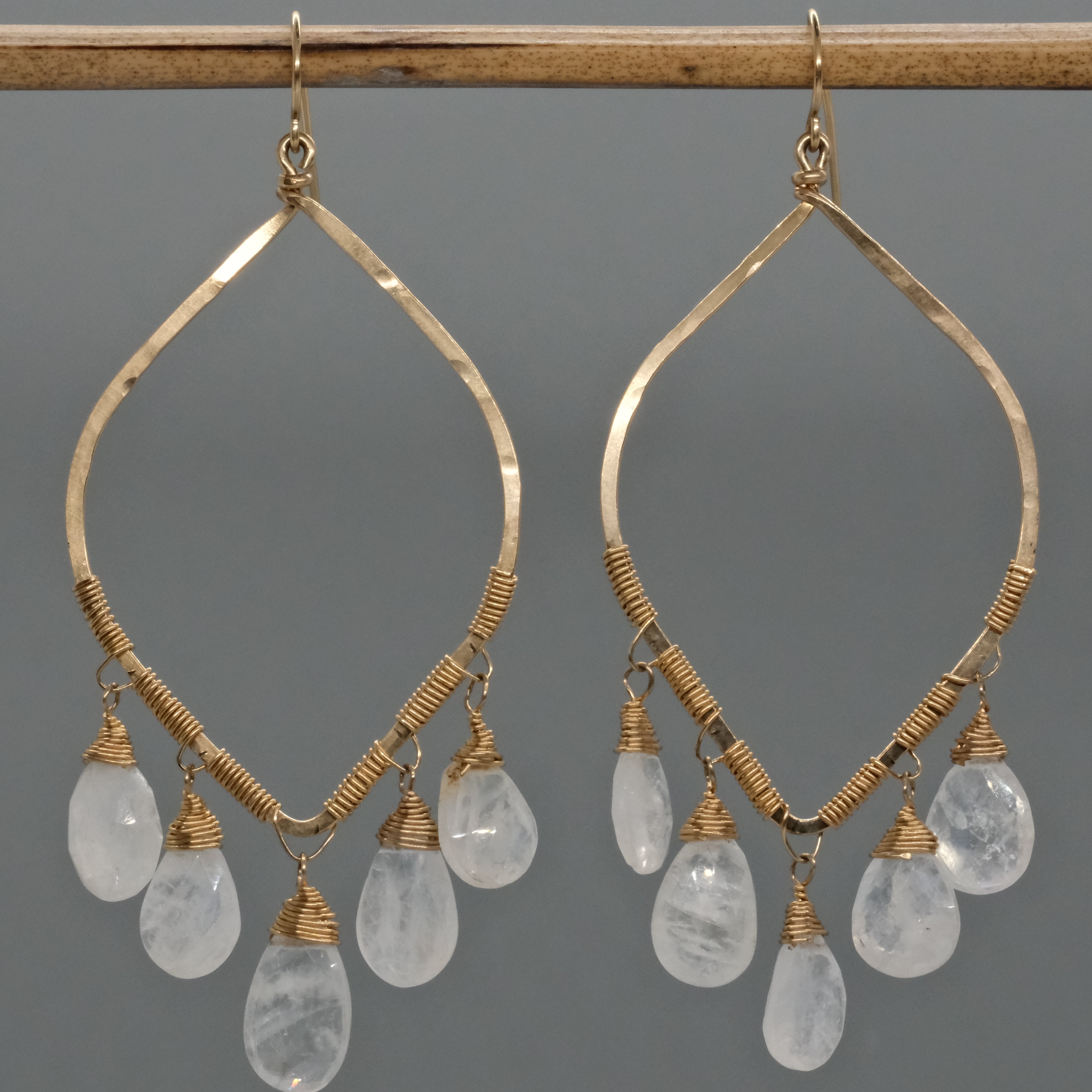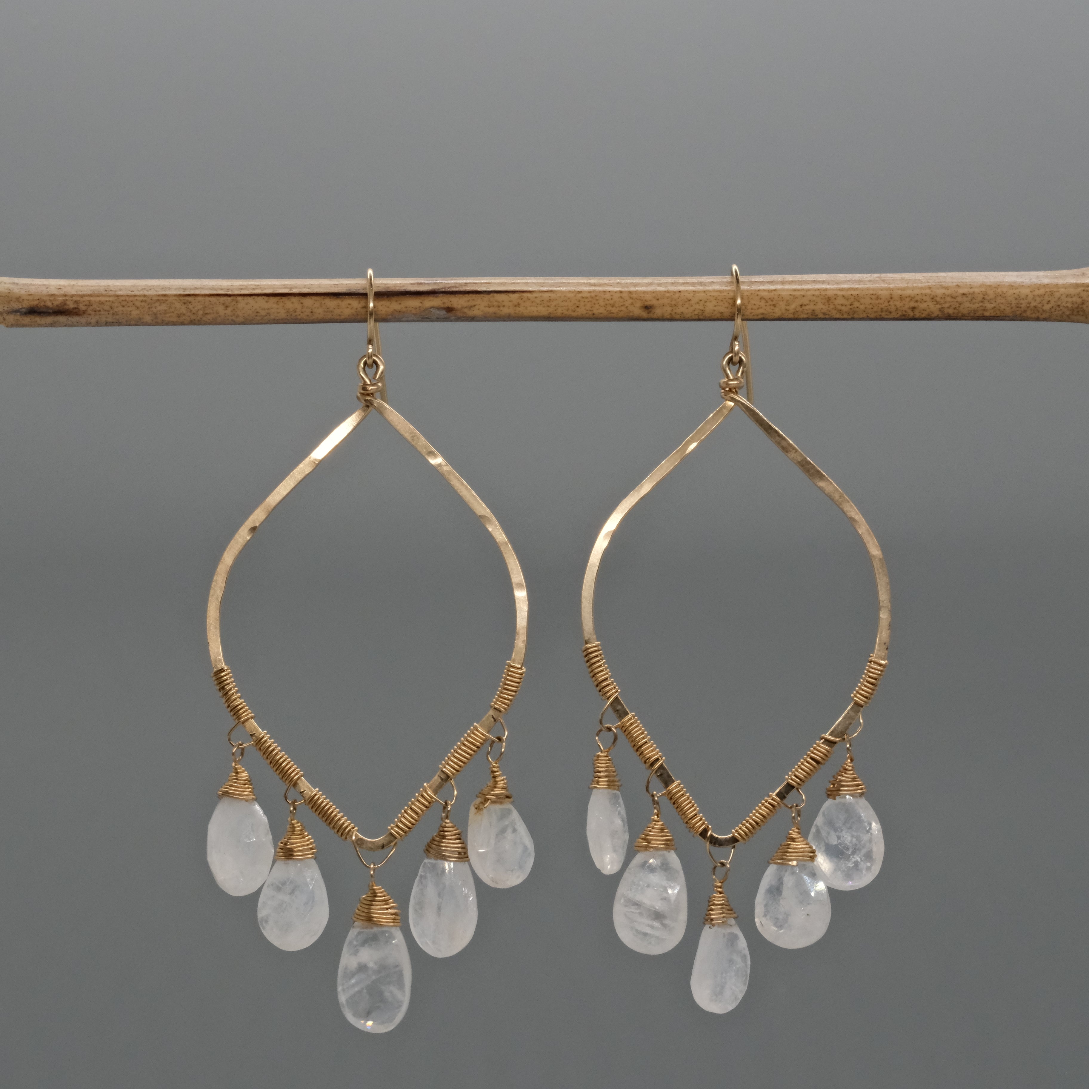 Crafted from 14k yellow gold filled, these earrings feature moonstones and measure 3.1” X 1.3”, including the fish hook. Please note that every natural stone is unique, so color and shape may vary slightly.