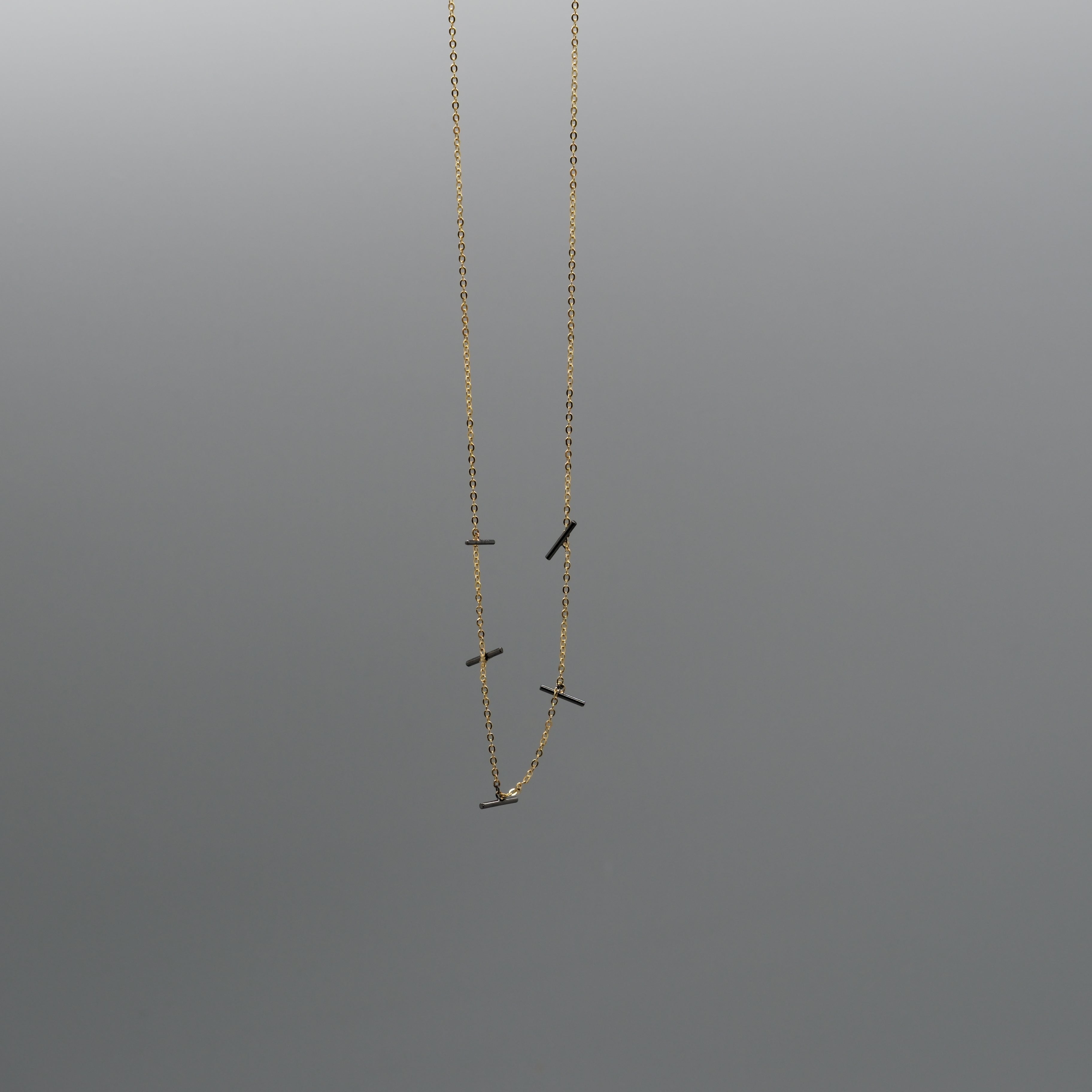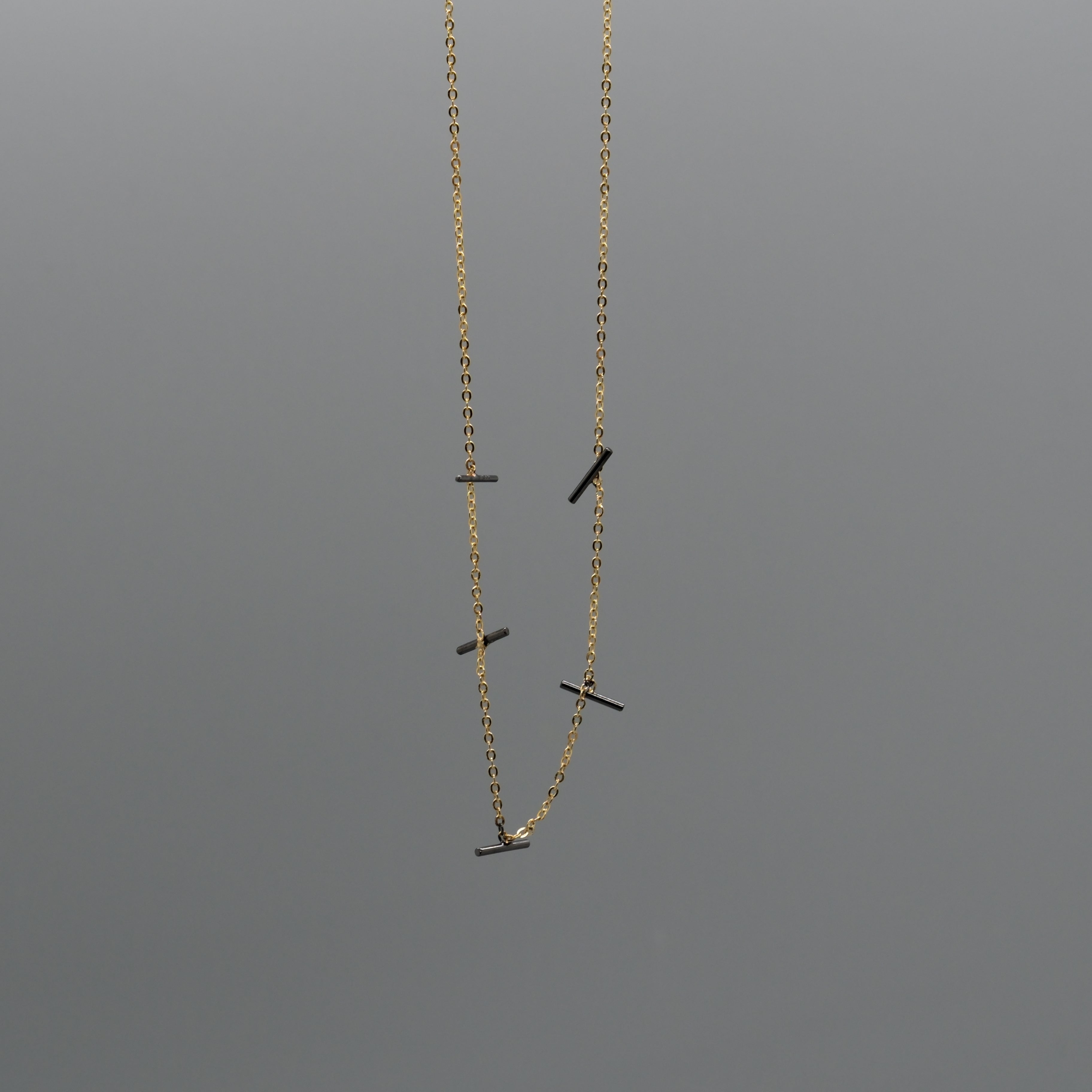 Add an edgy twist to your everyday style with this mixed-metal necklace, crafted in 14k gold–plated sterling silver and accented with sleek oxidized silver bar charms. The contrast between warm gold and deep, moody black gives the piece a modern, artful vibe that stands out effortlessly. Perfect for layering or wearing solo, this unique design brings a hint of bold sophistication to any outfit, a chic balance of minimalism and attitude.