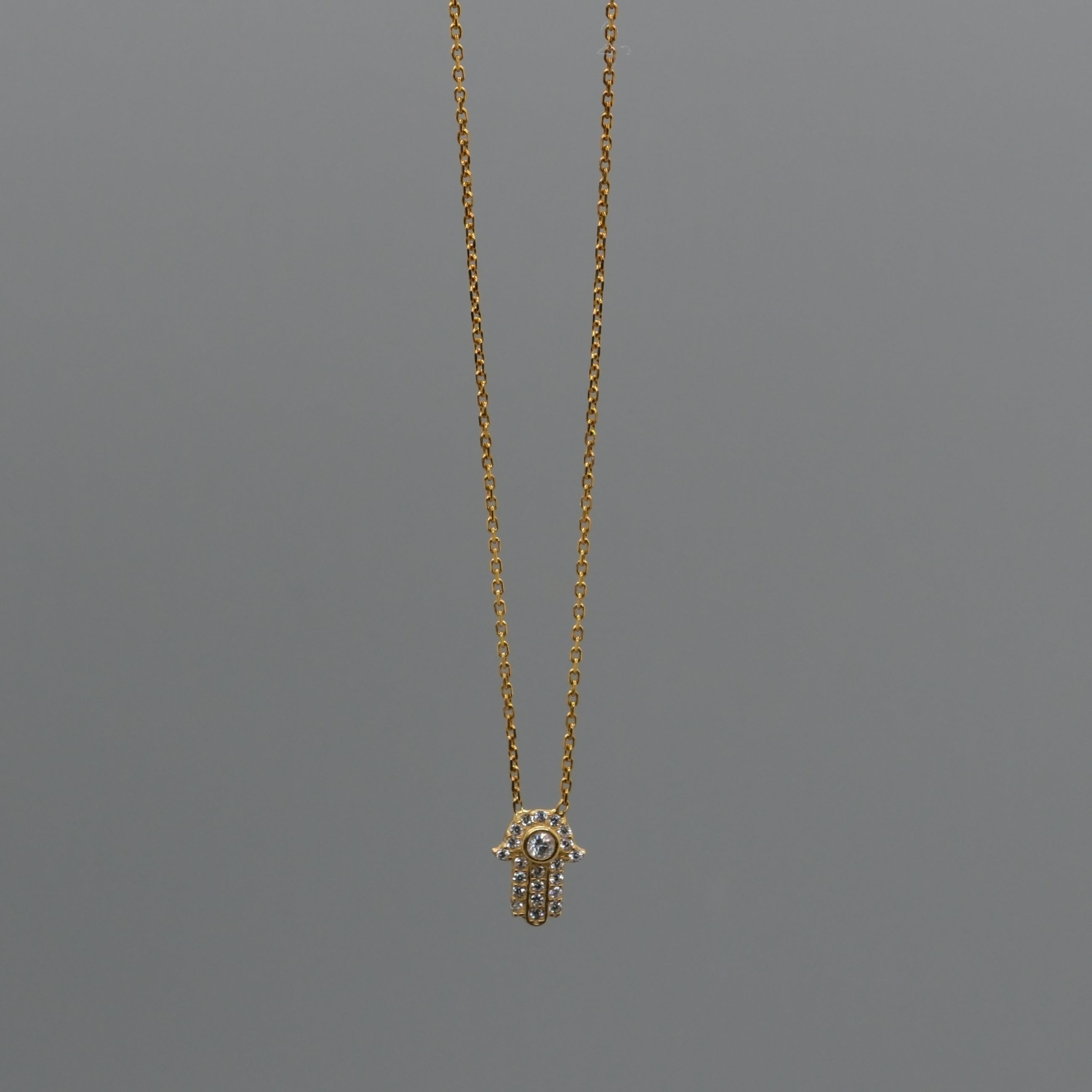 Carry a touch of protection and sparkle with this elegant mini Hamsa necklace. Crafted in 14k gold-plated sterling silver, the pendant features a detailed Hamsa hand adorned with shimmering cubic zirconia and a center evil-eye stone for added meaning. The delicate 18" chain makes it perfect for layering or everyday wear. Symbolizing luck, protection, and positivity, this piece is both meaningful and beautifully understated—ideal for gifting or keeping close.
