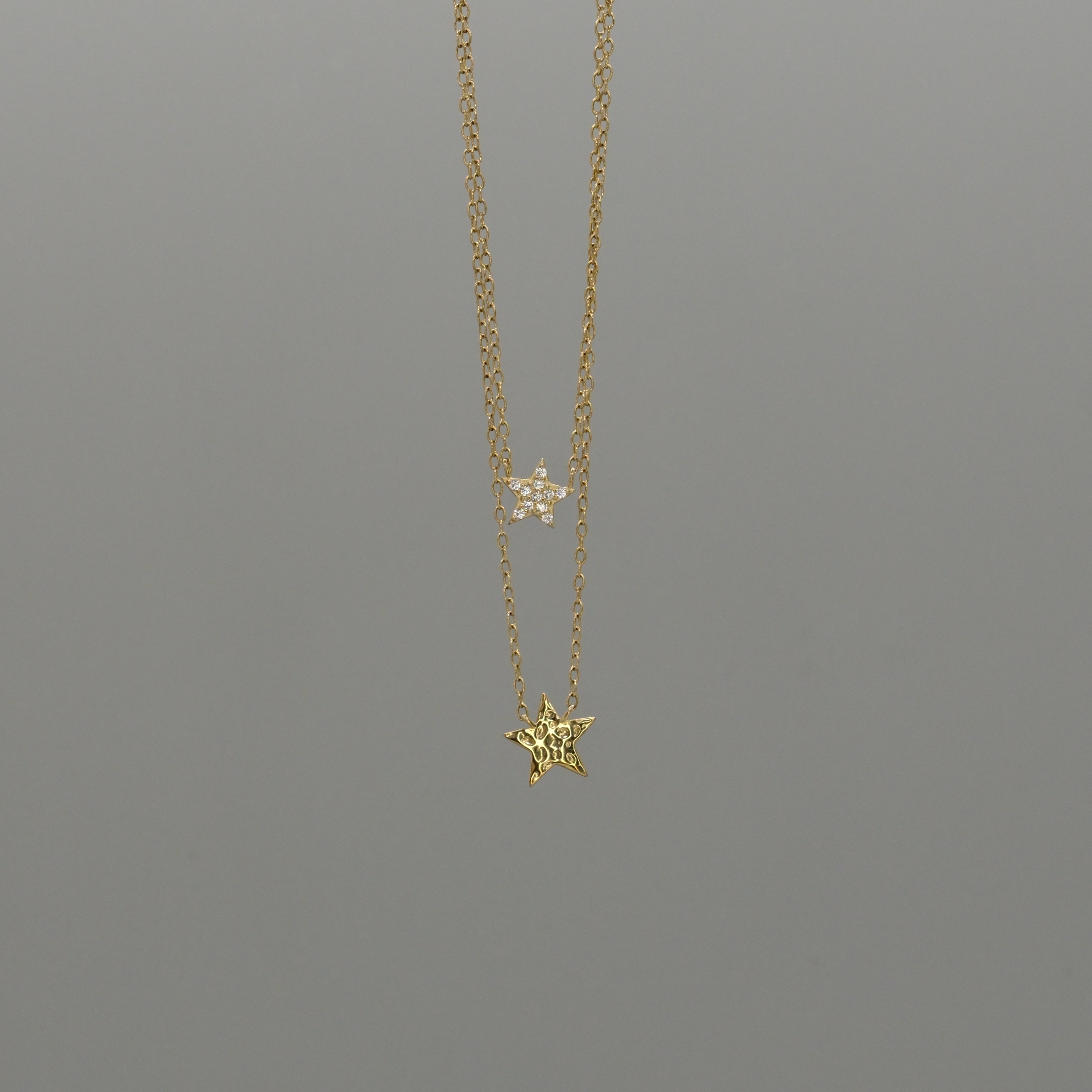 Add a little celestial magic to your everyday look with our Starlit Duo Necklace. This delicate layered piece features two petite star charm, one smooth gold star and one sparkling CZ-studded star, floating on a dainty gold-tone chain. Sweet, simple, and effortlessly radiant, it’s the perfect piece for layering or wearing solo when you want just a touch of shine.