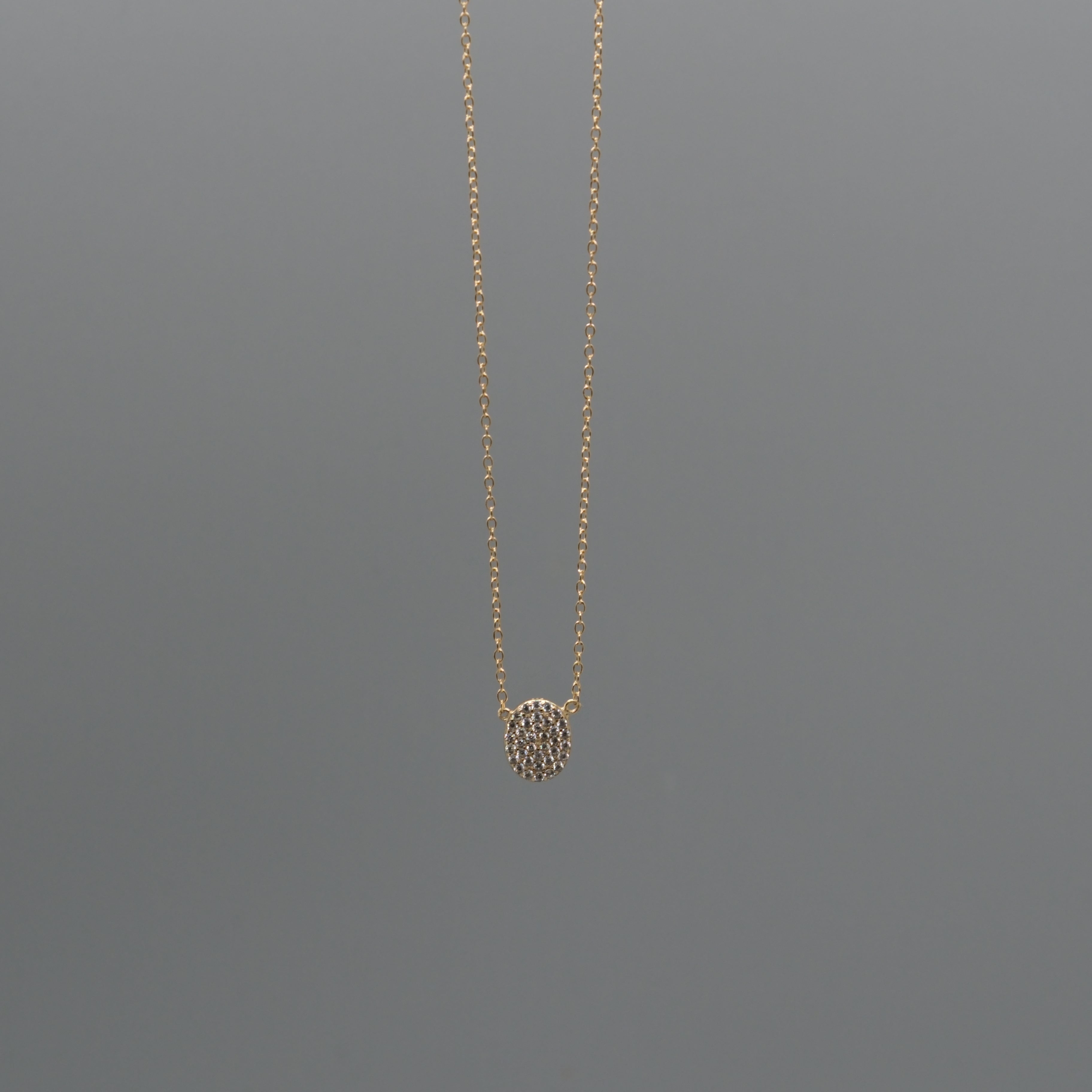 Chic and refined, this 18-inch necklace features a petite oval pendant pavé-set with sparkling cubic zirconia, crafted in 14k gold–plated sterling silver. The dainty design catches the light beautifully, adding a subtle touch of elegance to any outfit. Perfect for everyday wear or layering with other pieces, this minimalist sparkle pendant offers timeless style with a modern, delicate finish.