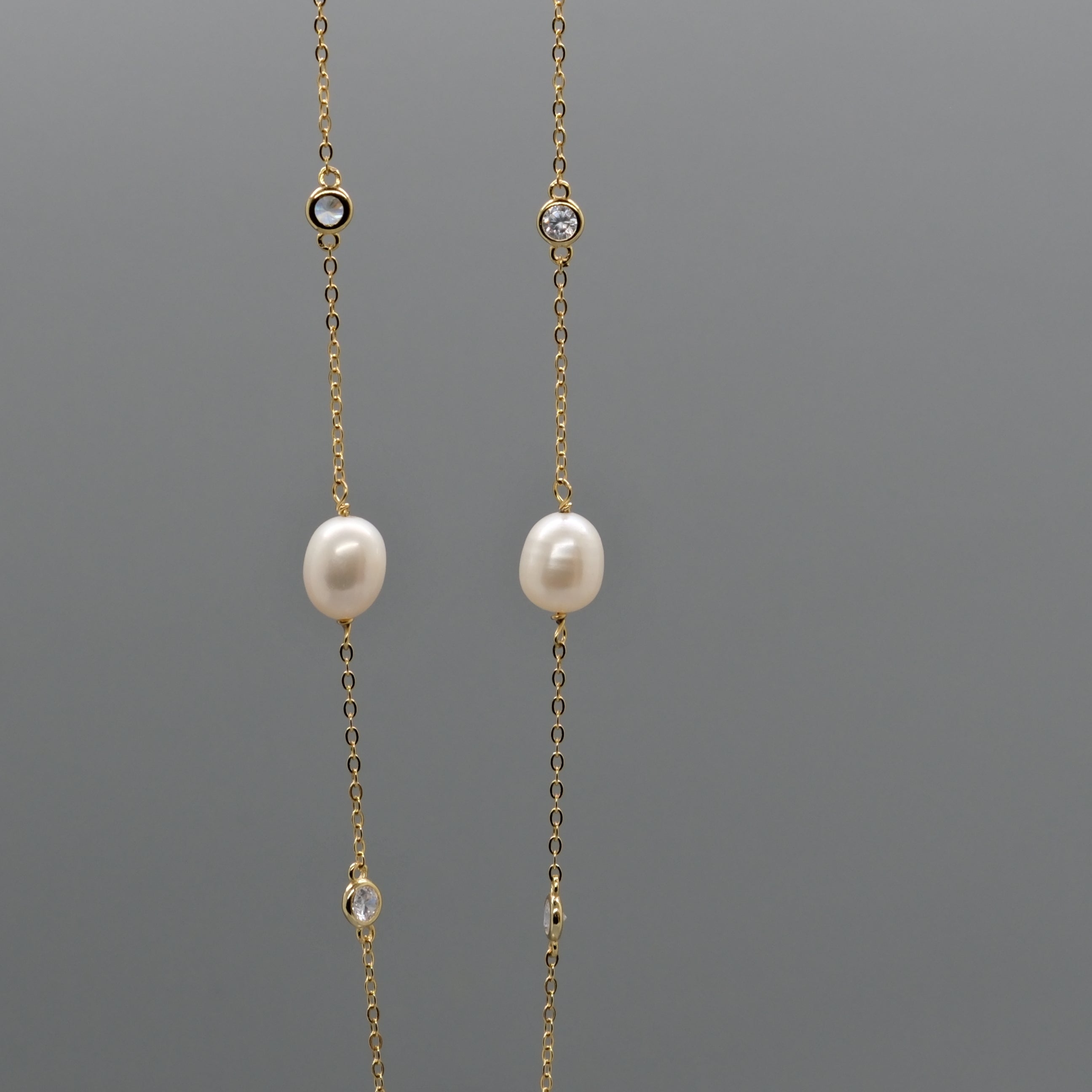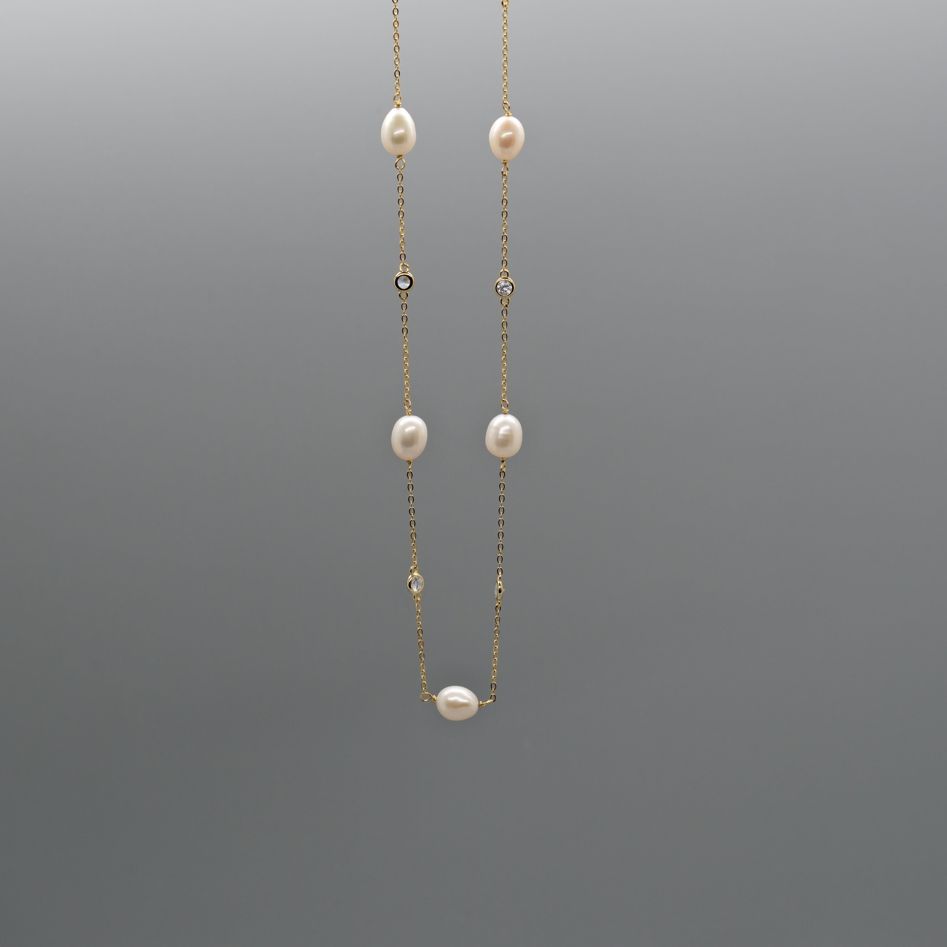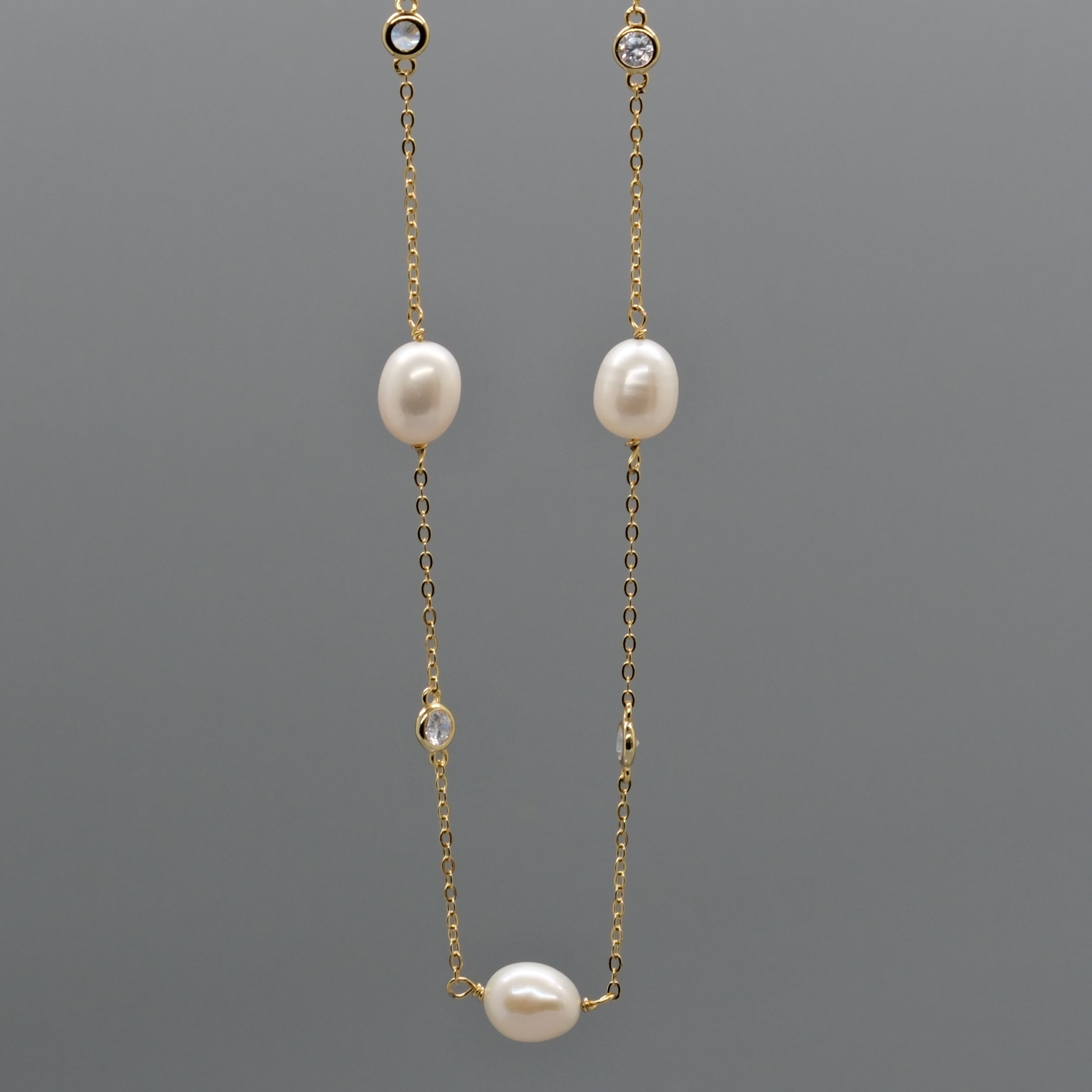 Elevate your look with this elegant 18-inch pearl and cubic zirconia station necklace, crafted in gold plated over sterling silver for lasting shine. Lustrous freshwater pearls are delicately spaced along the chain, accented with sparkling bezel-set cubic zirconia for a touch of modern brilliance. The blend of soft, organic pearls and crisp, light-catching stones creates a beautifully balanced piece that transitions effortlessly from everyday wear to special occasions. Classic, graceful, and endlessly versatile, a timeless addition to any jewelry collection.