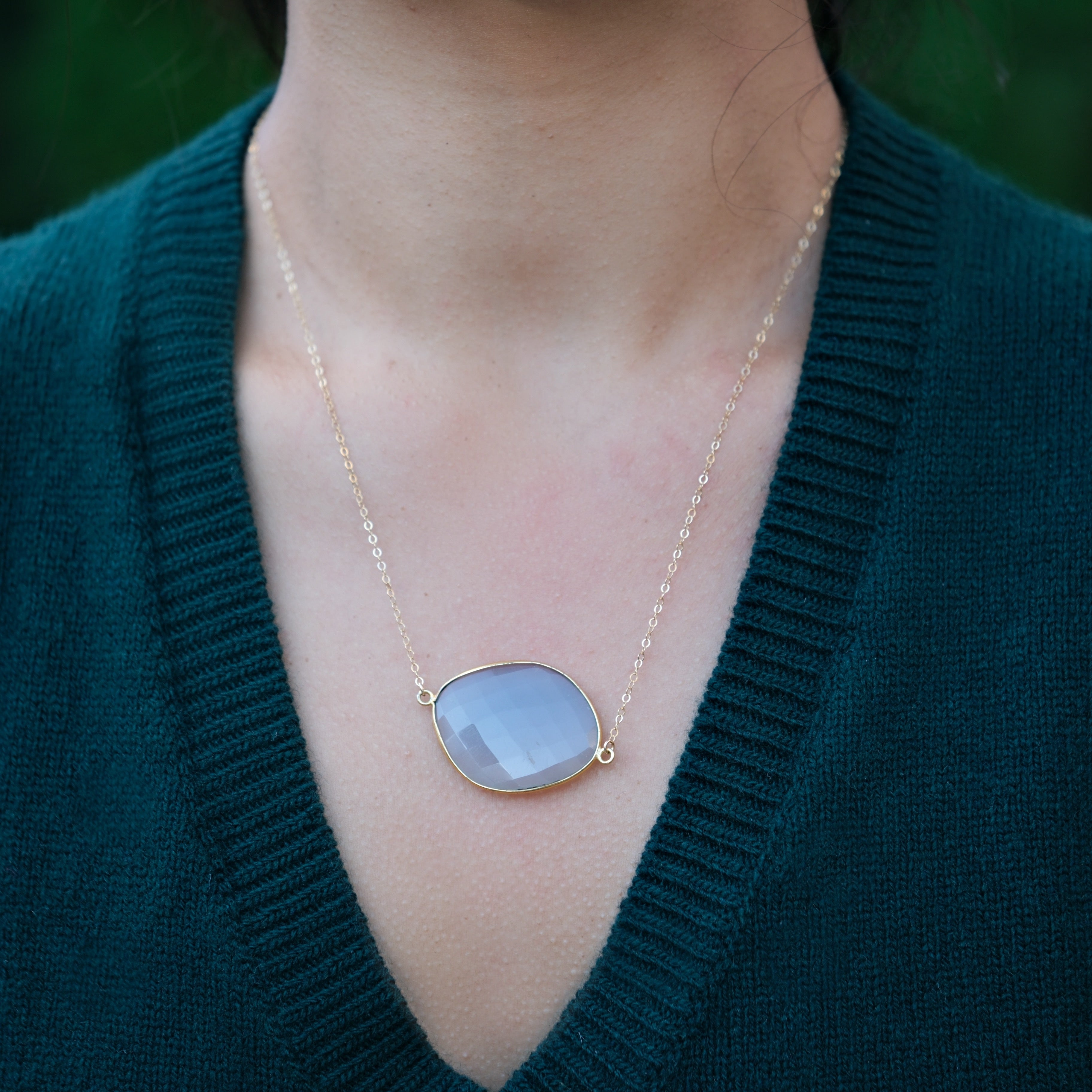 Soft, luminous, and effortlessly elegant l, this necklace features a hand-cut Peach Moonstone framed in 14k gold–plated sterling silver, suspended from a delicate 14k gold–filled chain. The stone’s subtle shimmer catches the light with every movement, adding a warm, natural glow to any look. Perfect for everyday wear or special occasions alike.