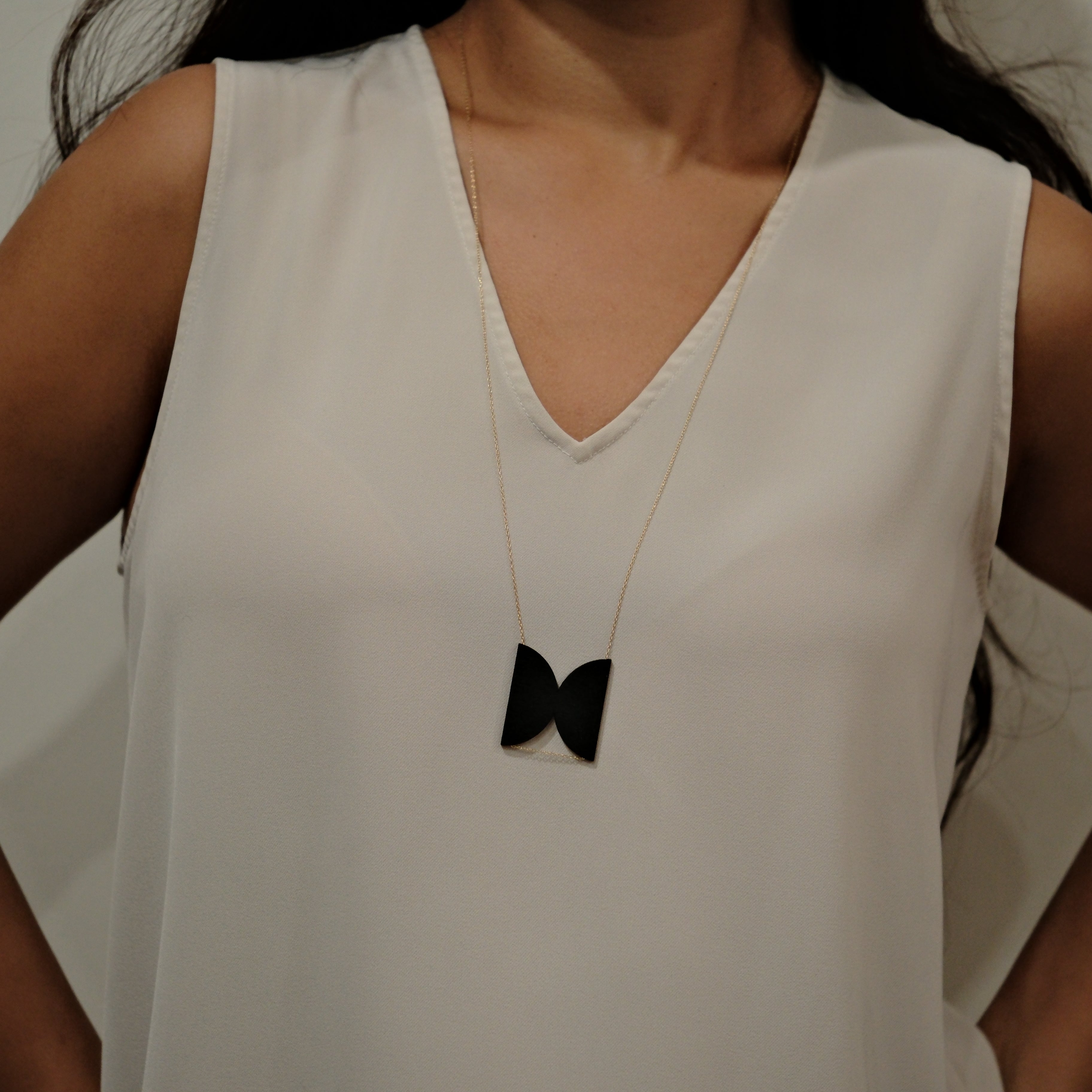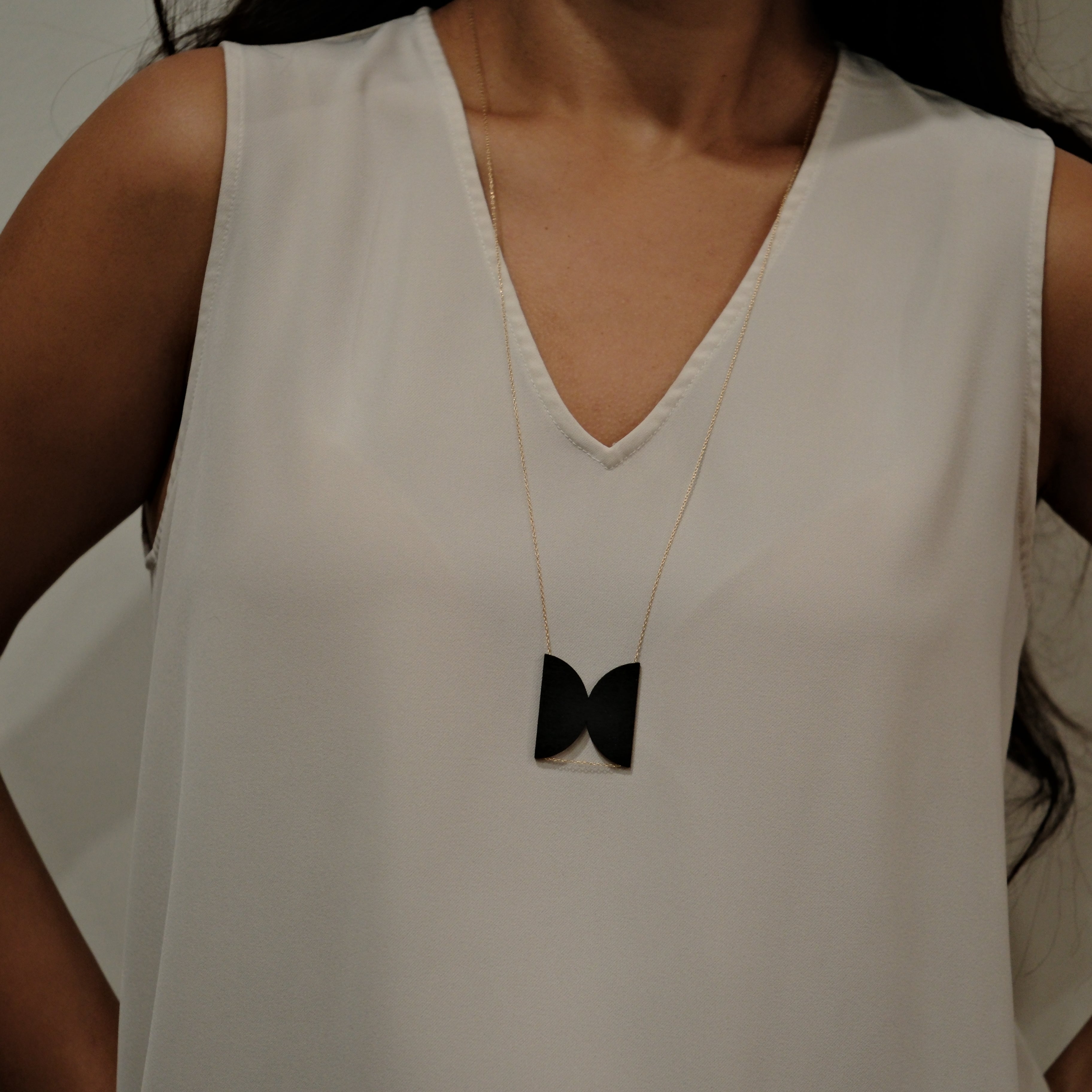 It hangs from a 26-inch 14K gold-filled chain, offering a warm contrast to the dark pendant and an elegant, elongated look perfect for layering or wearing as a standalone statement.