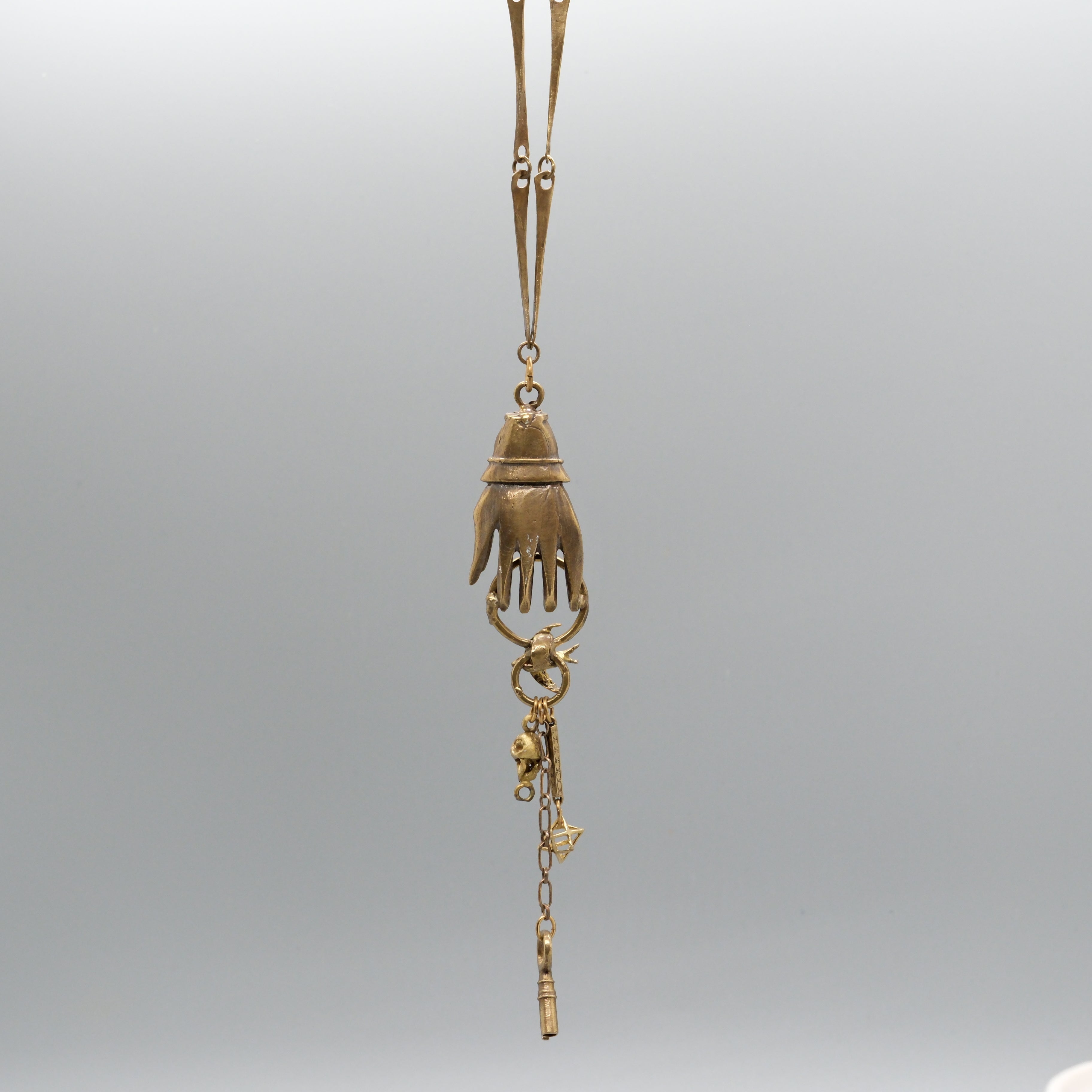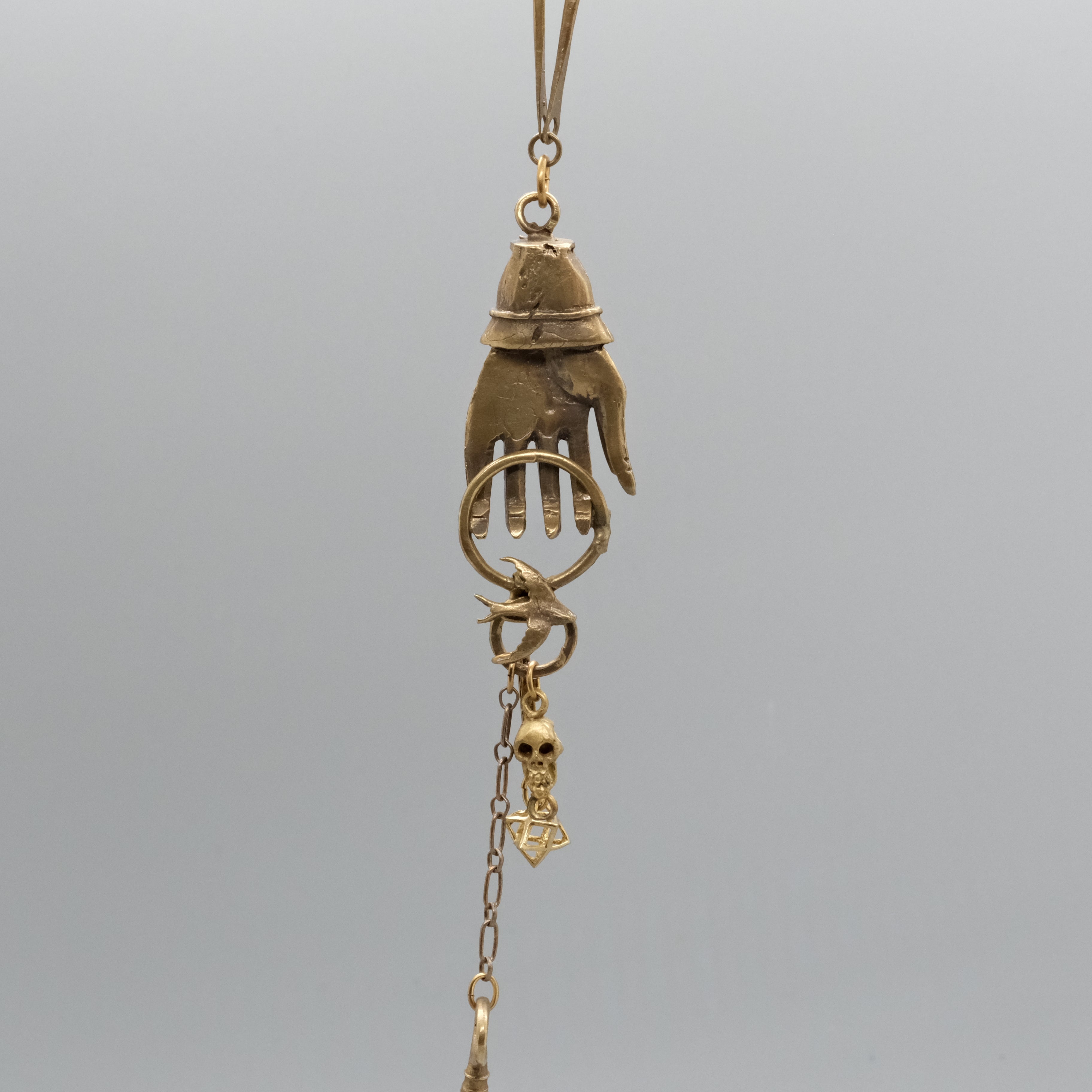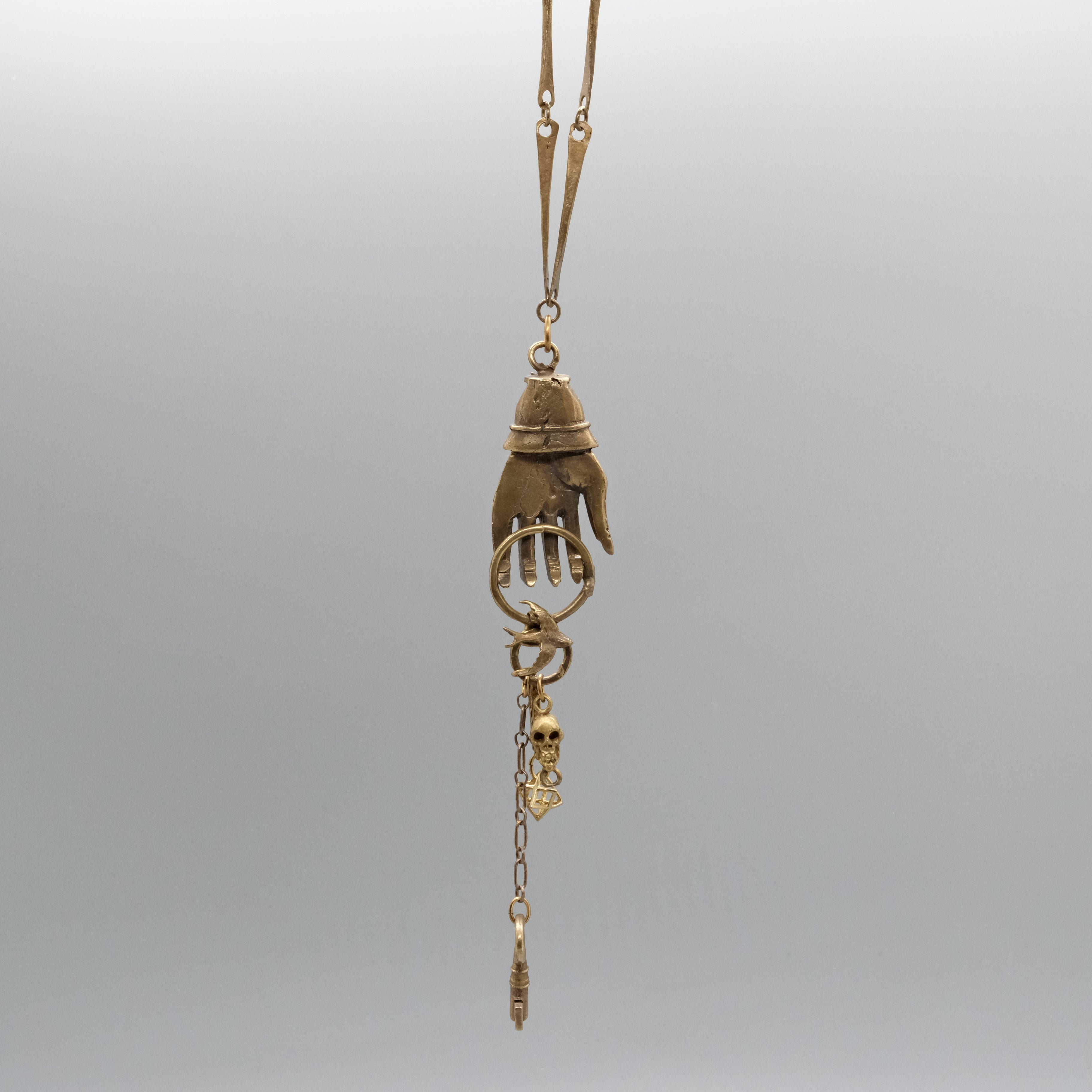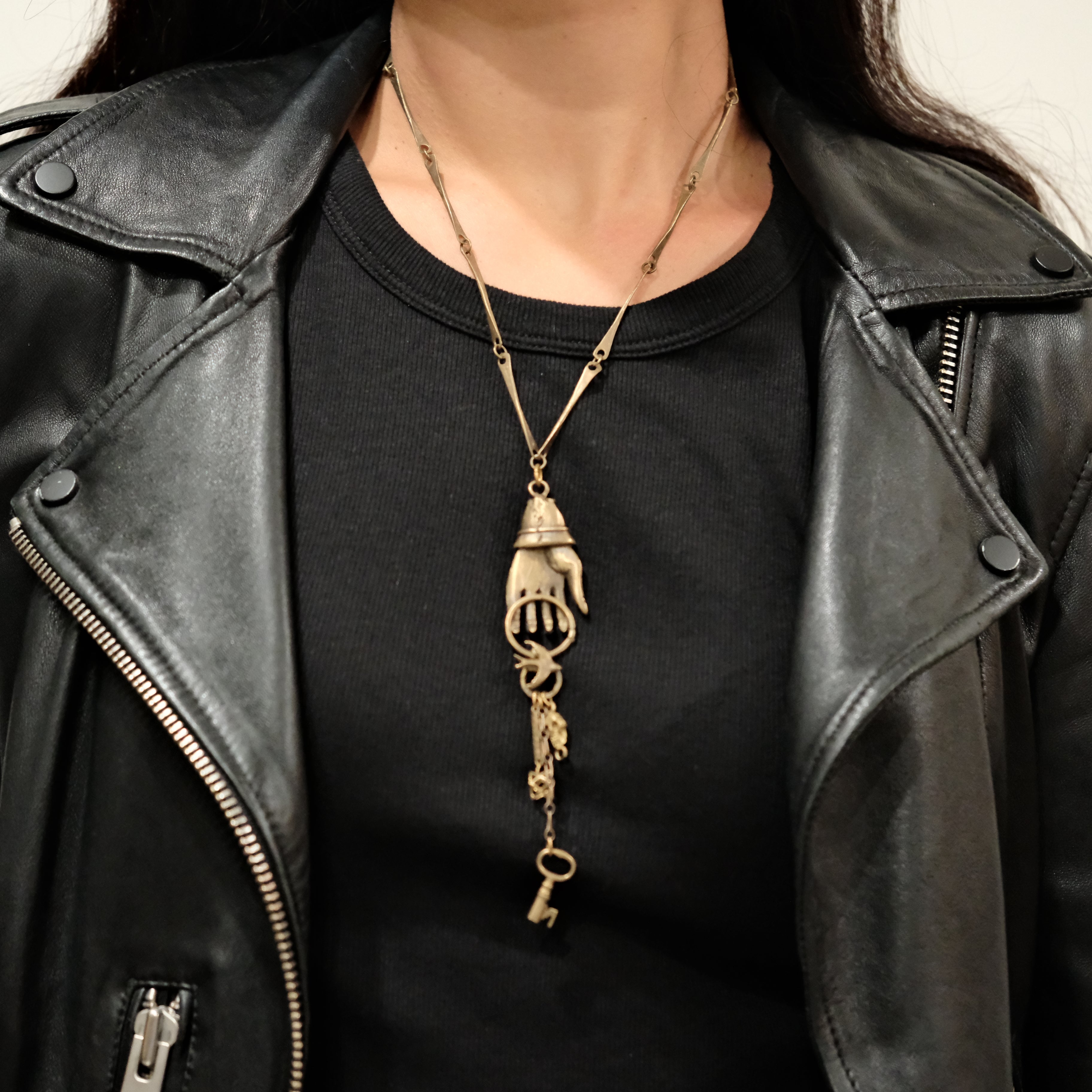 Mysterious, symbolic, and artfully constructed. This striking necklace features a sculptural hand pendant cast from reclaimed metal, holding a ring adorned with layered charms, a coiled serpent, a tiny skull, and other talismanic details. Each element is intricately textured, giving the piece a worn, relic-like presence and a sense of hidden story.