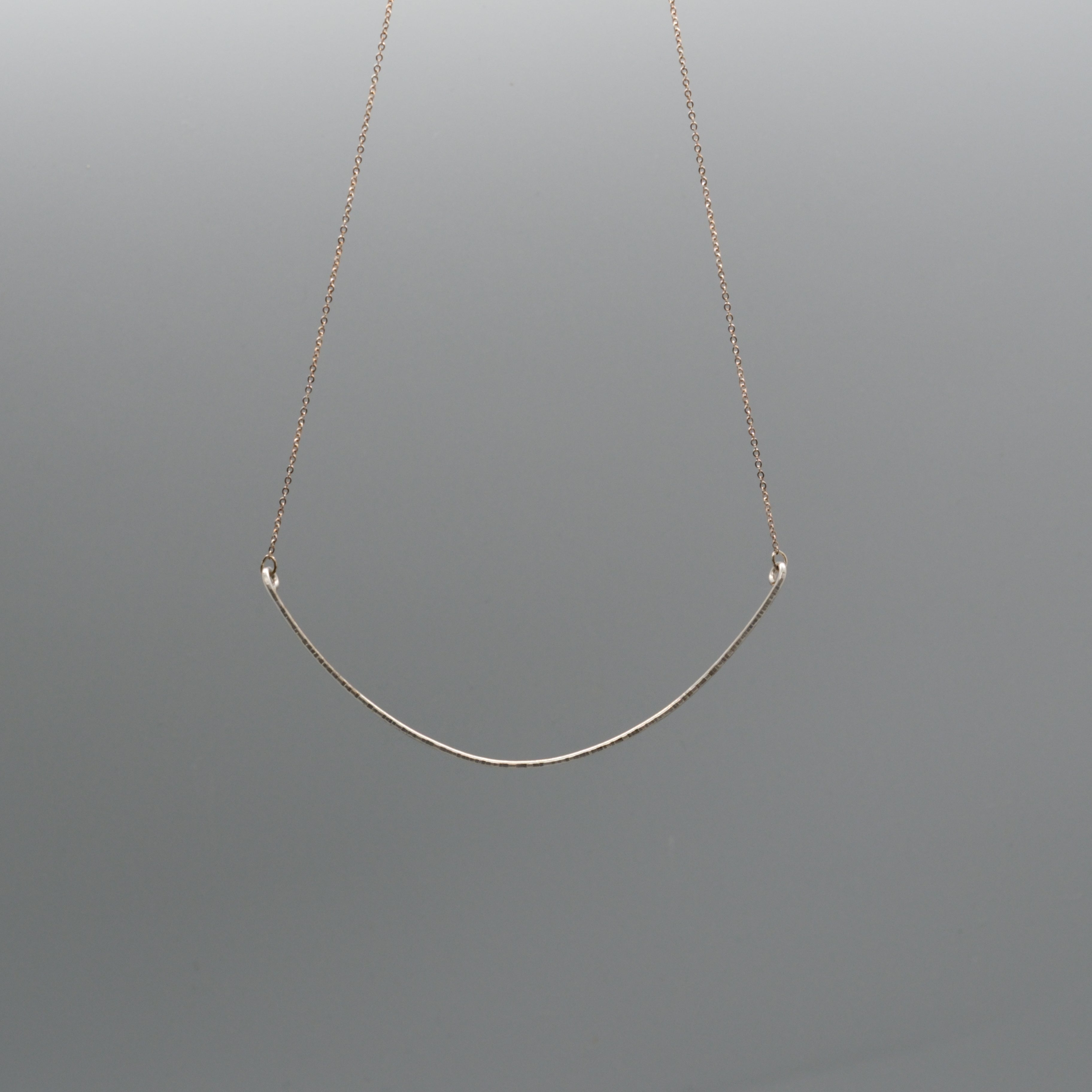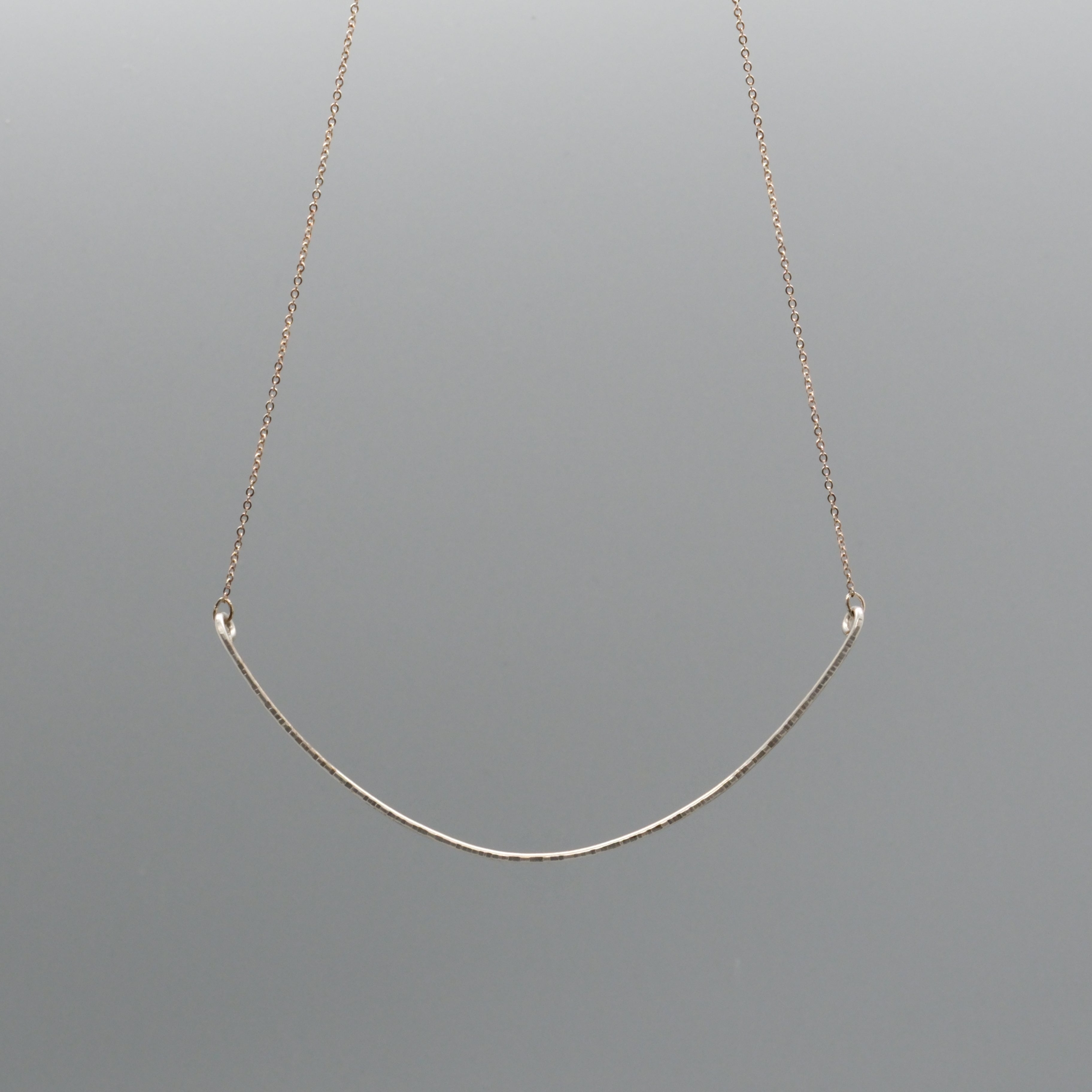 Elegant in its simplicity. This necklace features a slender sterling silver curved bar, lightly hammered for soft, organic texture. The graceful arc creates a modern, minimalist silhouette that sits beautifully along the collarbone.