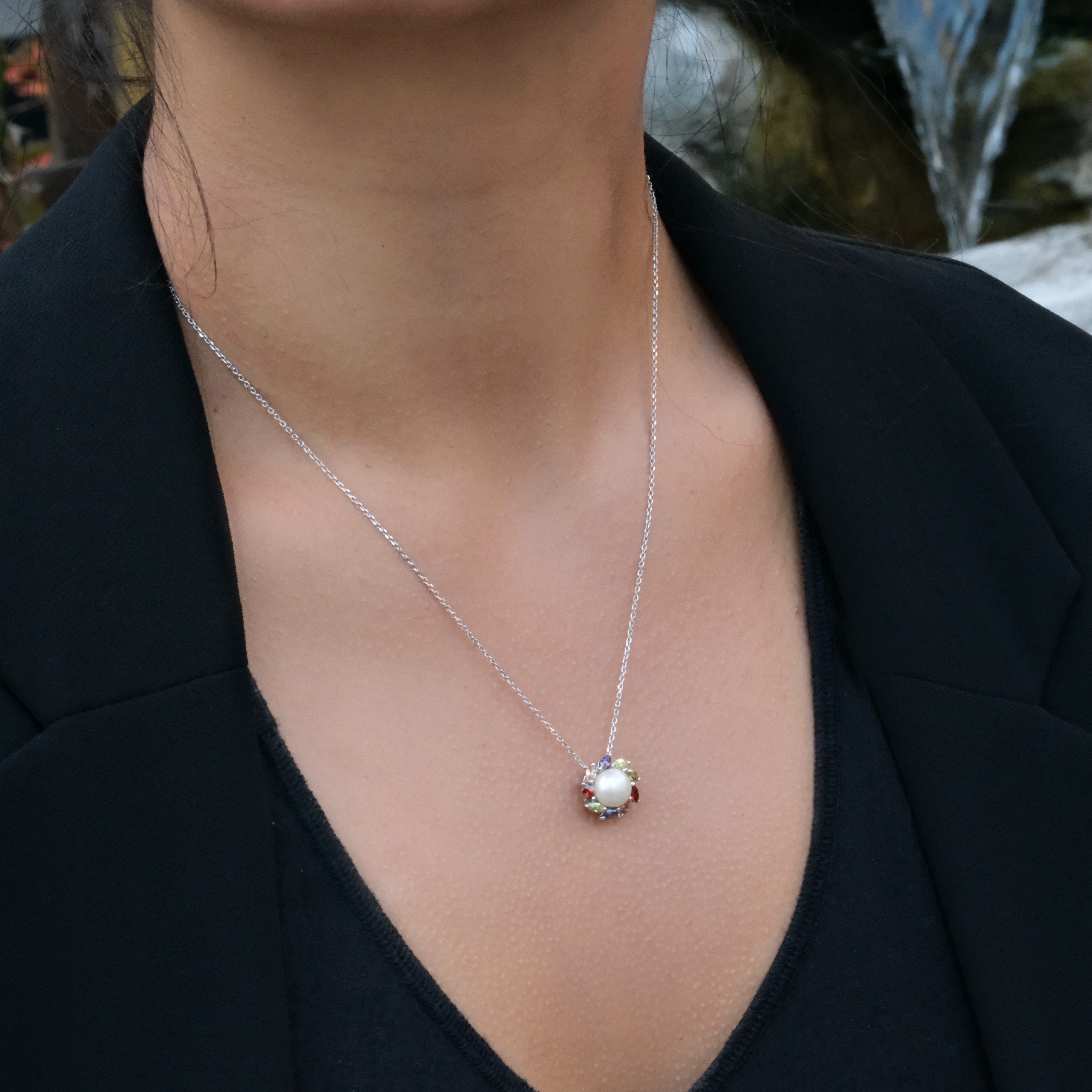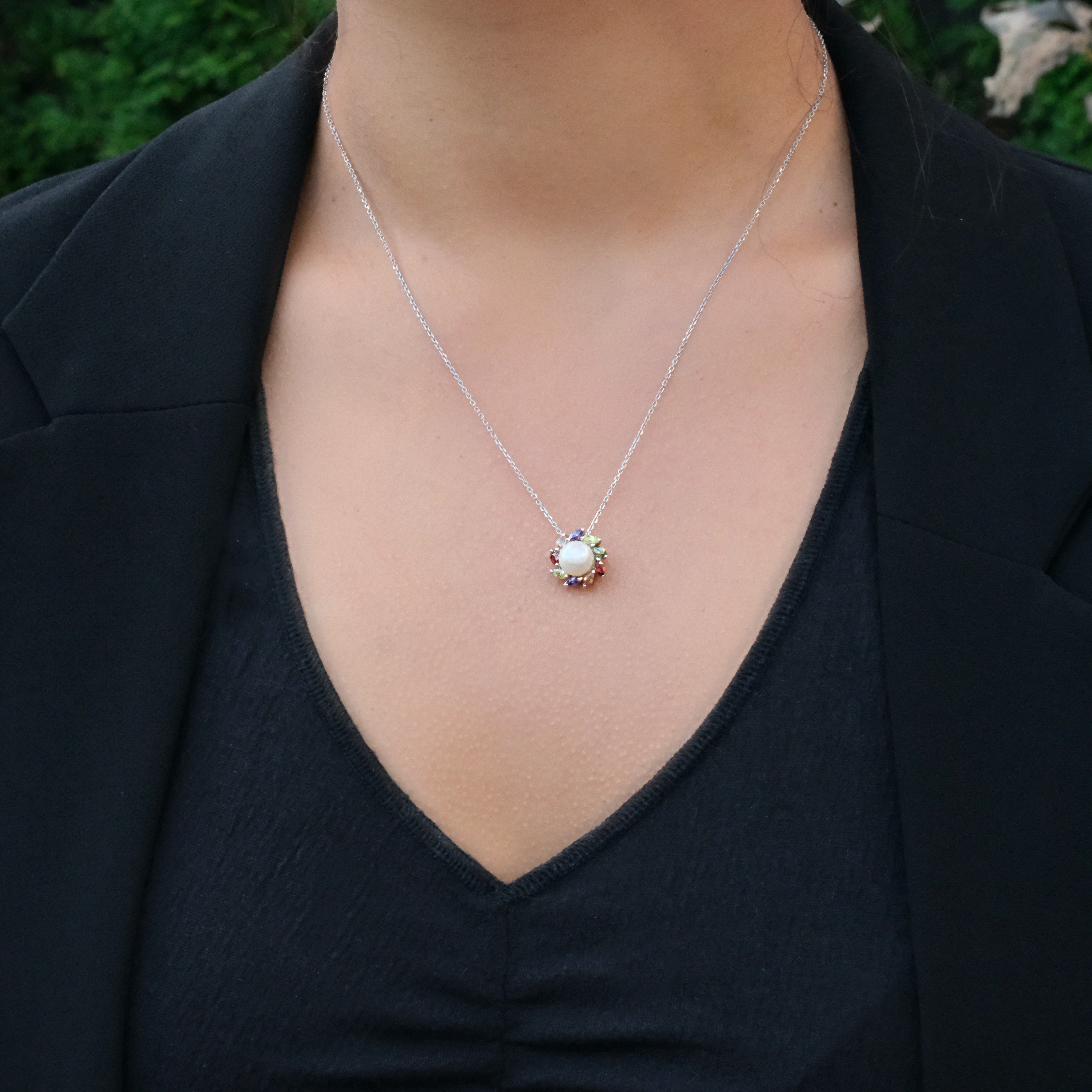 Bright, classic, and effortlessly wearable, this sterling silver necklace features a brilliant-cut cubic zirconia surrounded by a delicate halo of colorful accent stones. The center CZ offers a clear, radiant sparkle reminiscent of fine gemstones, while the multicolored halo adds a playful yet refined touch. Set on a sleek sterling silver chain, this piece brings a polished glow to both everyday outfits and special occasions.