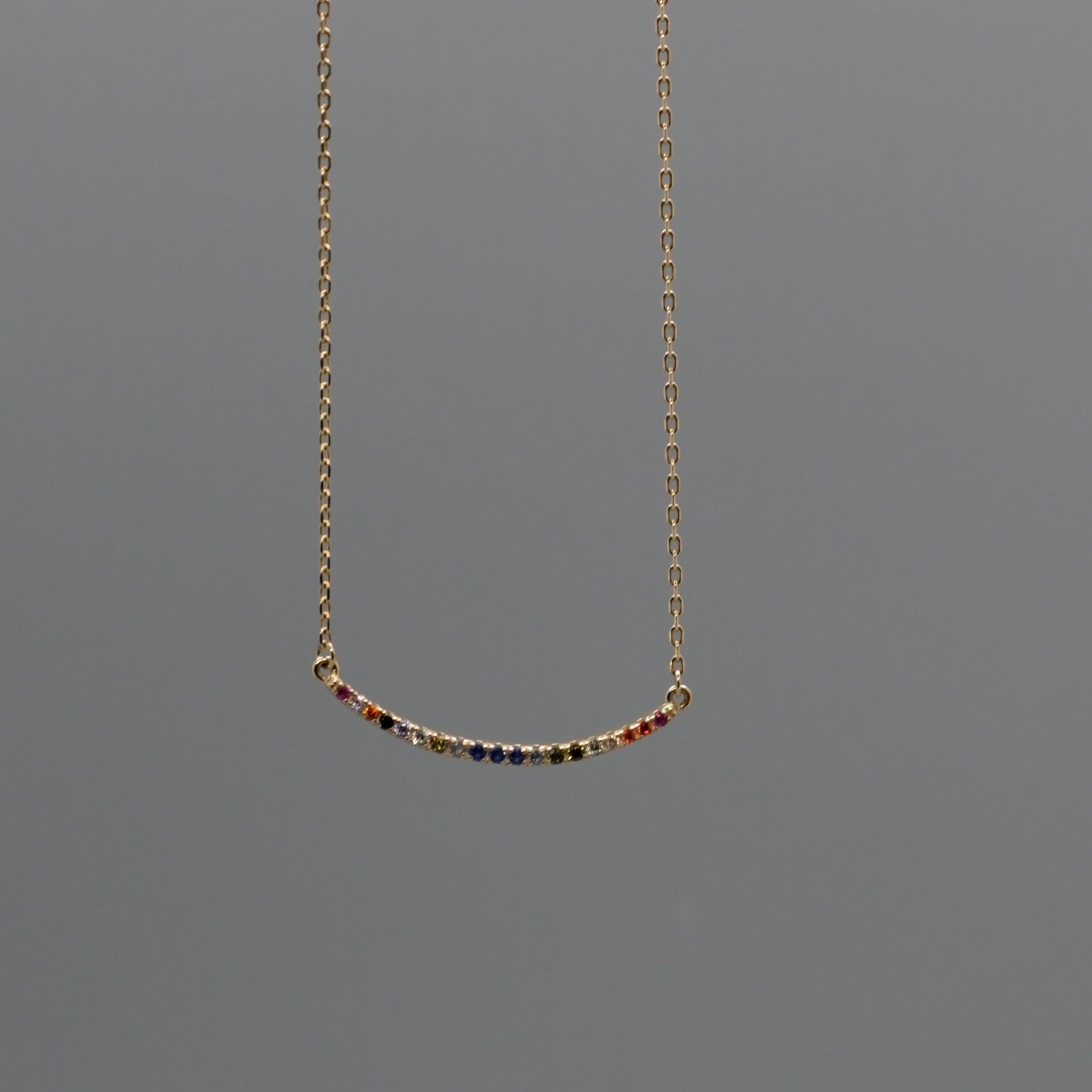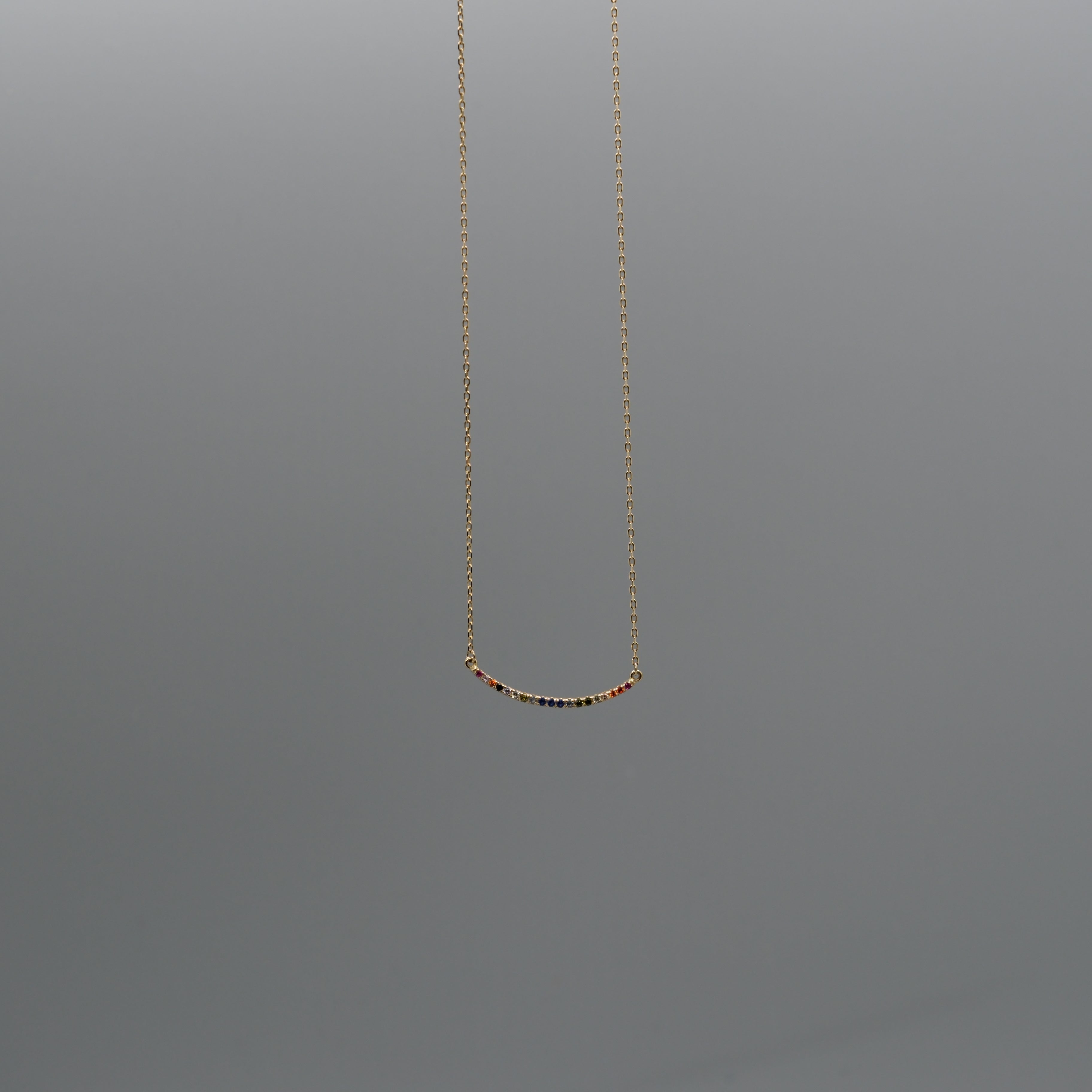 Brighten your everyday look with this dainty 18-inch rainbow bar necklace, crafted in 14k gold–plated sterling silver. The slim curved bar is set with a vibrant row of multi-colored cubic zirconia, creating a playful pop of color that sparkles beautifully in the light. Perfect for layering or wearing solo, this cheerful piece adds a fun, modern touch to any jewelry collection, a little rainbow you can wear every day.