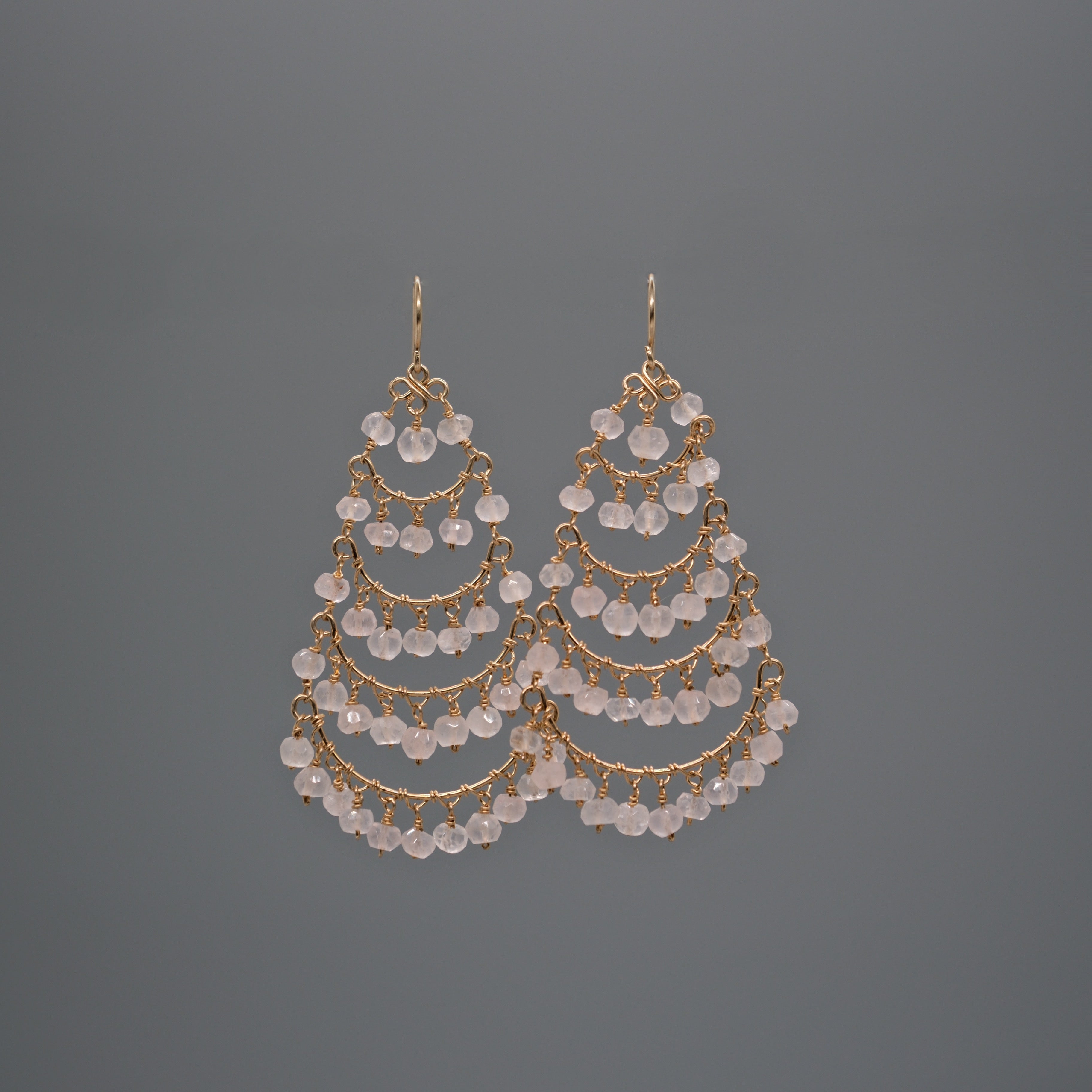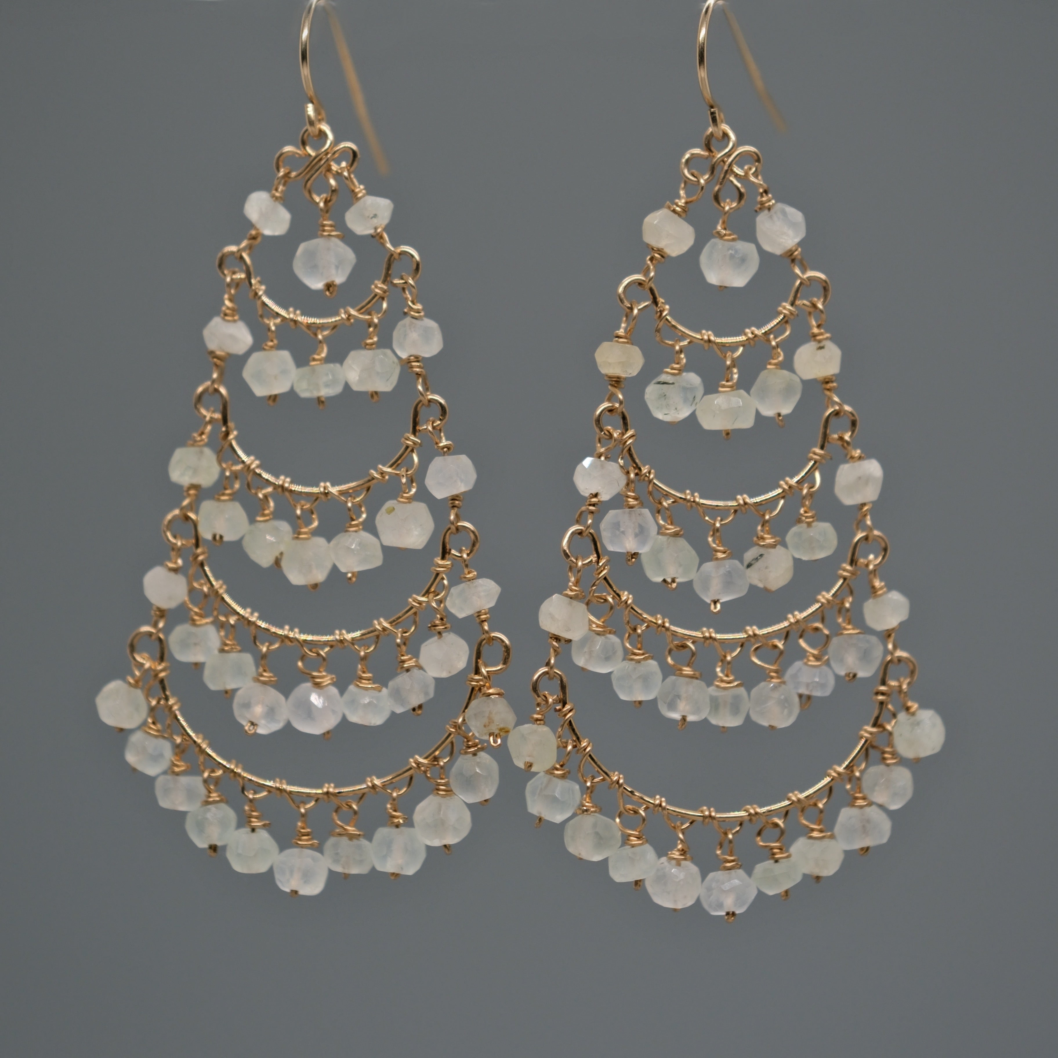 These stunning chandelier earrings are crafted in 14k gold-filled metal and adorned with cascading rows of shimmering gemstones. Each faceted bead catches the light beautifully, creating soft movement and a radiant, eye-catching glow. Available in multiple gemstone options, this elegant design adds a luxe, feminine touch, perfect for special occasions or elevating an everyday look.