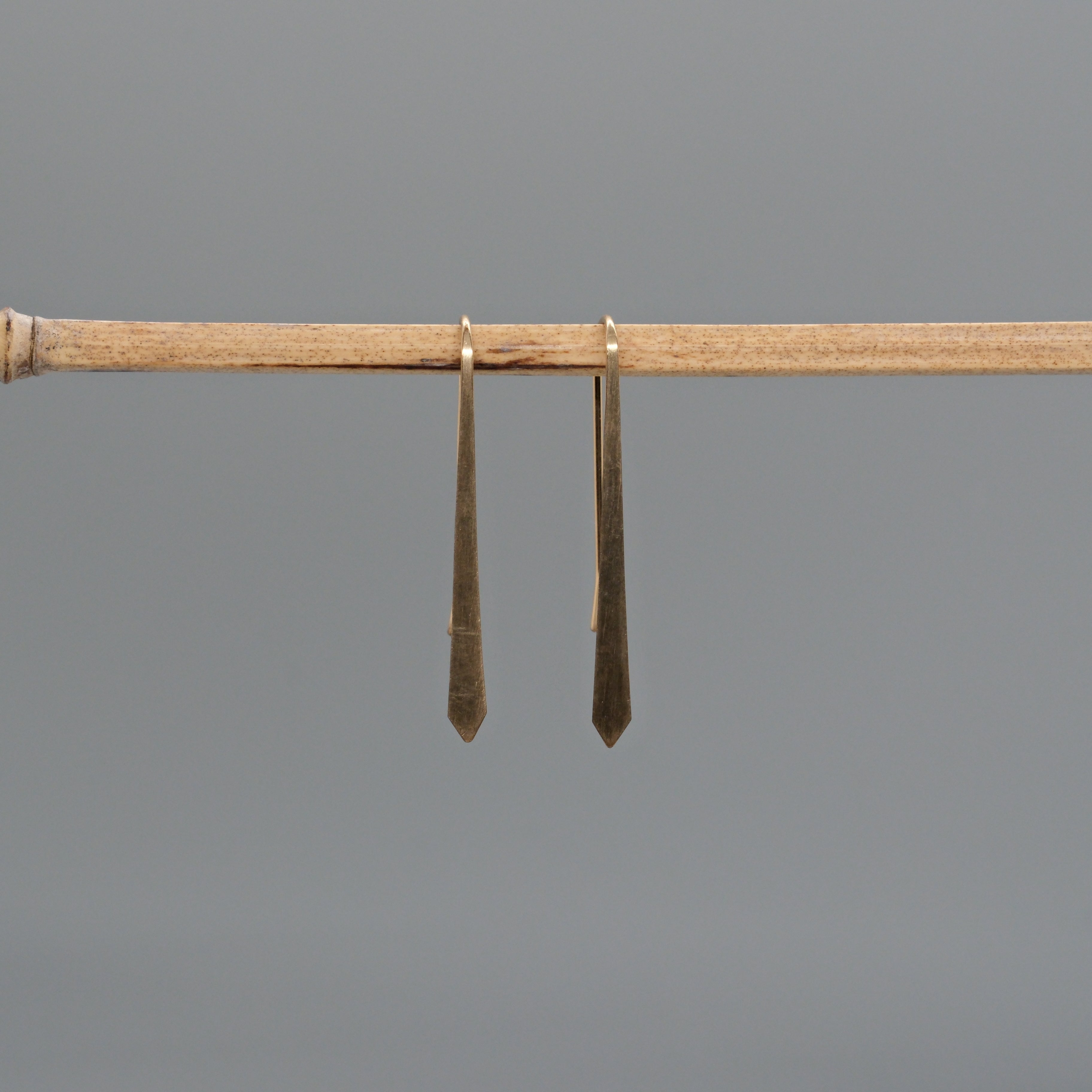 These sleek, modern drop earrings feature hand-formed 14K gold-filled bars with a tapered silhouette and subtly faceted ends. Their clean, vertical design creates an elegant elongating effect, making them perfect for everyday wear or a refined evening look.