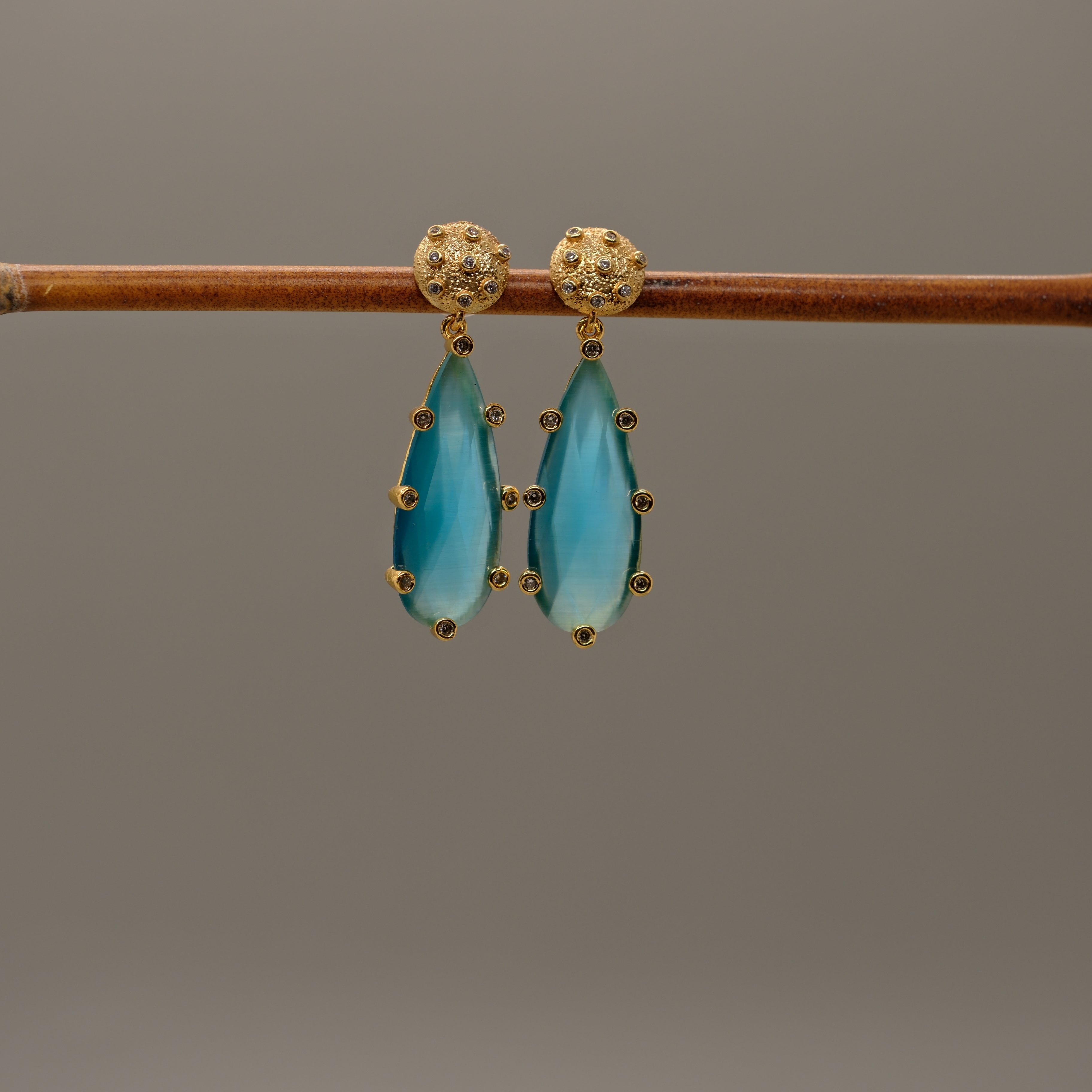 Sophisticated and eye-catching, these statement earrings feature a vibrant cat’s eye gemstone suspended from a textured 18k gold-plated brass stud. The elongated teardrop stone is accented with delicate cubic zirconia details, adding a touch of sparkle that catches the light beautifully. With their luxurious color, graceful movement, and bold silhouette, these earrings elevate any outfit, from evening looks to special celebrations.