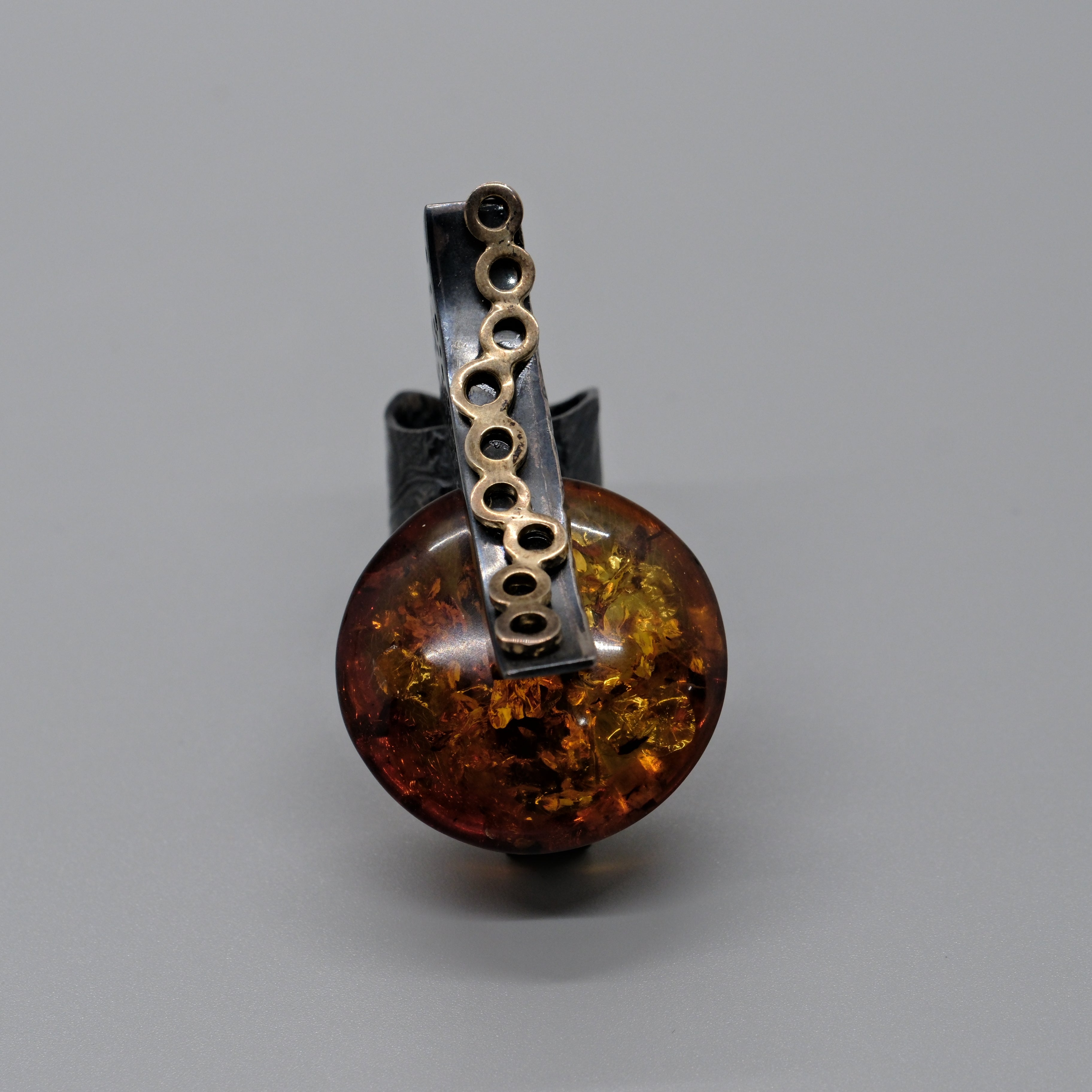 This striking, one-of-a-kind statement ring features a bold dome of natural Baltic amber, glowing with warm honey and deep cognac inclusions. The amber is set in an architectural oxidized-silver body with a richly textured surface, giving the piece a raw, artisan feel. A row of gold-plated circular accents runs across the top, adding contrast and a touch of modern elegance.
