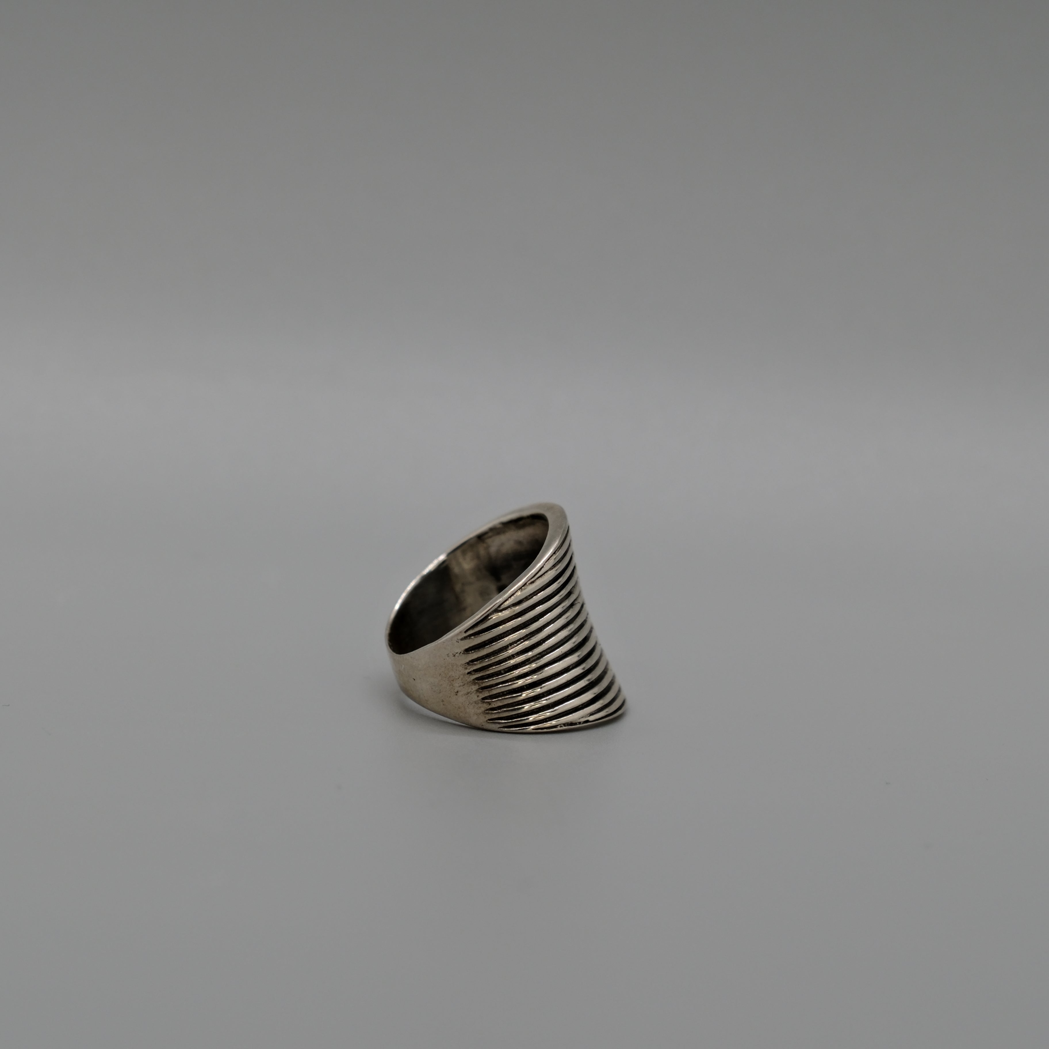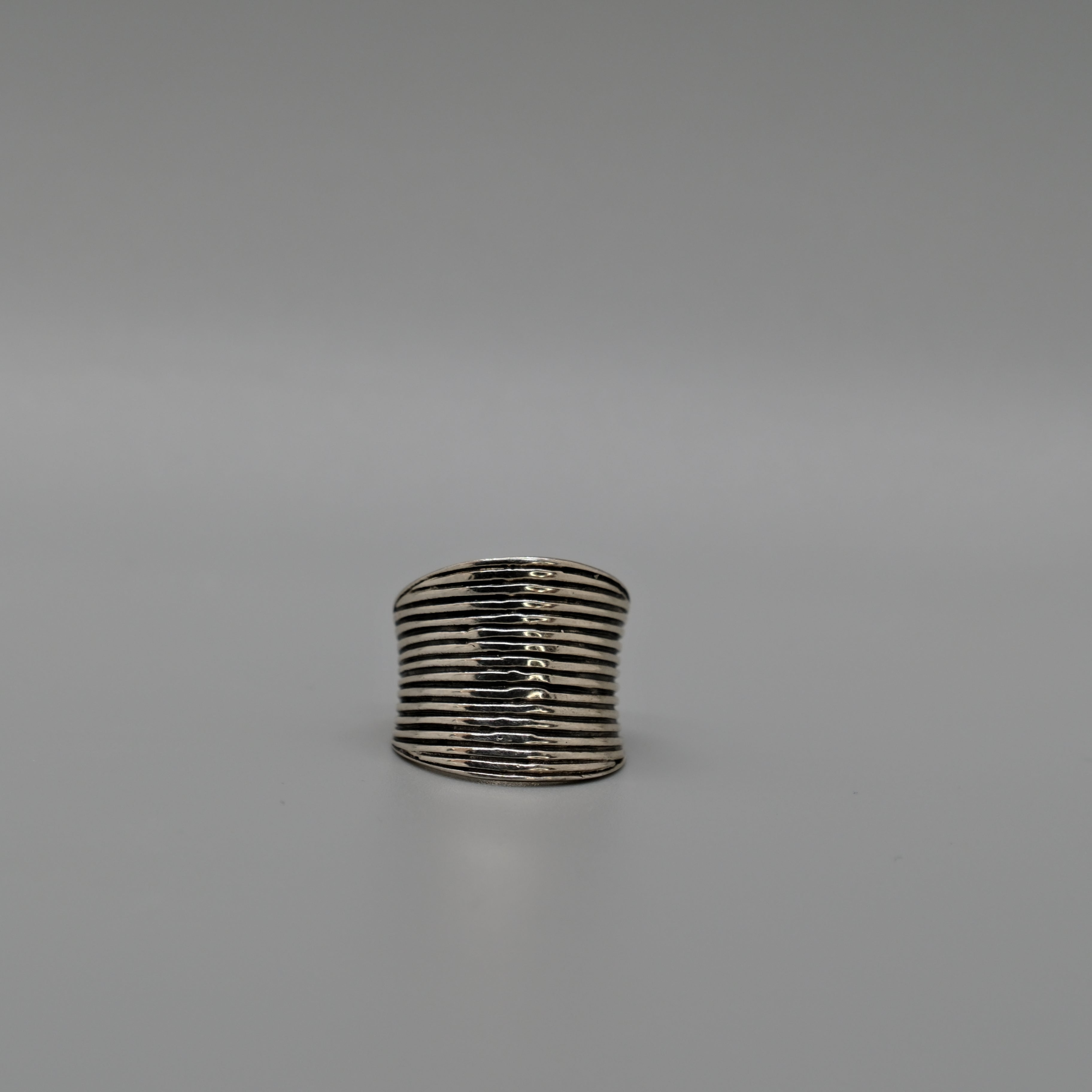 A bold yet timeless statement piece, this silver ring features a wide band adorned with horizontal ridge detailing for a modern, textured finish. Crafted in sterling silver, it offers a sleek, sculptural look that stands out on its own or pairs effortlessly with other stackable pieces. Perfect for everyday wear or adding a touch of contemporary style to any outfit.