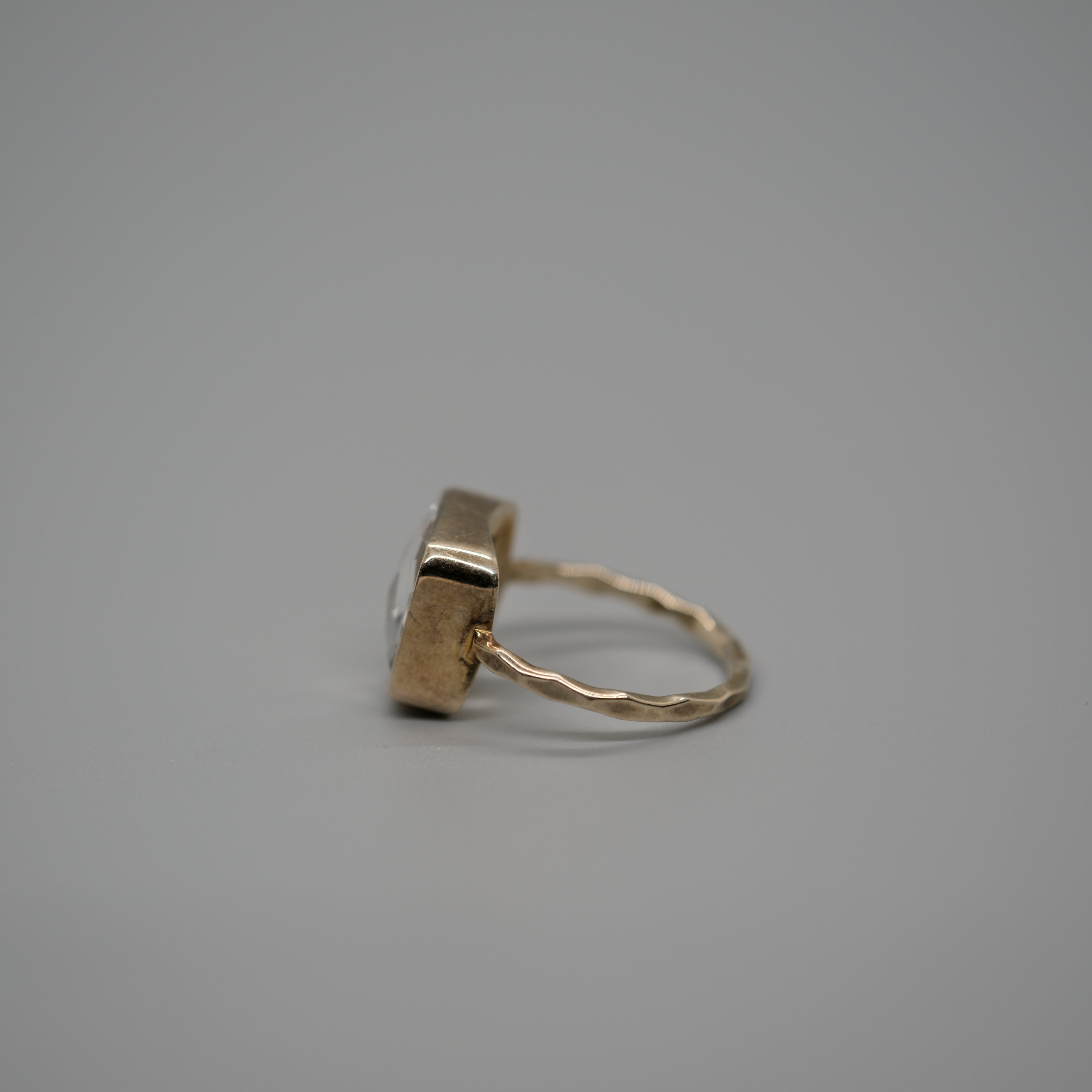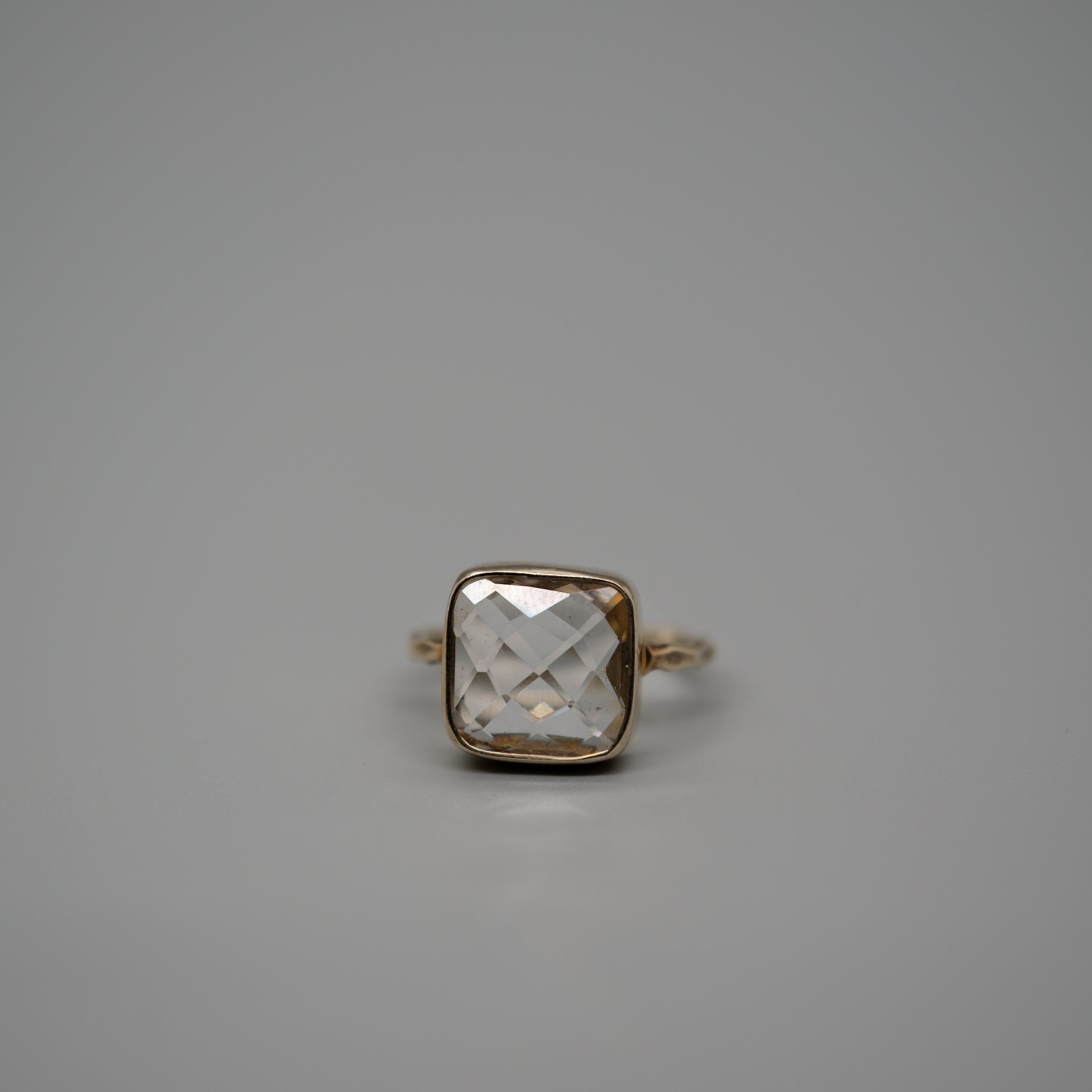 Bold yet refined, this statement ring features a faceted cushion-cut Chrystal set in a sleek bezel for a modern, sculptural look. Available in 14k gold-plated sterling silver, this piece is designed to elevate both everyday outfits and special occasions.