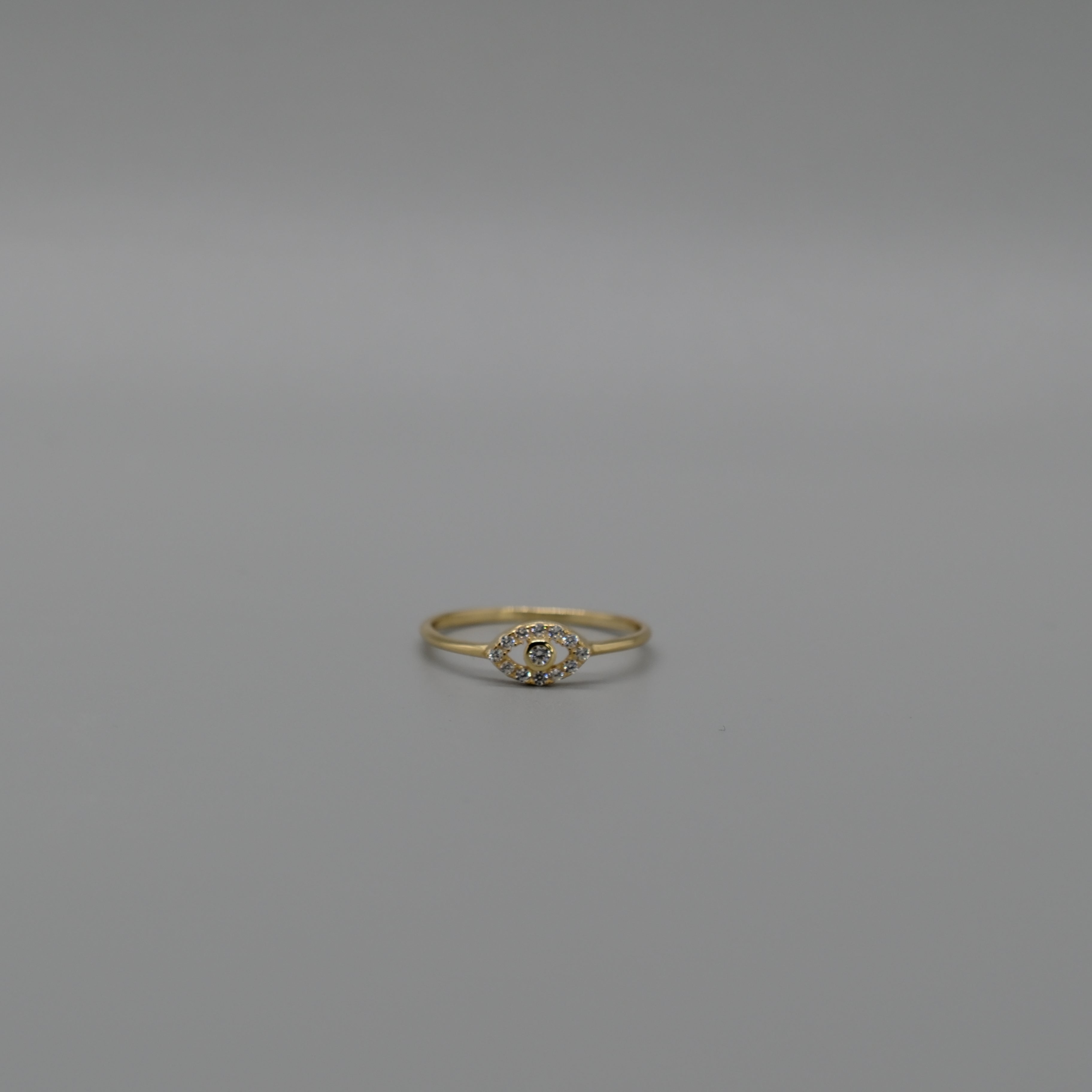 Delicate and meaningful, this dainty ring features an elegant evil eye design crafted in 14k gold-plated sterling silver. The center sparkles with a brilliant cubic zirconia stone, framed by a halo of mini CZ accents for added shine. Its slim, textured band adds a refined touch, making it perfect for stacking or wearing solo as a subtle statement.