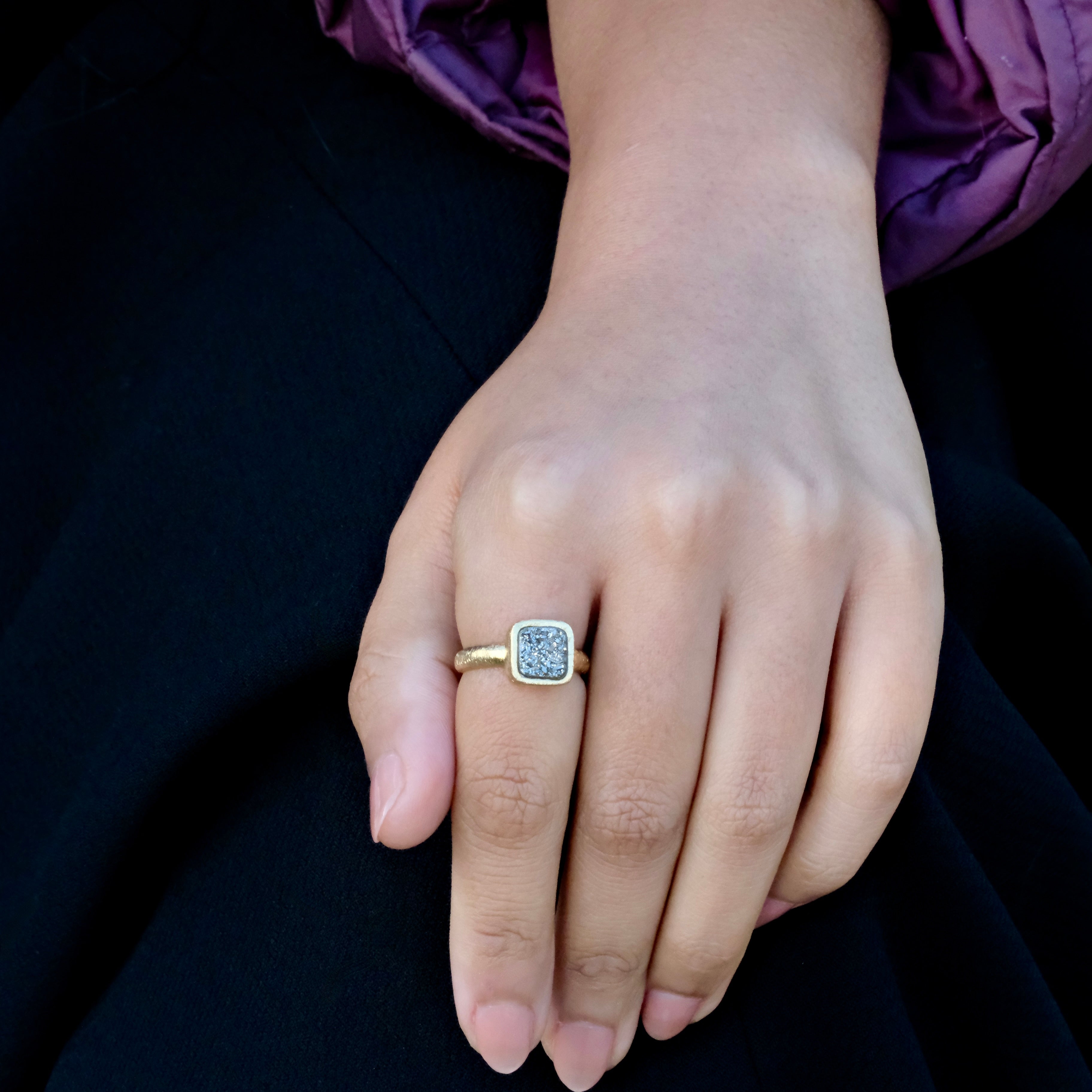 Shimmering and eye-catching, this elegant ring features a square shaped druzy-style center with a sparkling textured finish. The glittering surface catches the light beautifully, adding a touch of radiance to any look. Set in 14k gold-plated over brass with a sleek, minimalist band, this piece offers both everyday wearability and a hint of glamour.