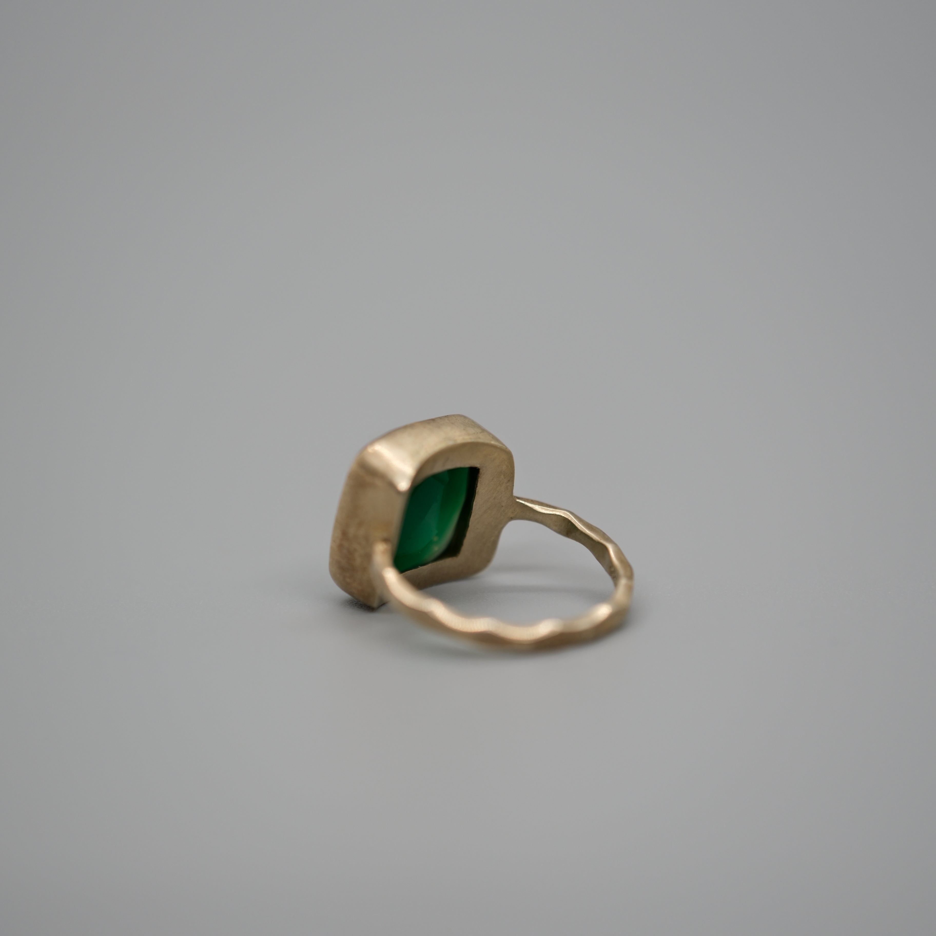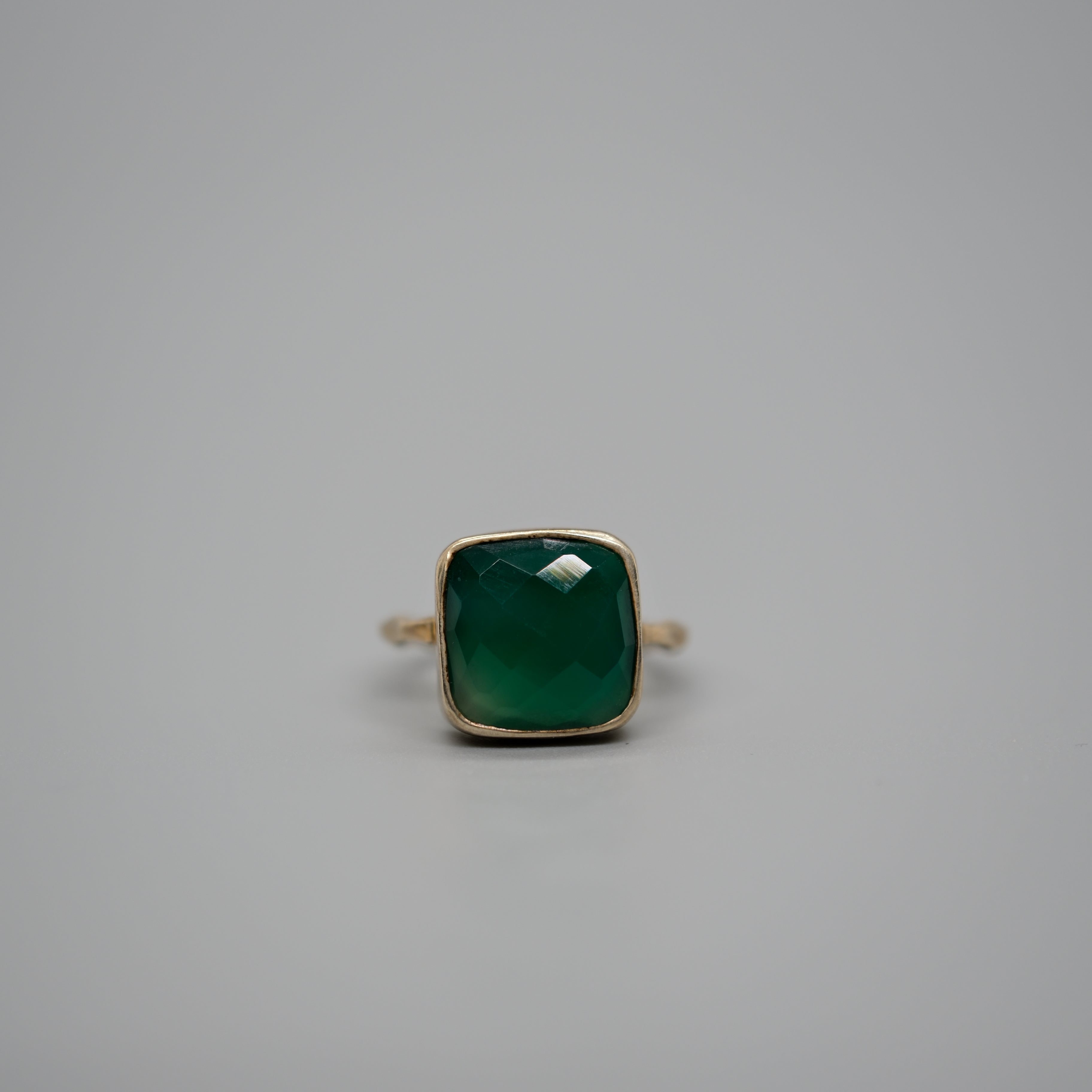 Bold yet refined, this statement ring features a faceted cushion-cut green onyxset in a sleek bezel for a modern, sculptural look. Available in 14k gold-plated sterling silver, this piece is designed to elevate both everyday outfits and special occasions.