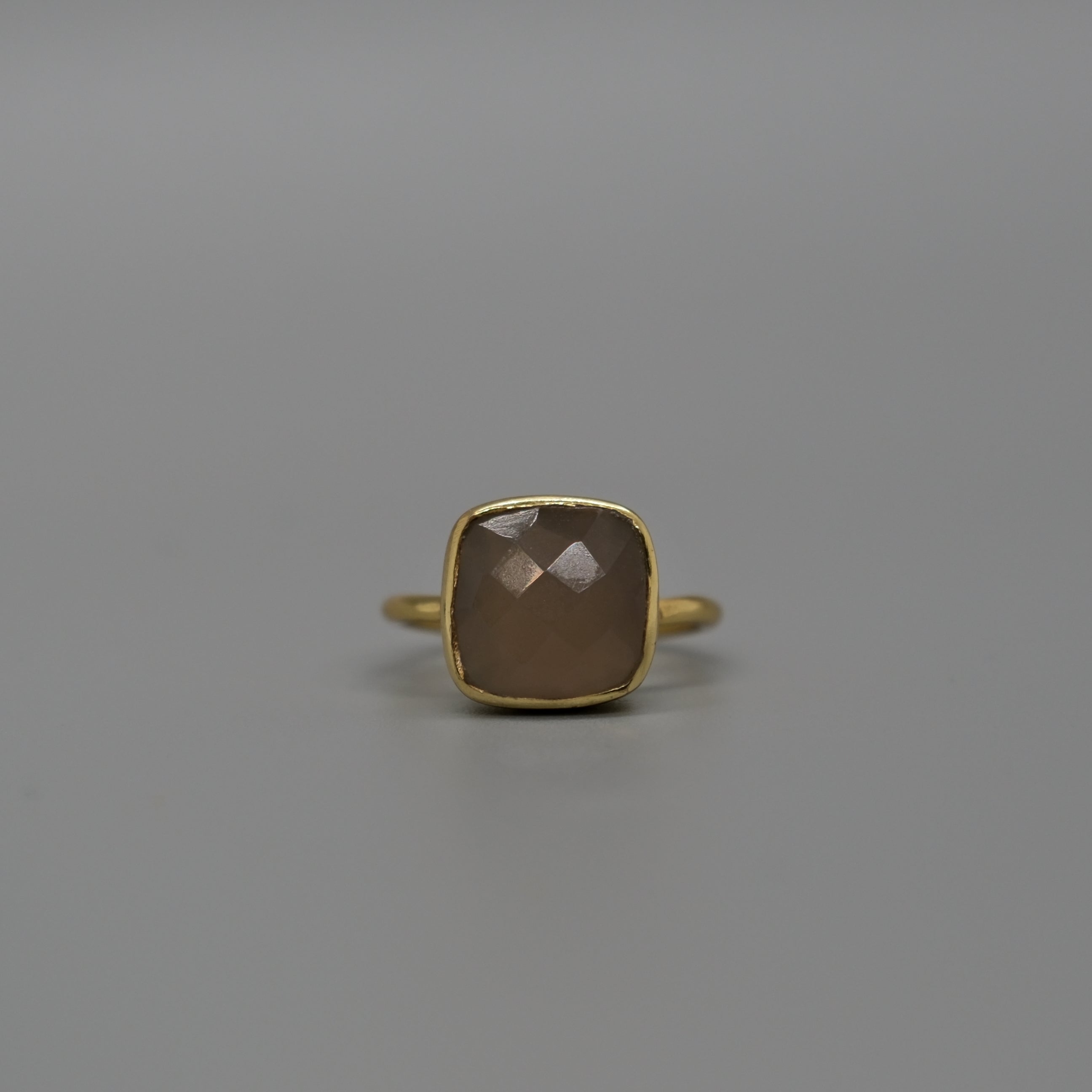 Bold yet refined, this statement ring features a faceted cushion-cut Grey moonstone set in a sleek bezel for a modern, sculptural look. Available in your choice of solid sterling silver or 14k gold-plated sterling silver, this piece is designed to elevate both everyday outfits and special occasions.