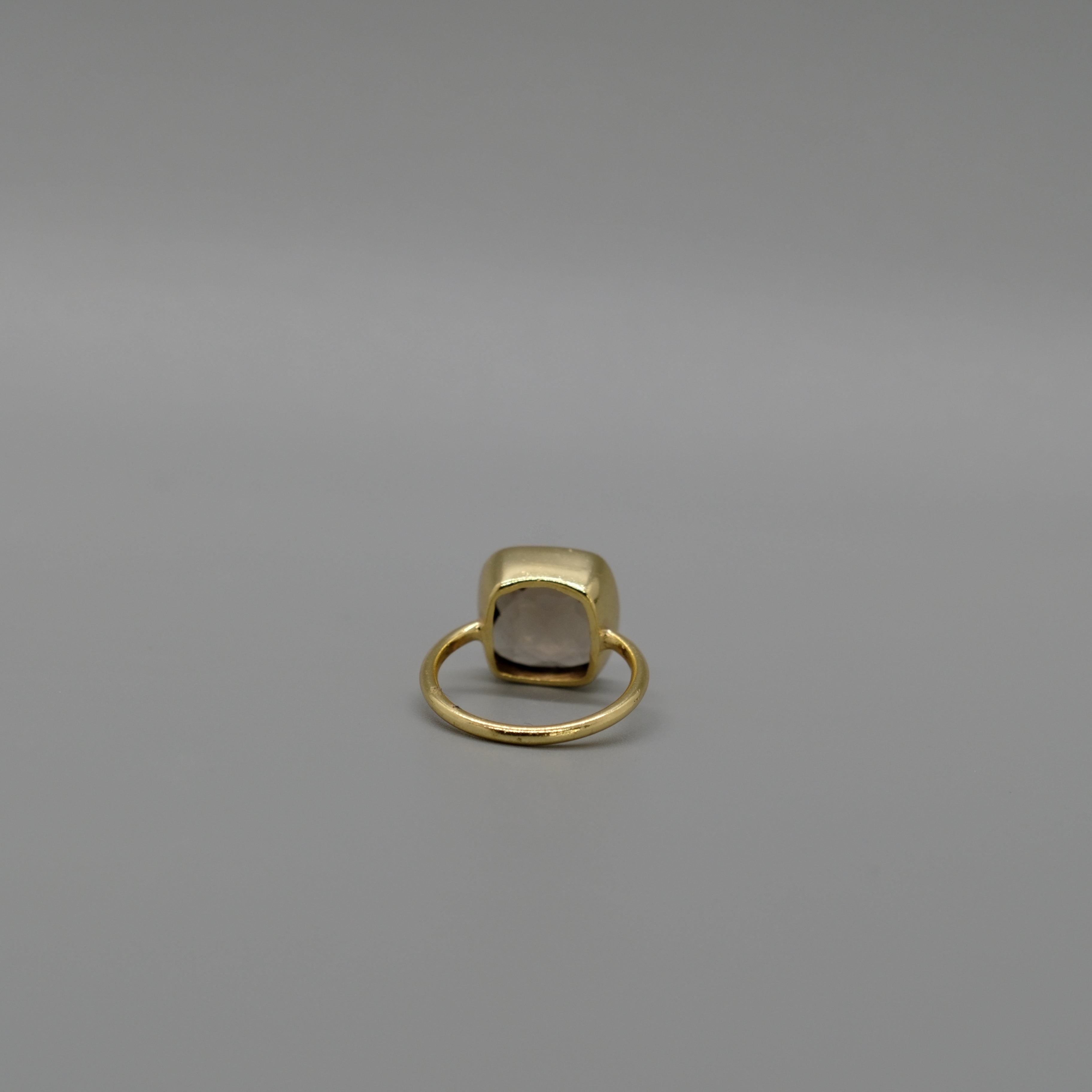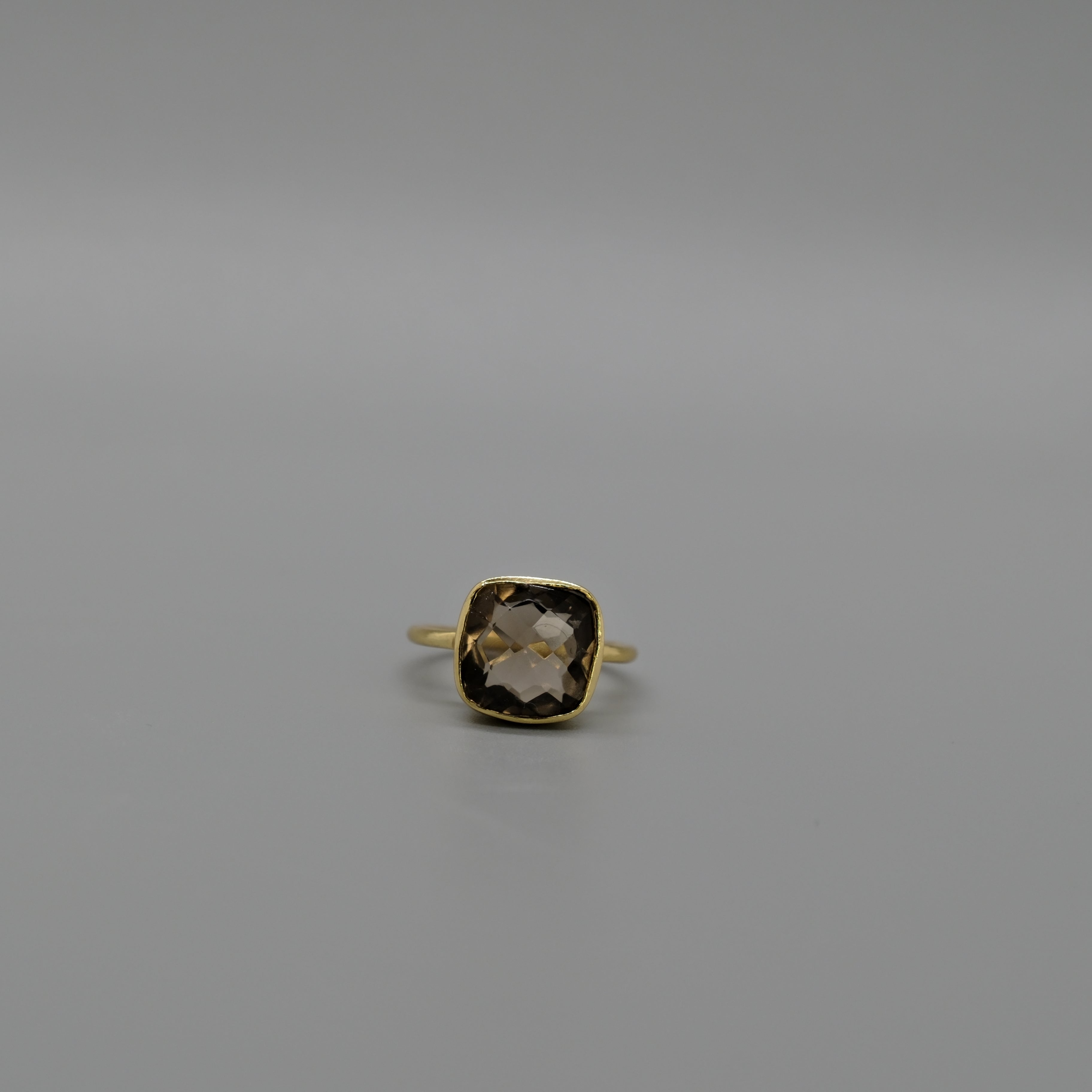 Bold yet refined, this statement ring features a faceted cushion-cut Smoky quartz set in a sleek bezel for a modern, sculptural look. Available in 14k gold-plated sterling silver, this piece is designed to elevate both everyday outfits and special occasions.