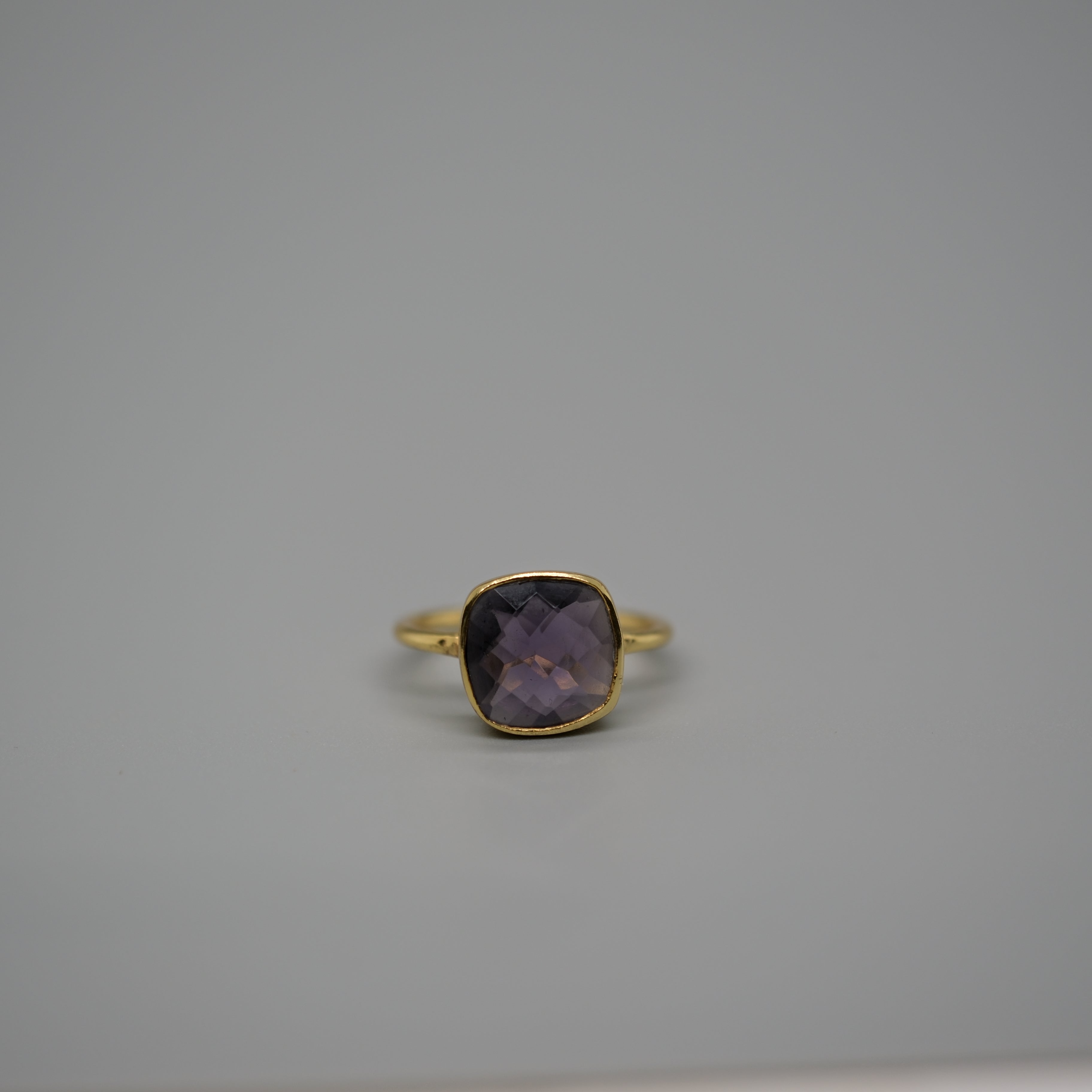 Bold yet refined, this statement ring features a faceted cushion-cut Amethyst set in a sleek bezel for a modern, sculptural look. Available in 14k gold-plated sterling silver, this piece is designed to elevate both everyday outfits and special occasions.