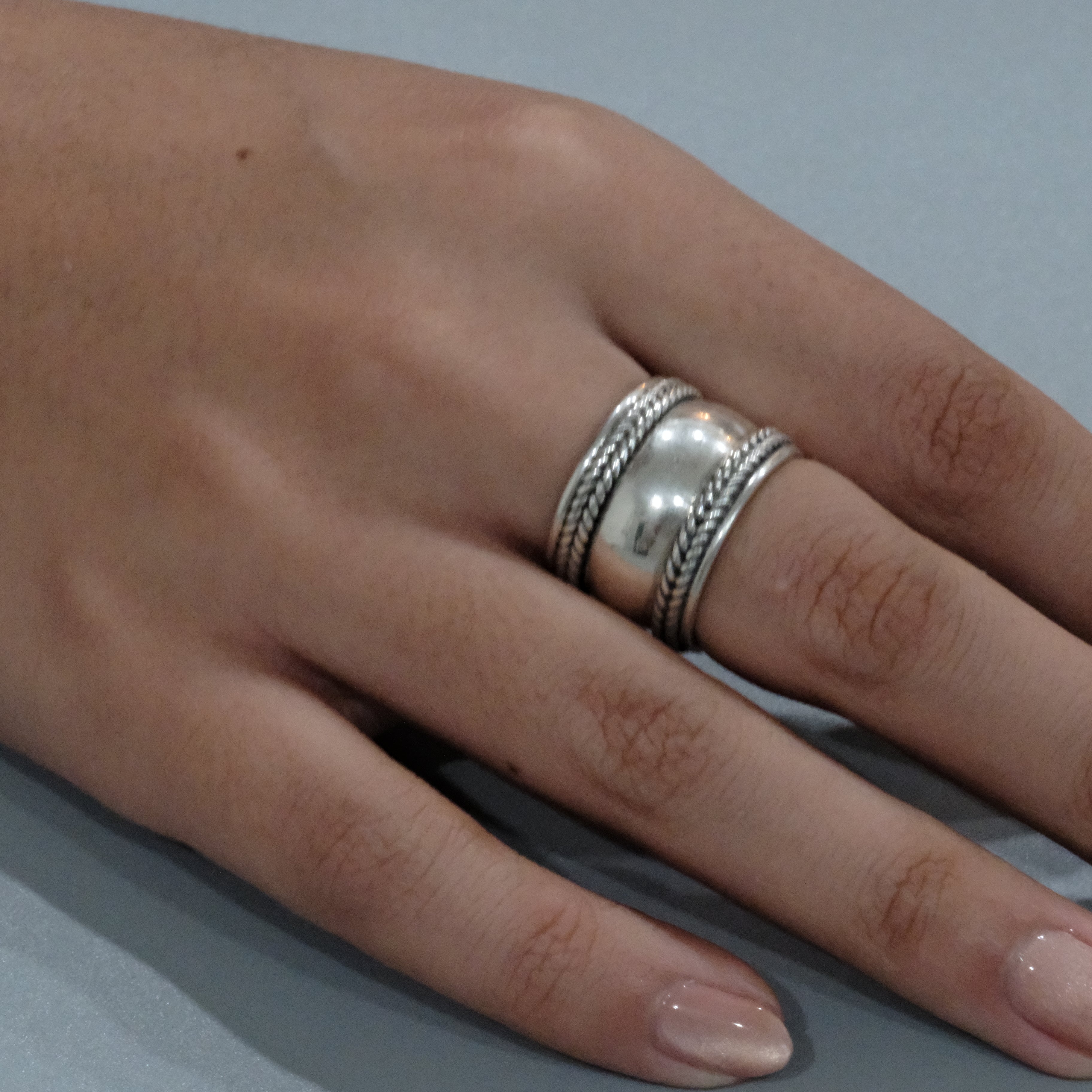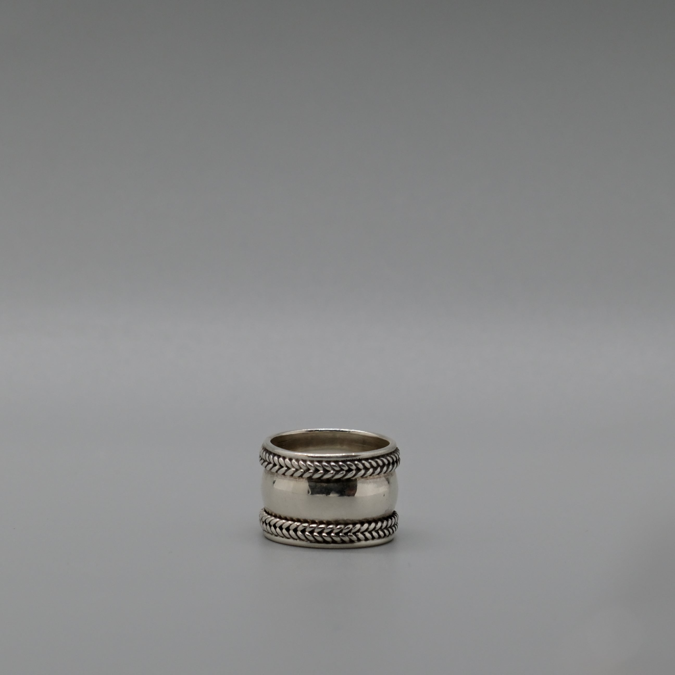 A bold and beautifully crafted sterling silver ring featuring a wide, smooth center band framed by intricately braided edges. Its substantial design makes it a standout piece, offering a perfect balance of strength, texture, and elegance. Comfortable enough for everyday wear yet striking enough to make a statement, this ring is a timeless addition to any jewelry collection.