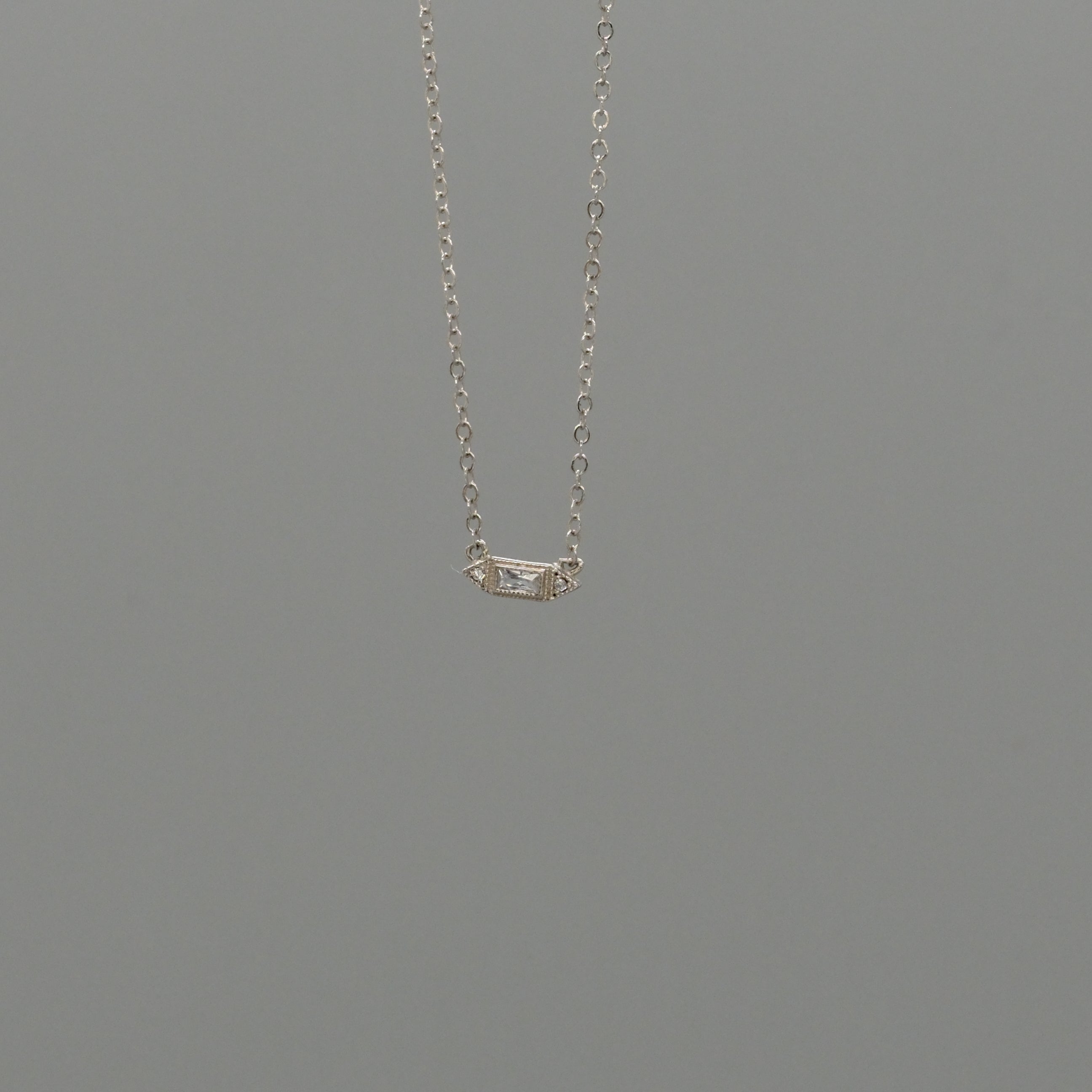 Elevate your everyday look with this delicate sterling silver necklace, featuring a sleek baguette-cut CZ centerpiece. Its minimalist bar design adds a touch of modern elegance, while the sparkling cubic zirconia catches the light beautifully from every angle. Perfect for layering or wearing solo, this 18" necklace offers a refined shimmer that fits effortlessly into any style.