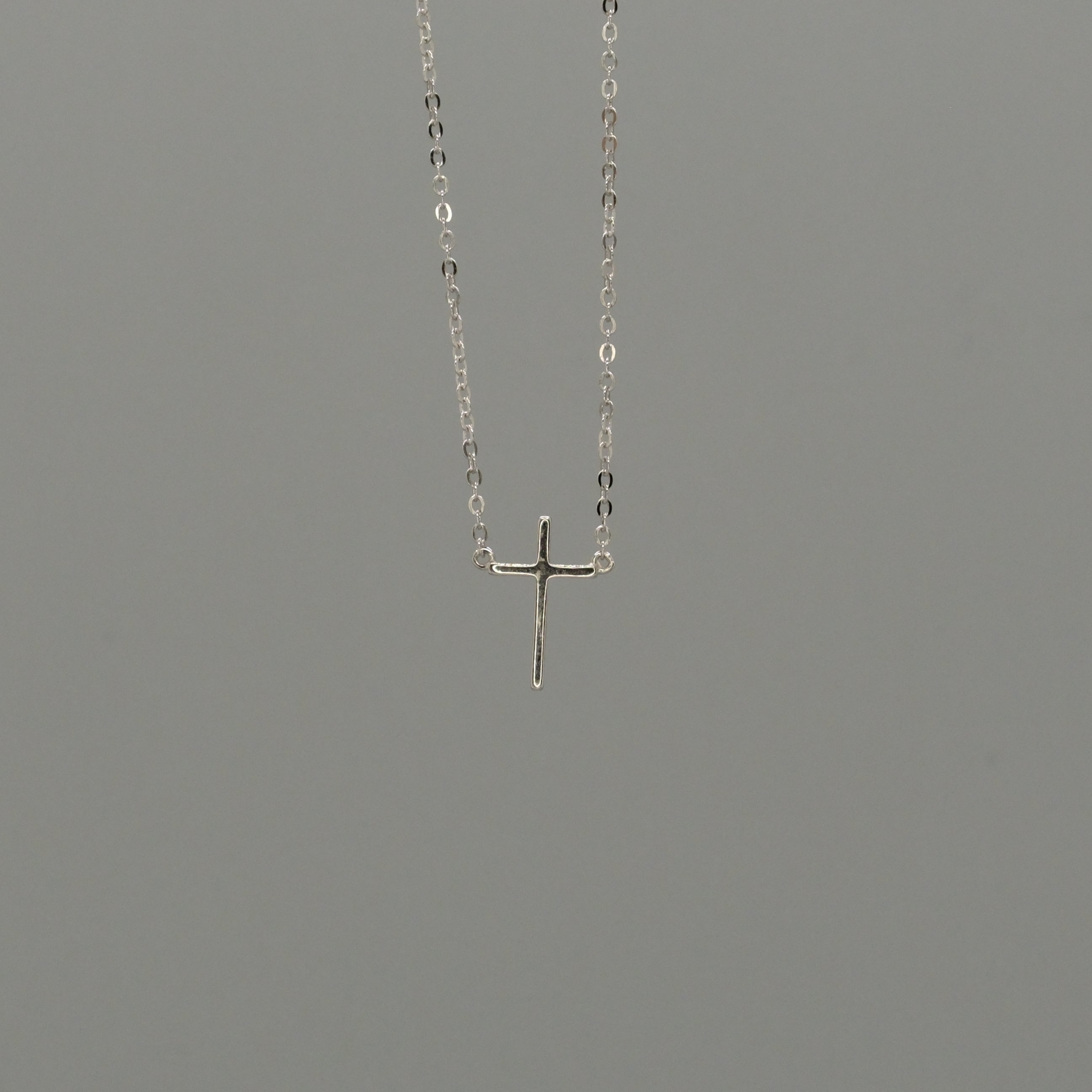 A delicate and timeless symbol of faith, this minimalist cross necklace is crafted in sterling silver and suspended from a fine chain. Its clean, slender design makes it perfect for everyday wear, subtle, elegant, and meaningful. Layer it with your favorite pieces or let it shine on its own as a quiet reminder of hope and strength. An effortless accessory and a heartfelt gift. It is 18" long.